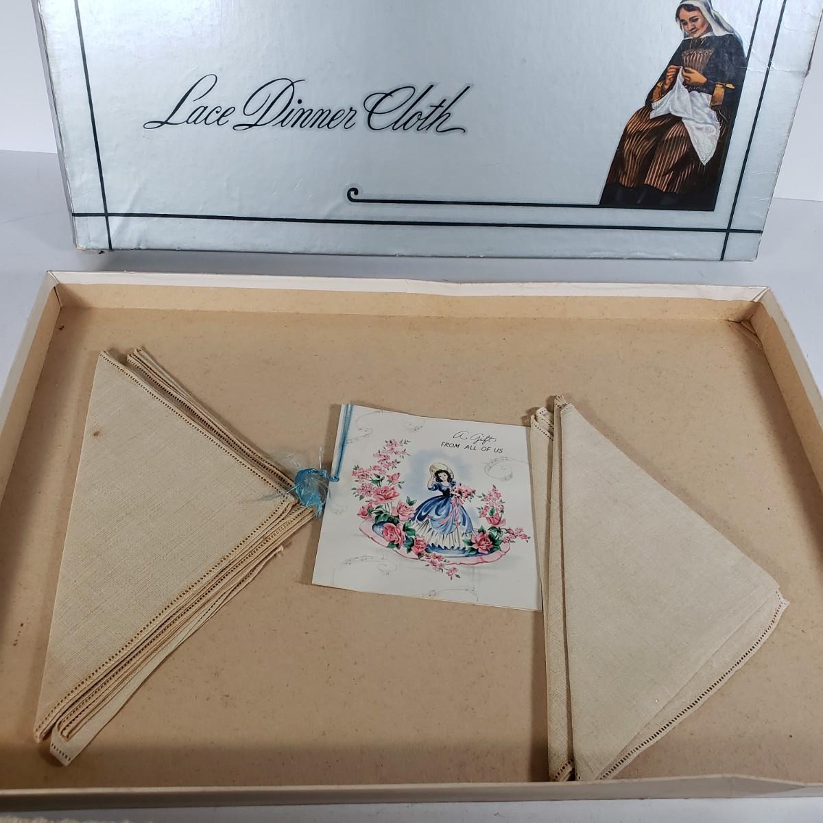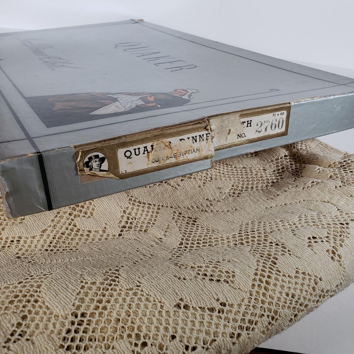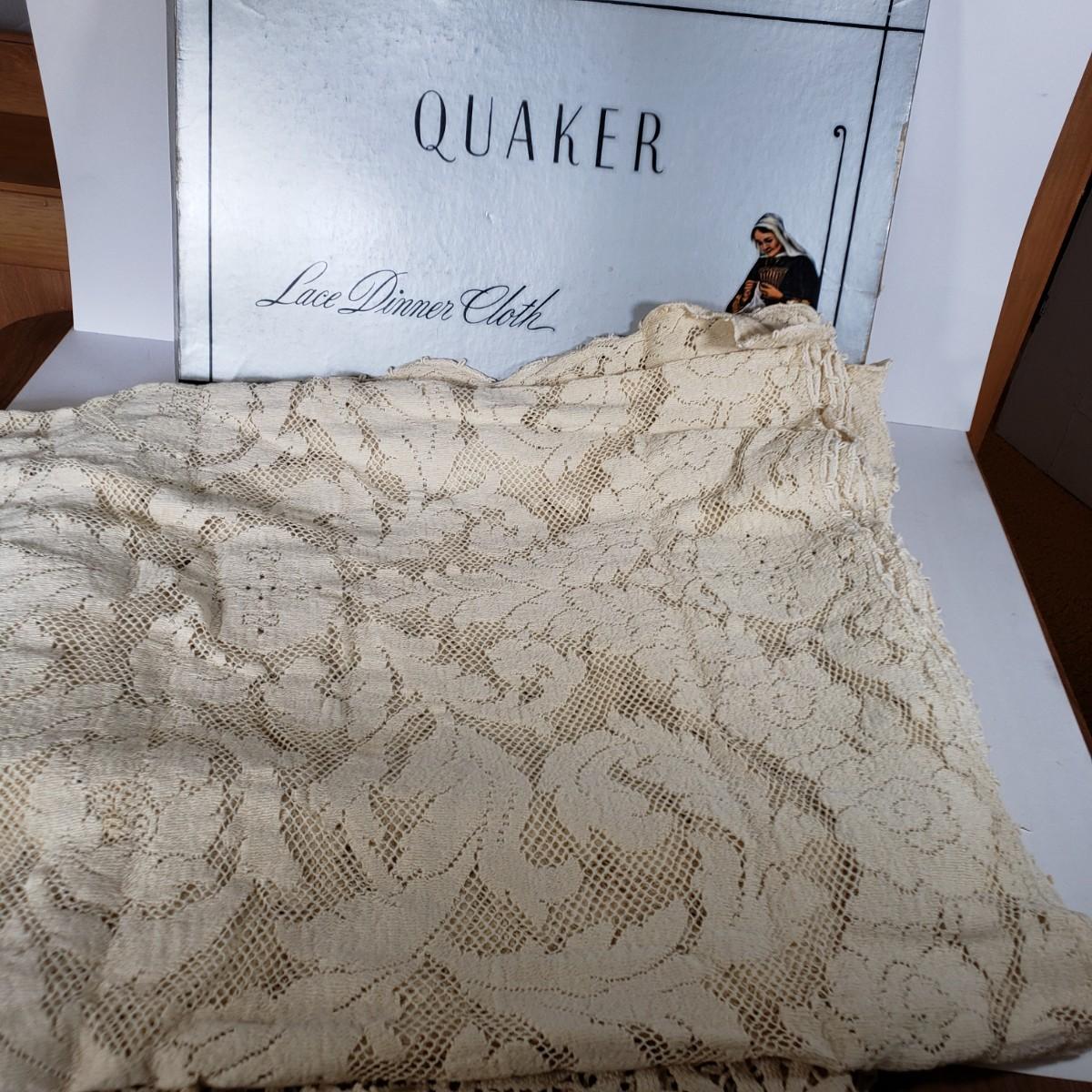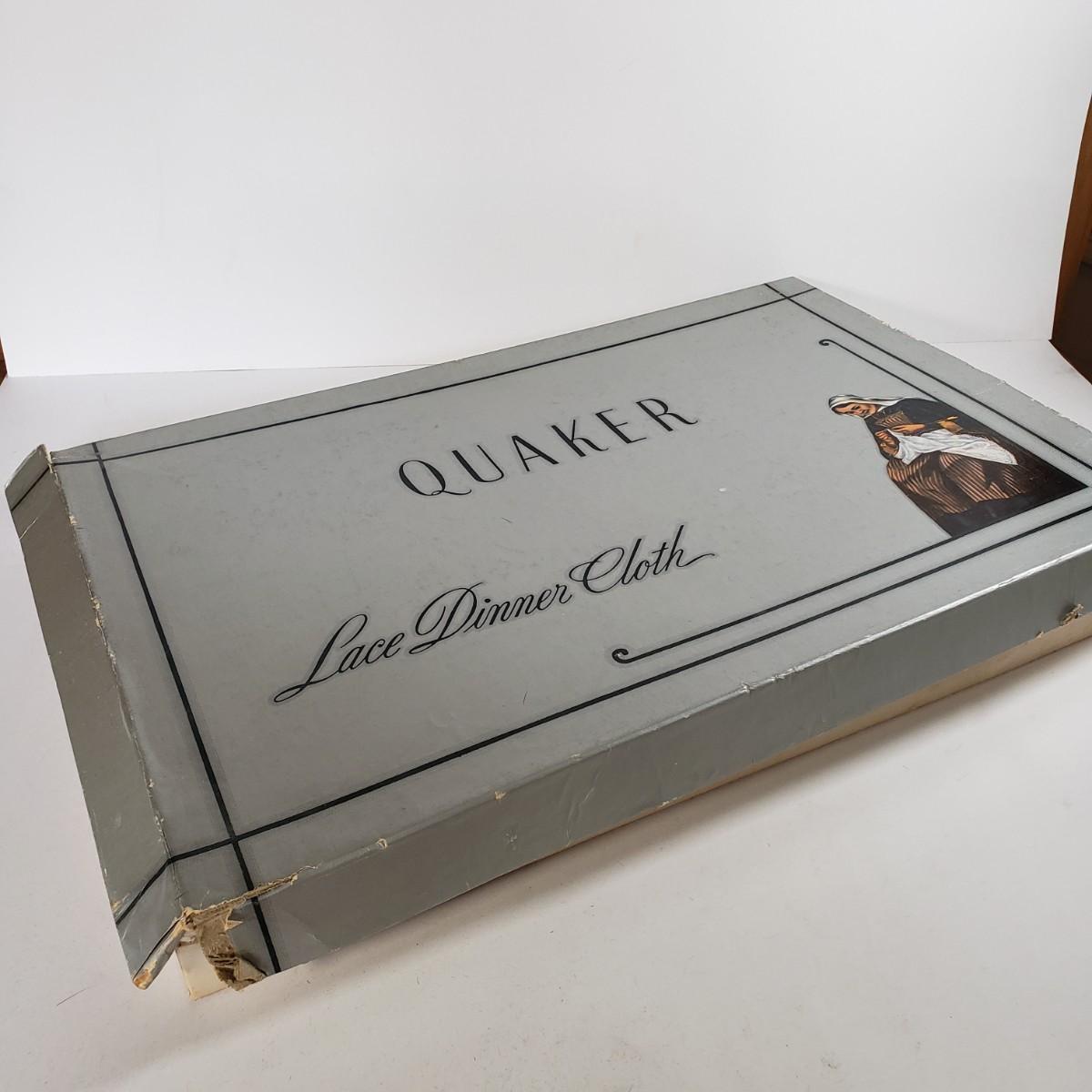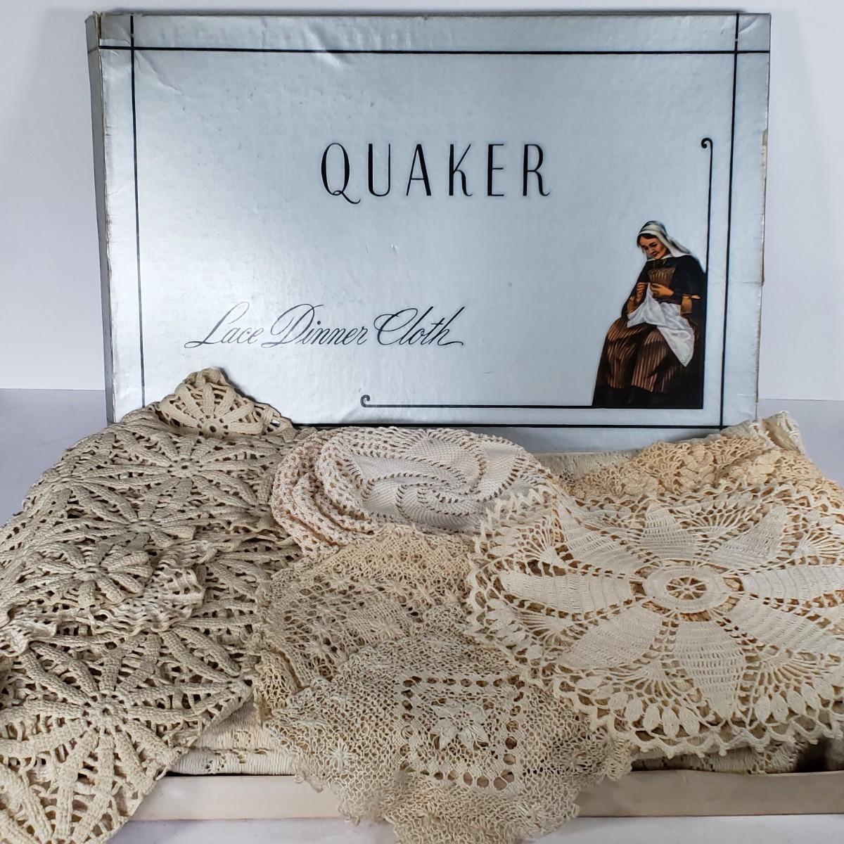 LOT 218L: Antique Quaker Lace Dinner Cloth Tablecloth in Original Box & Doilies
