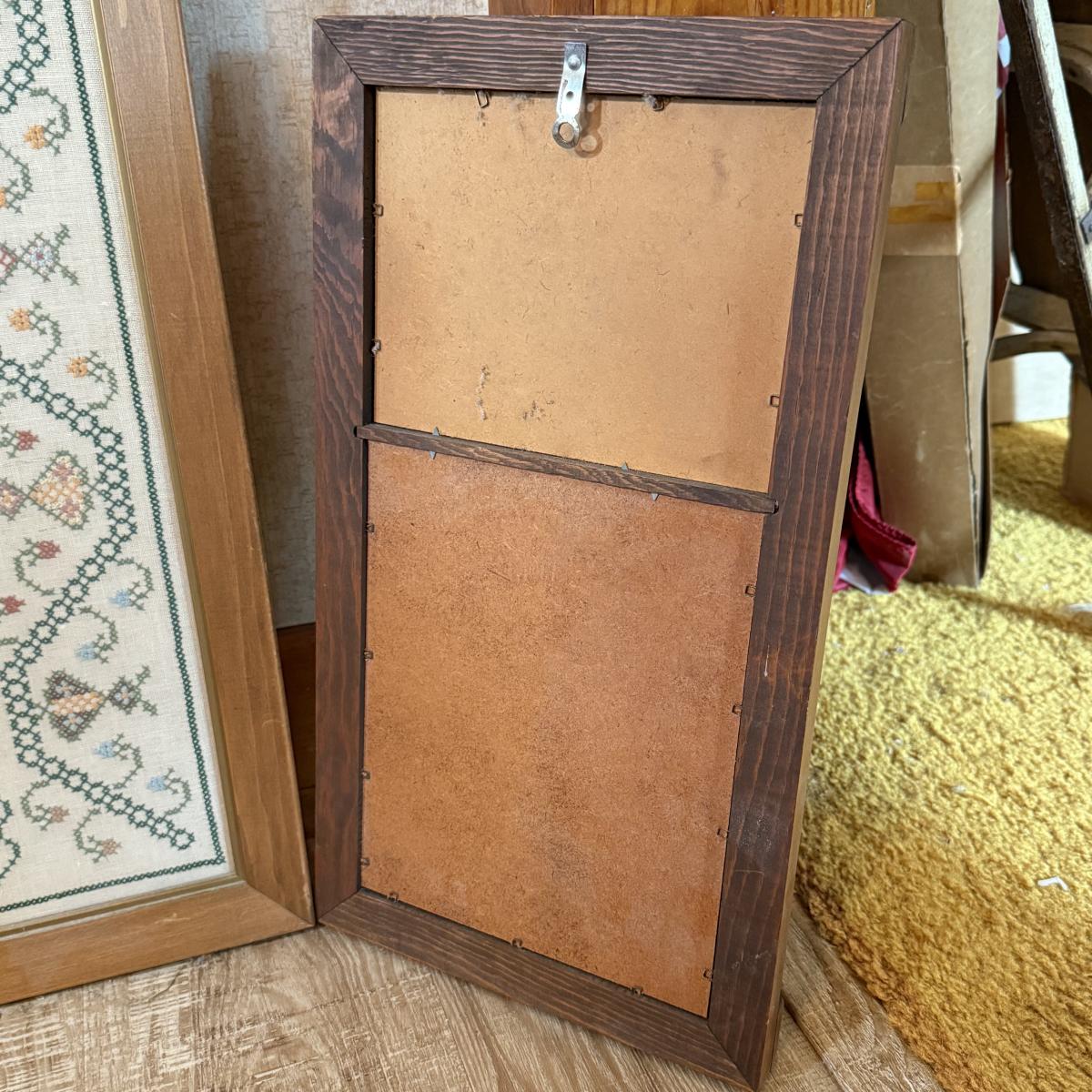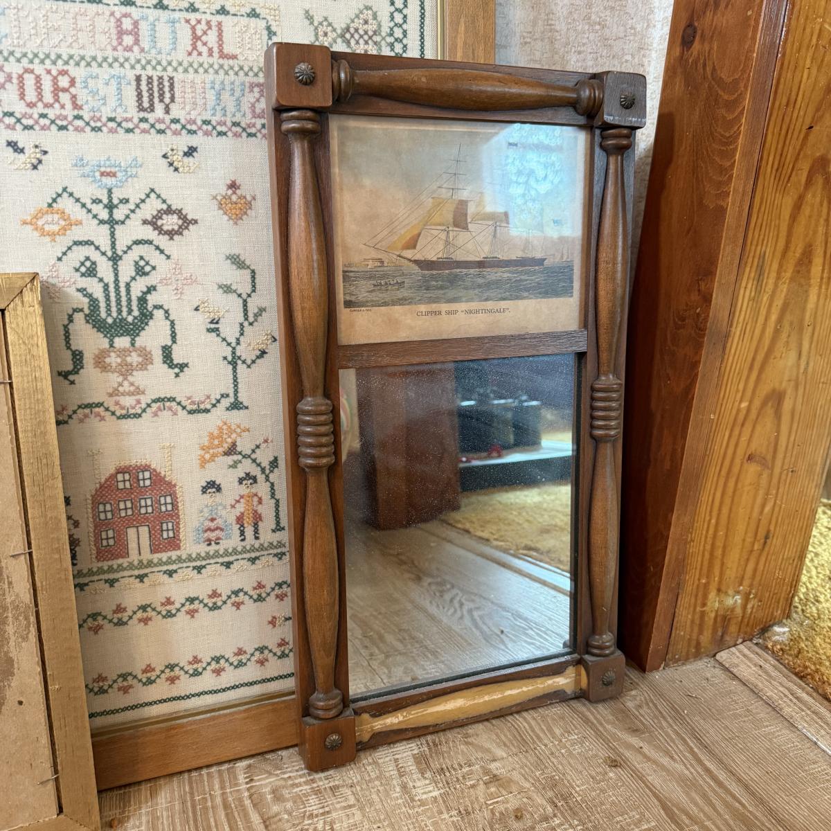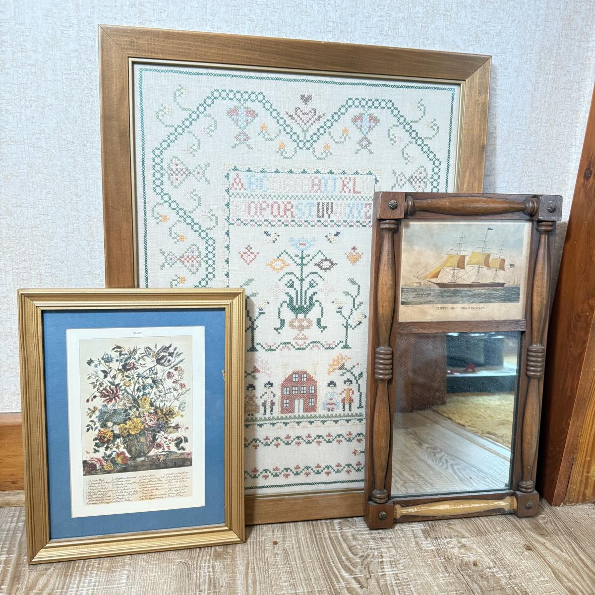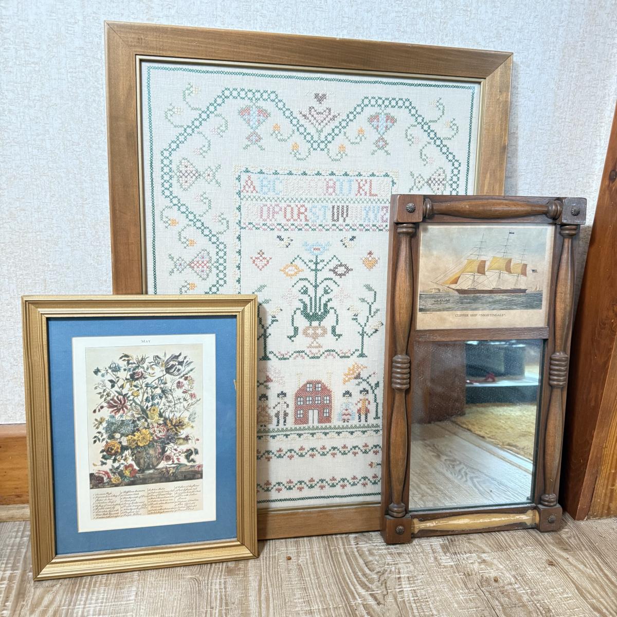 LOT 227X: Vintage Wall Decor: Cross Stitch, Flower Print & Ship Mirror