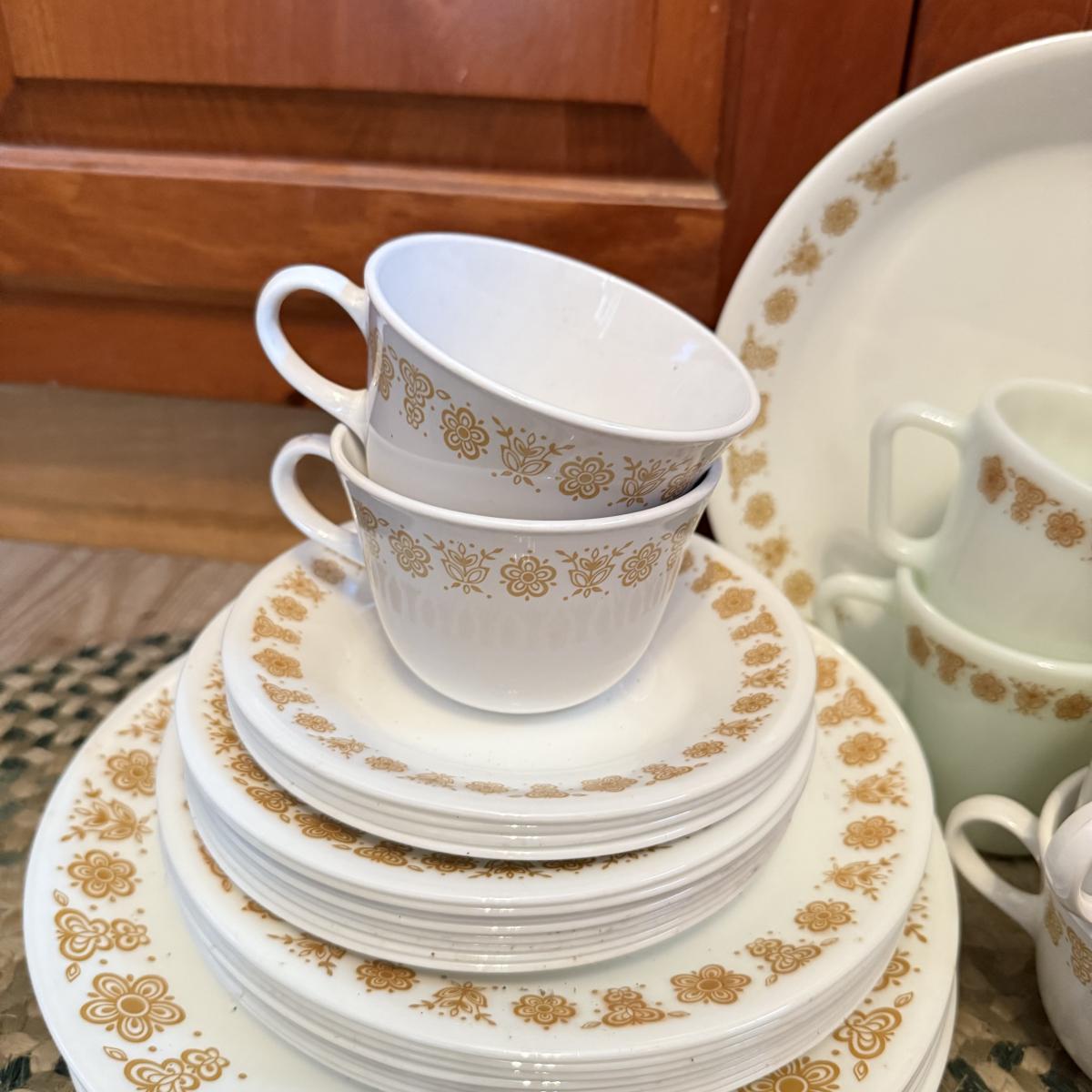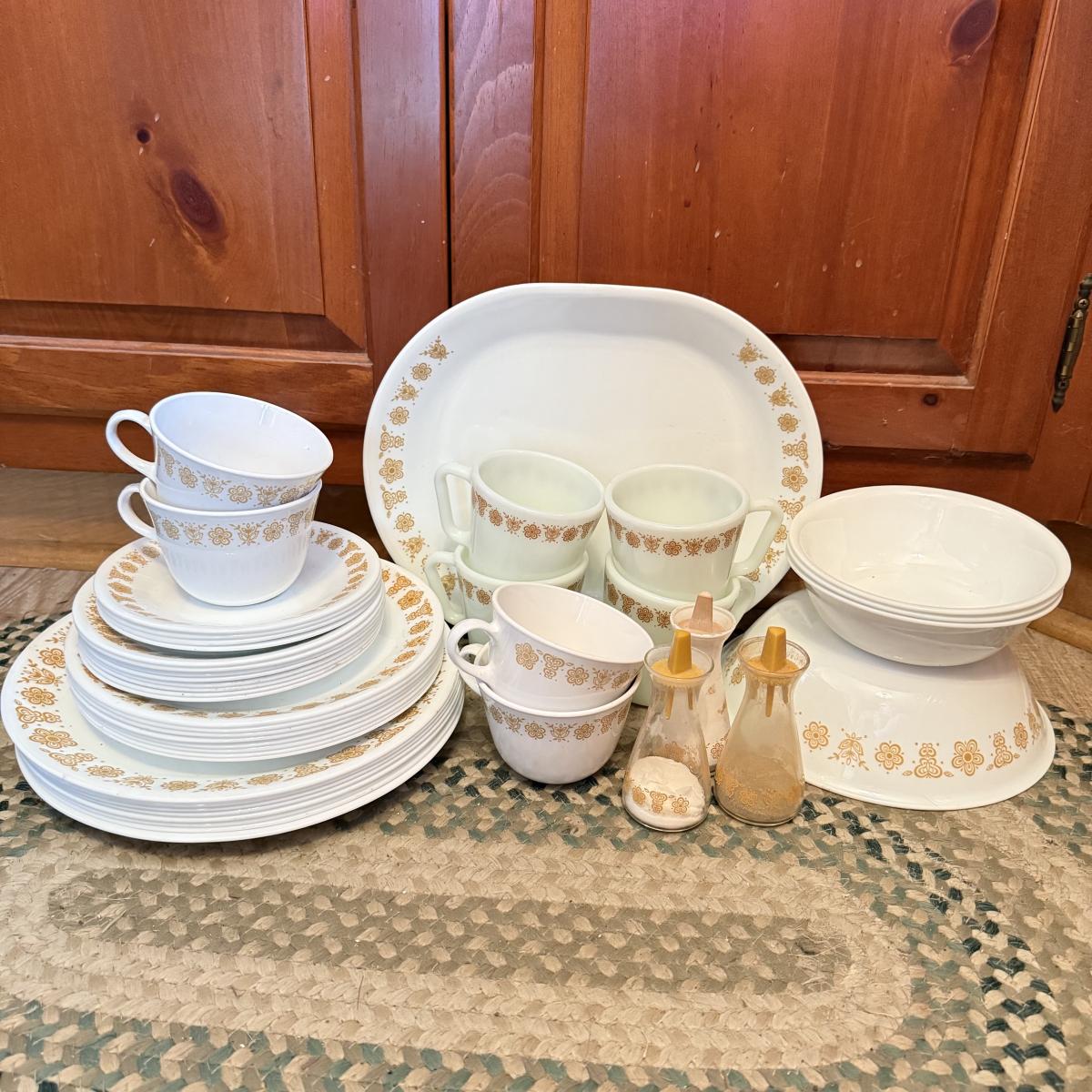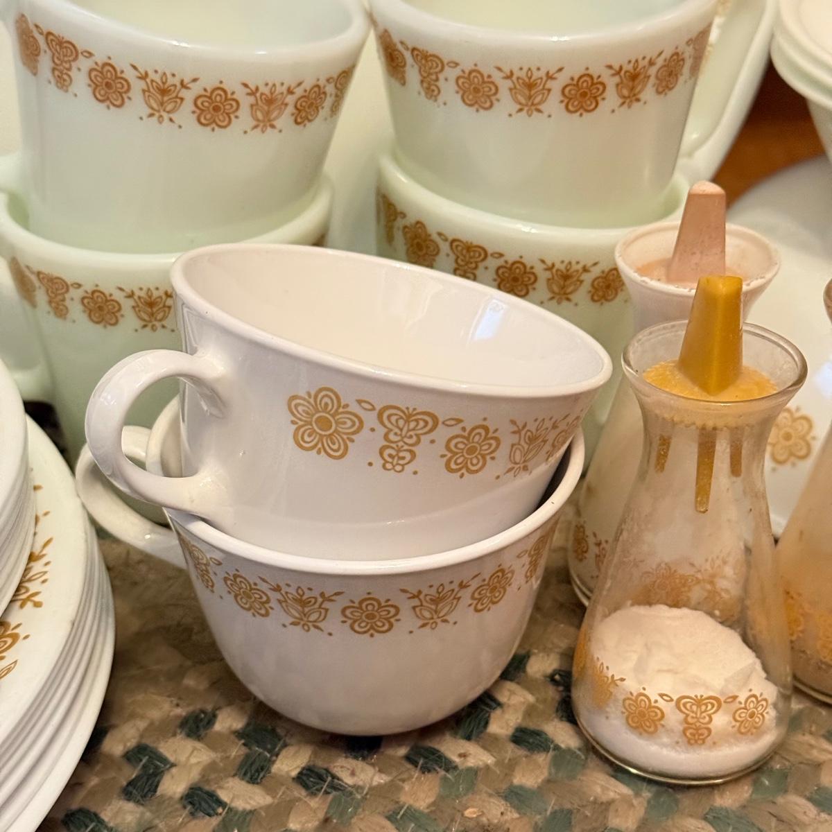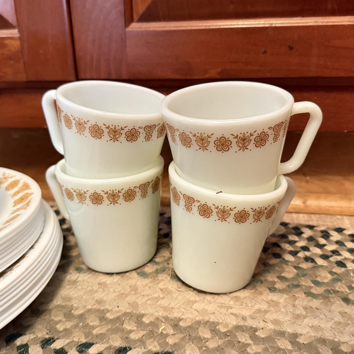 LOT 233K: Vintage Corelle Livingware w/ Matching Pyrex Milk Glass Mugs