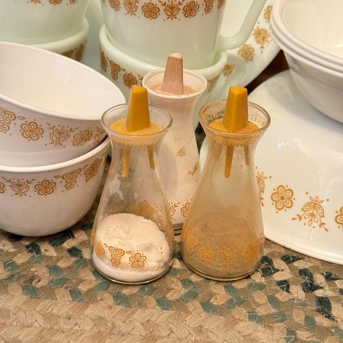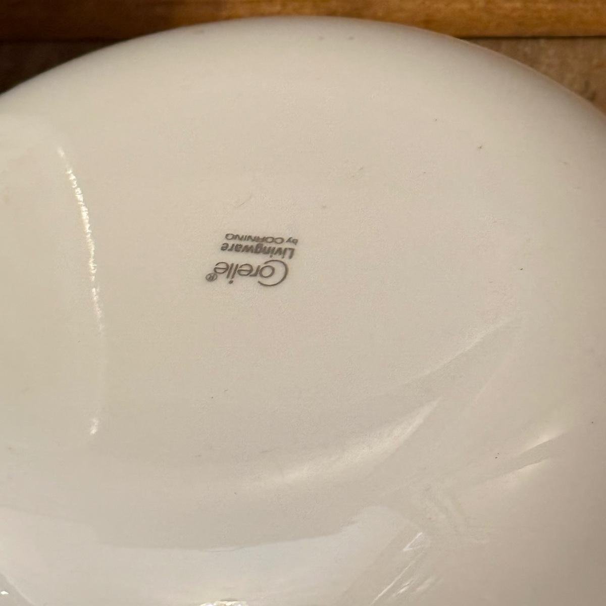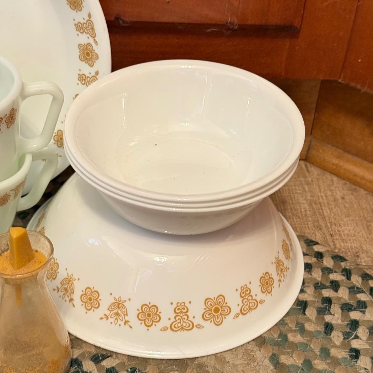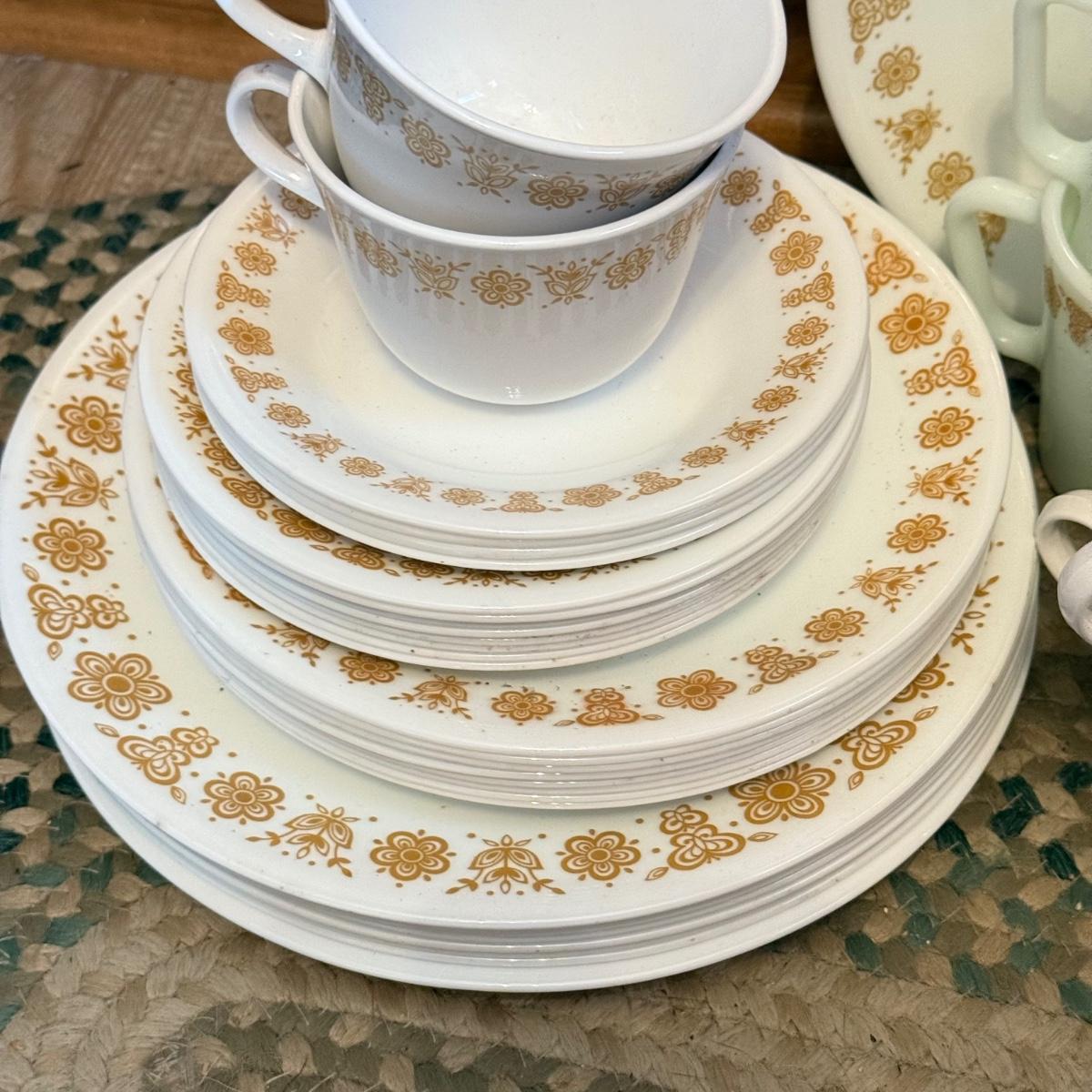LOT 233K: Vintage Corelle Livingware w/ Matching Pyrex Milk Glass Mugs