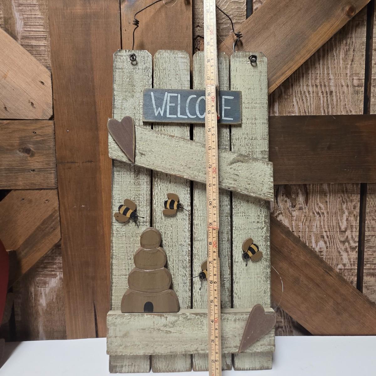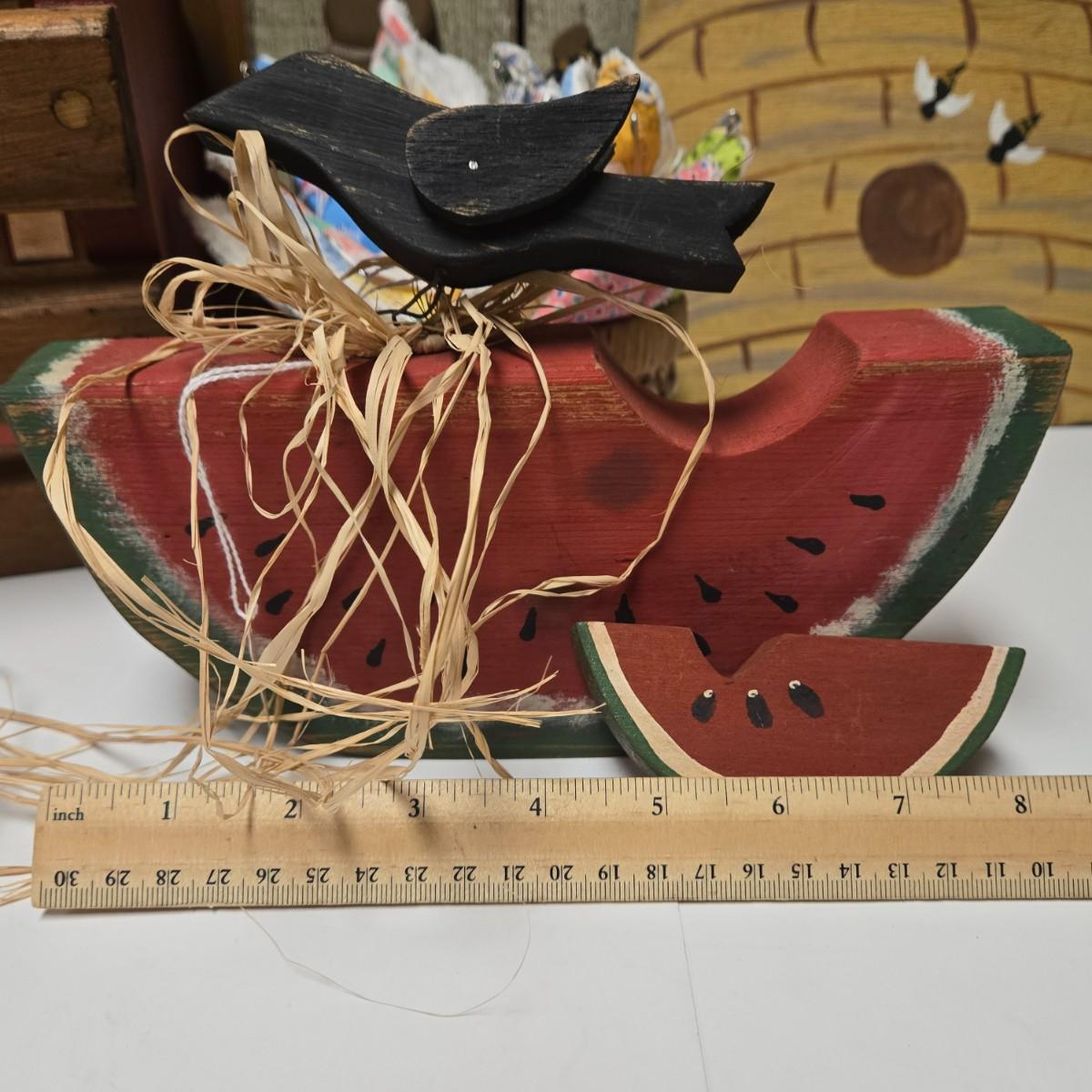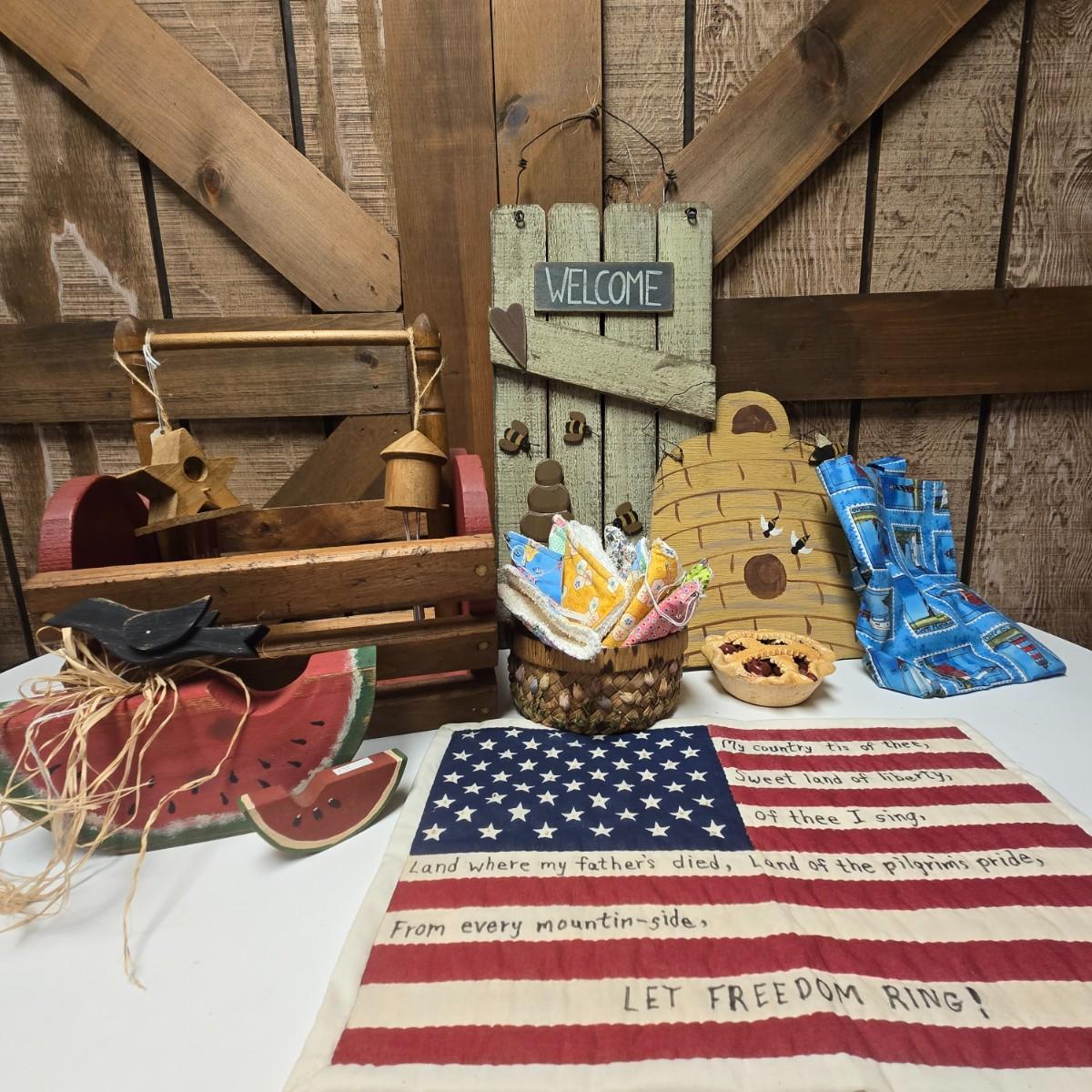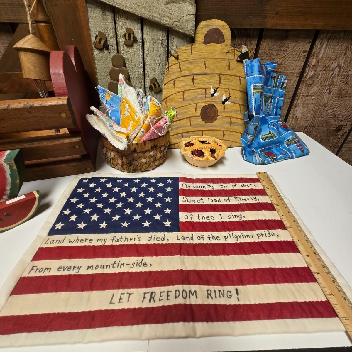 LOT 6S: Summer in the U.S.A./Small American Flag, Wooden Apple Basket, Bee Welcome Sign and Wall Decor, Small Apple Pie, Ice Cream Cone Holders, Watermelon Slices. and More