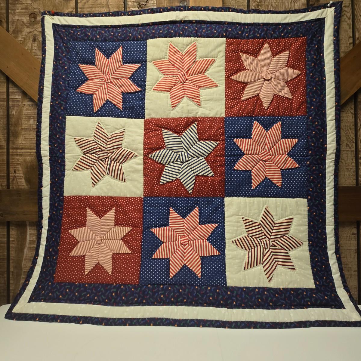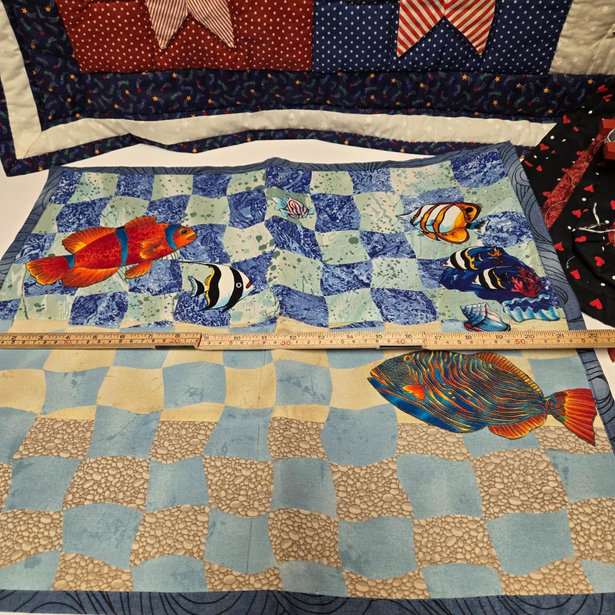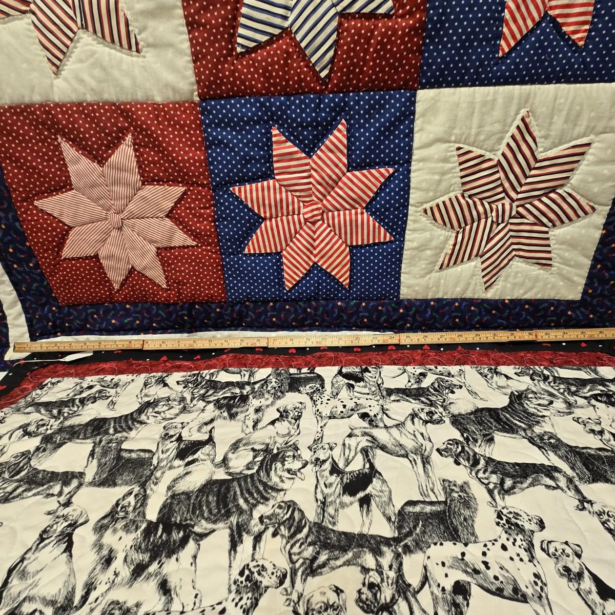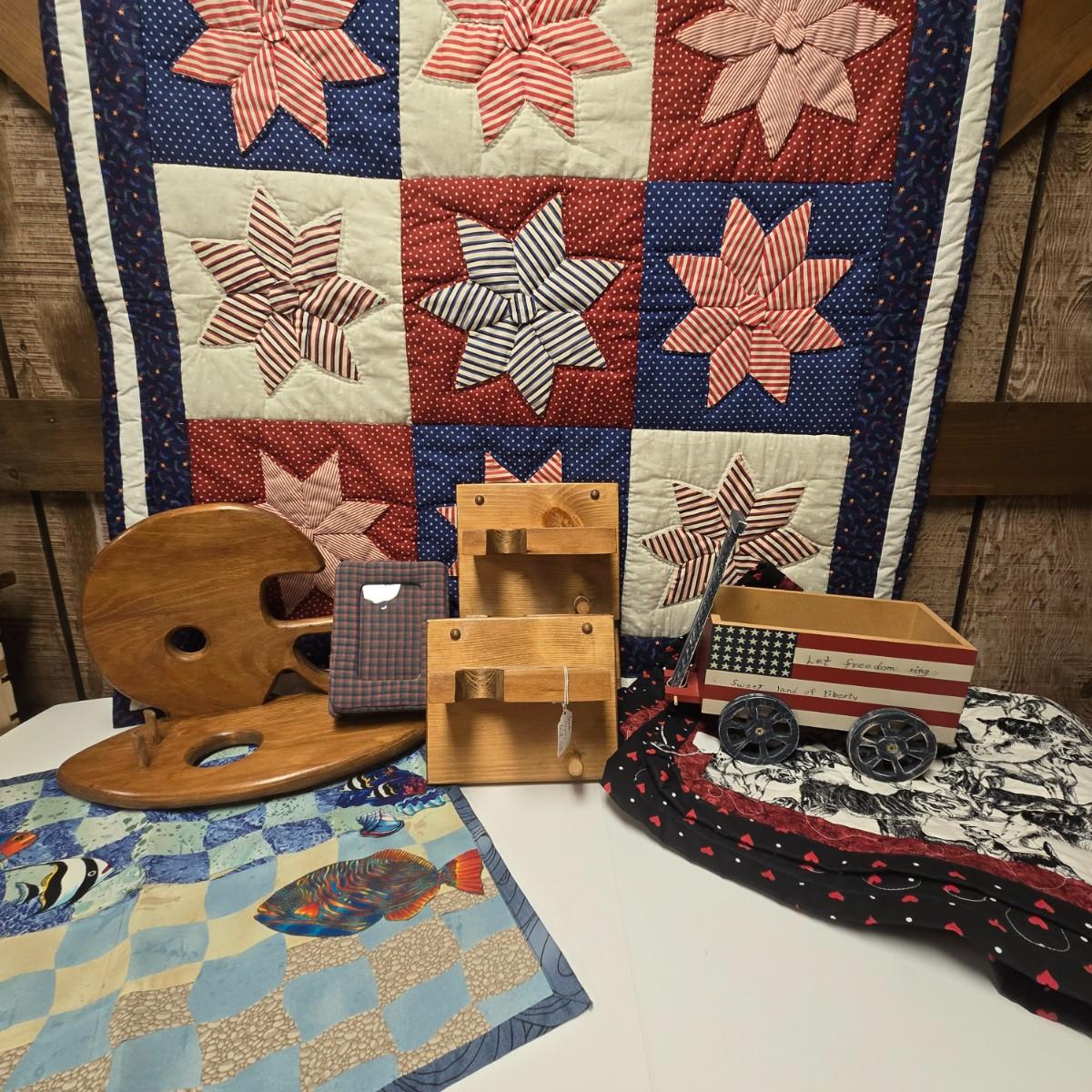 LOT 8S: Boys' Bedroom/Man Cave Decor Including Wooden Football & Baseball/Bat Display Wall Hangings, Patriotic and Dog Quilts, Photo Album and More