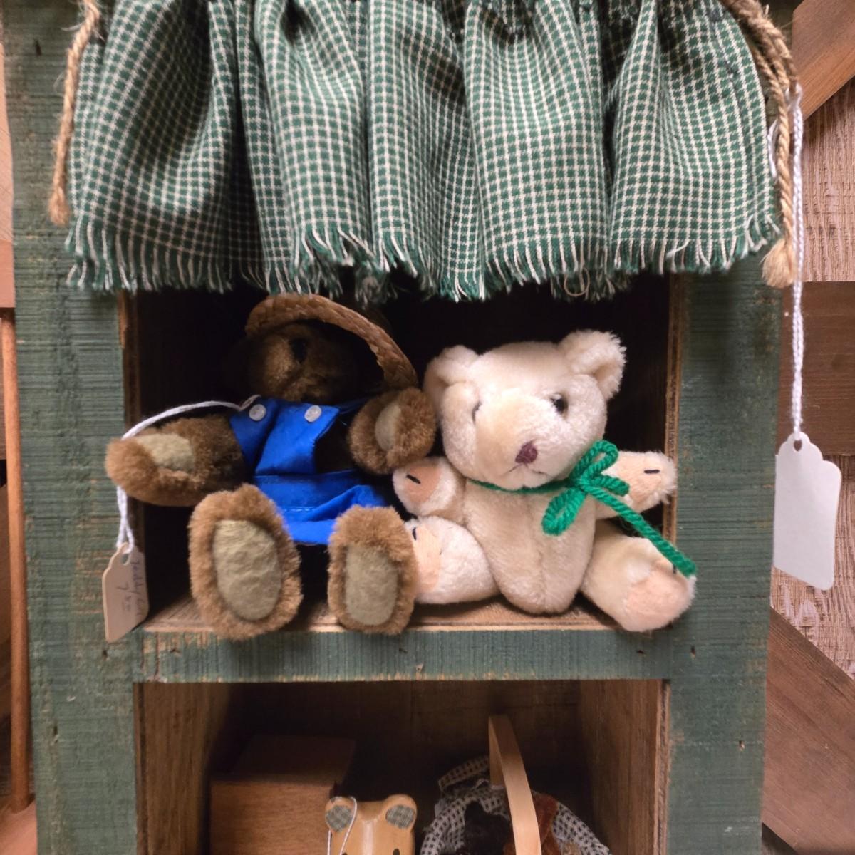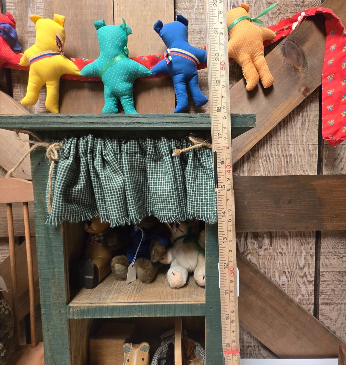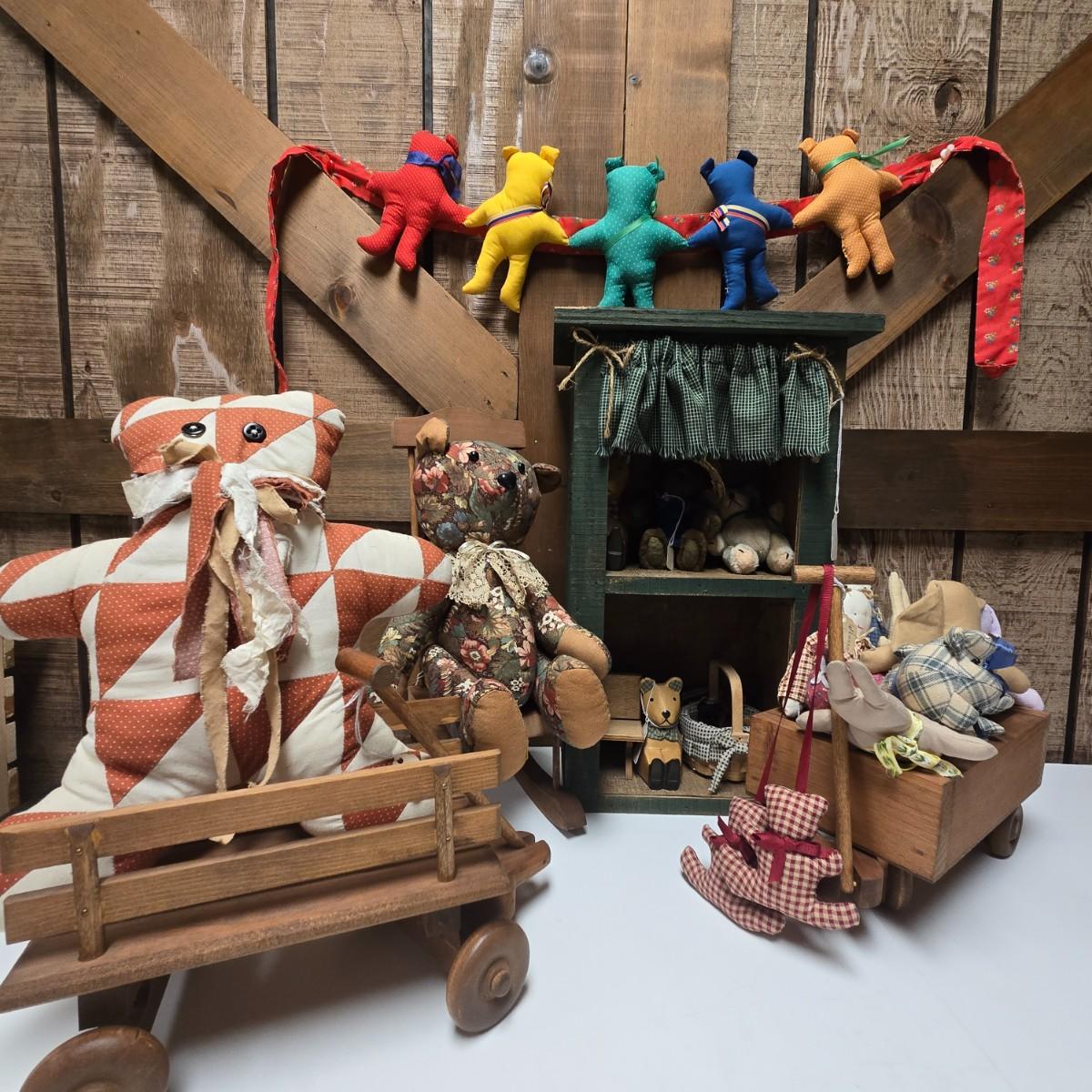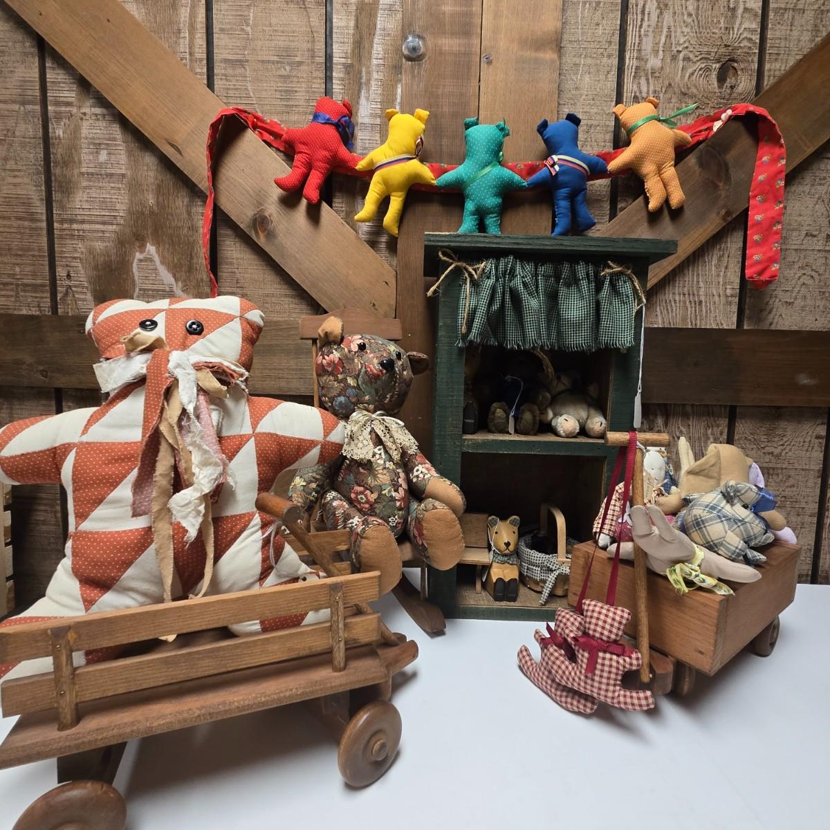 LOT 12S: Small Wooden Shelf, Two Wagons, Small Rocking Chair, and Bears, Bears, And More Bears