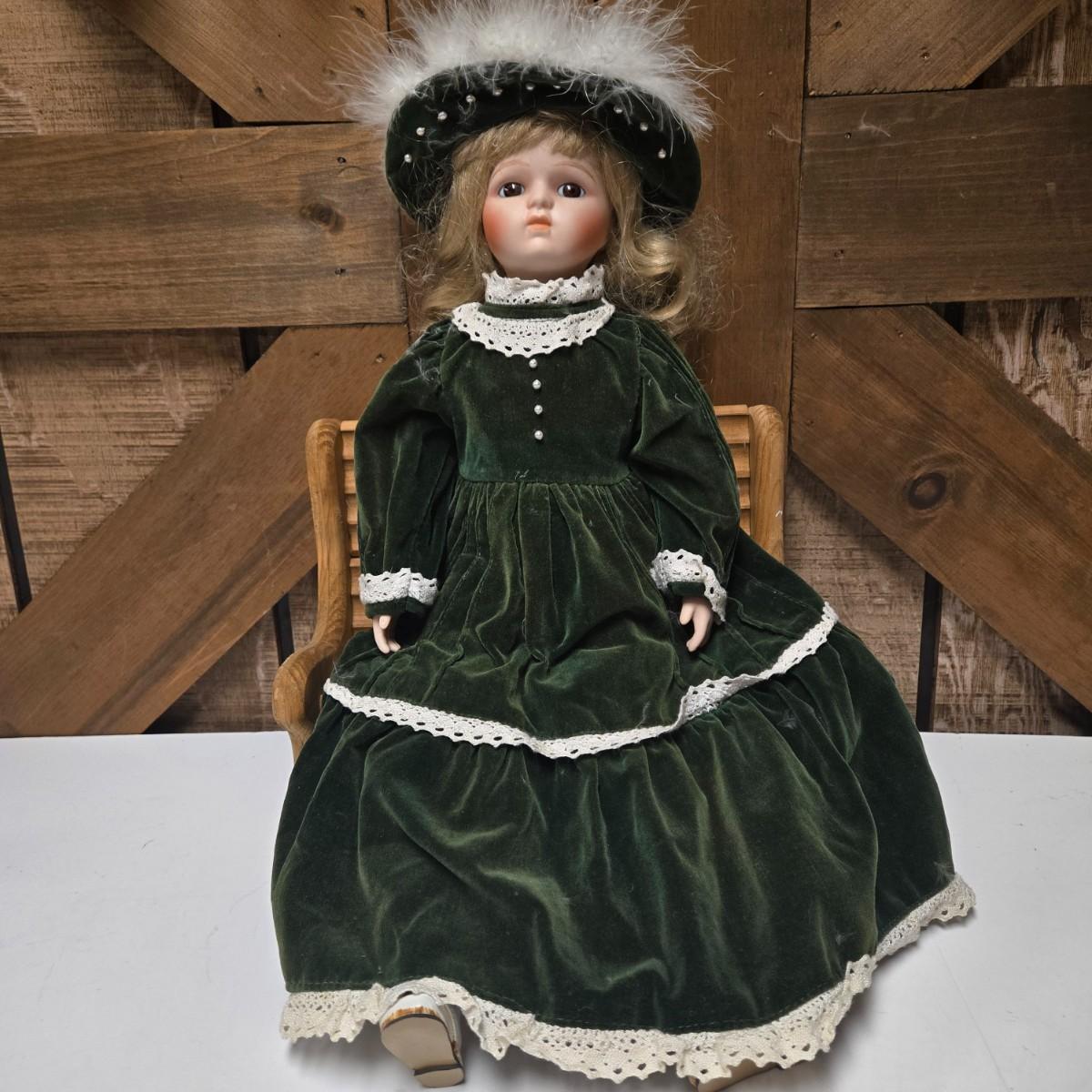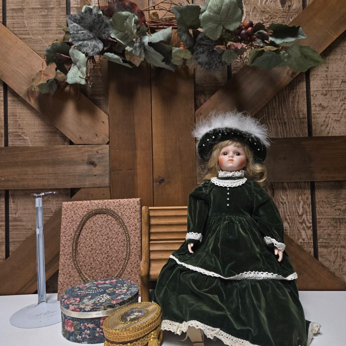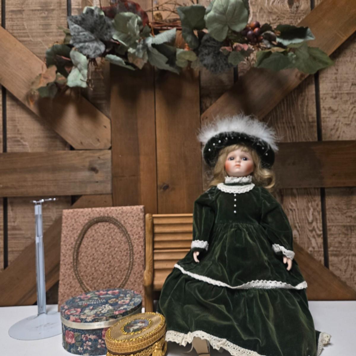 LOT 13S: Victoria Ashlea Doll with Stand, Wooden Doll Bench, Fabric Picture Frame, and More