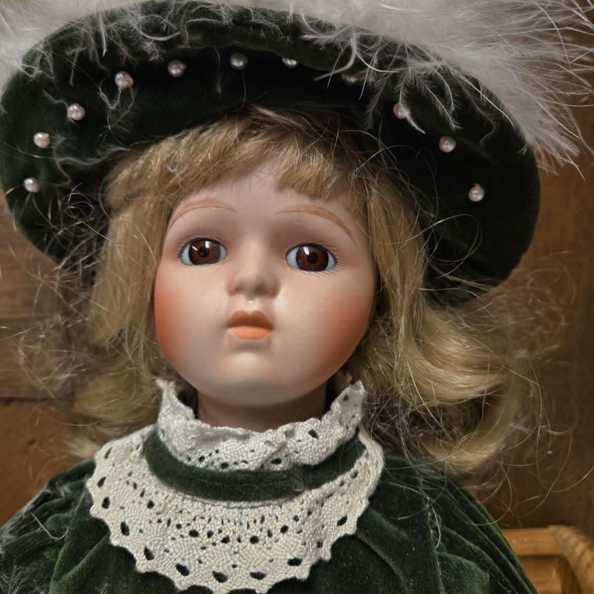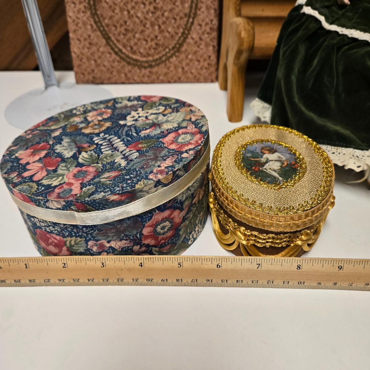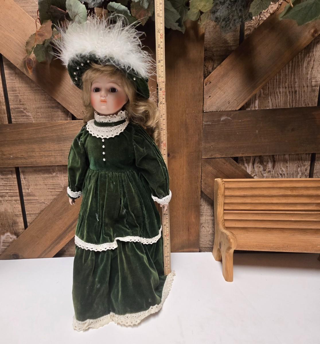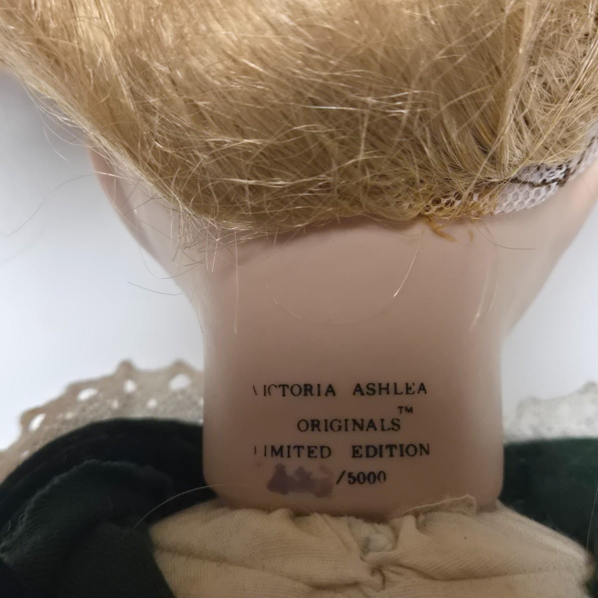 LOT 13S: Victoria Ashlea Doll with Stand, Wooden Doll Bench, Fabric Picture Frame, and More