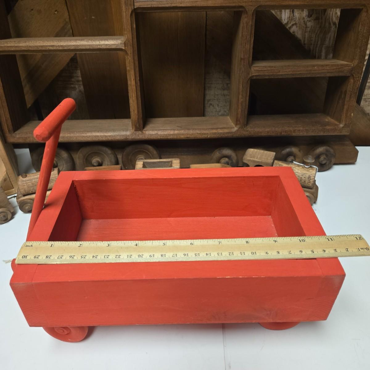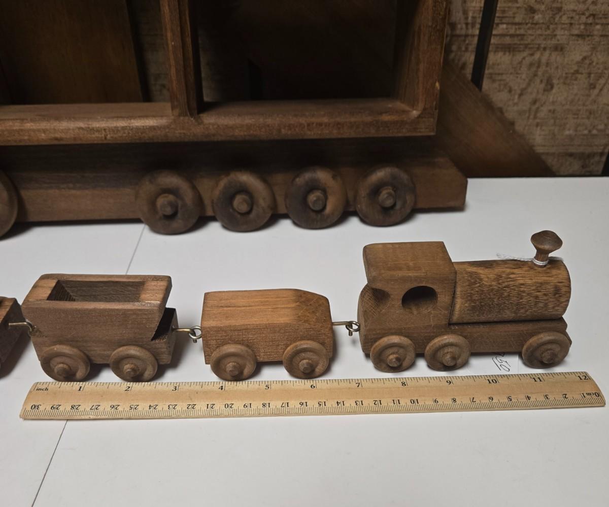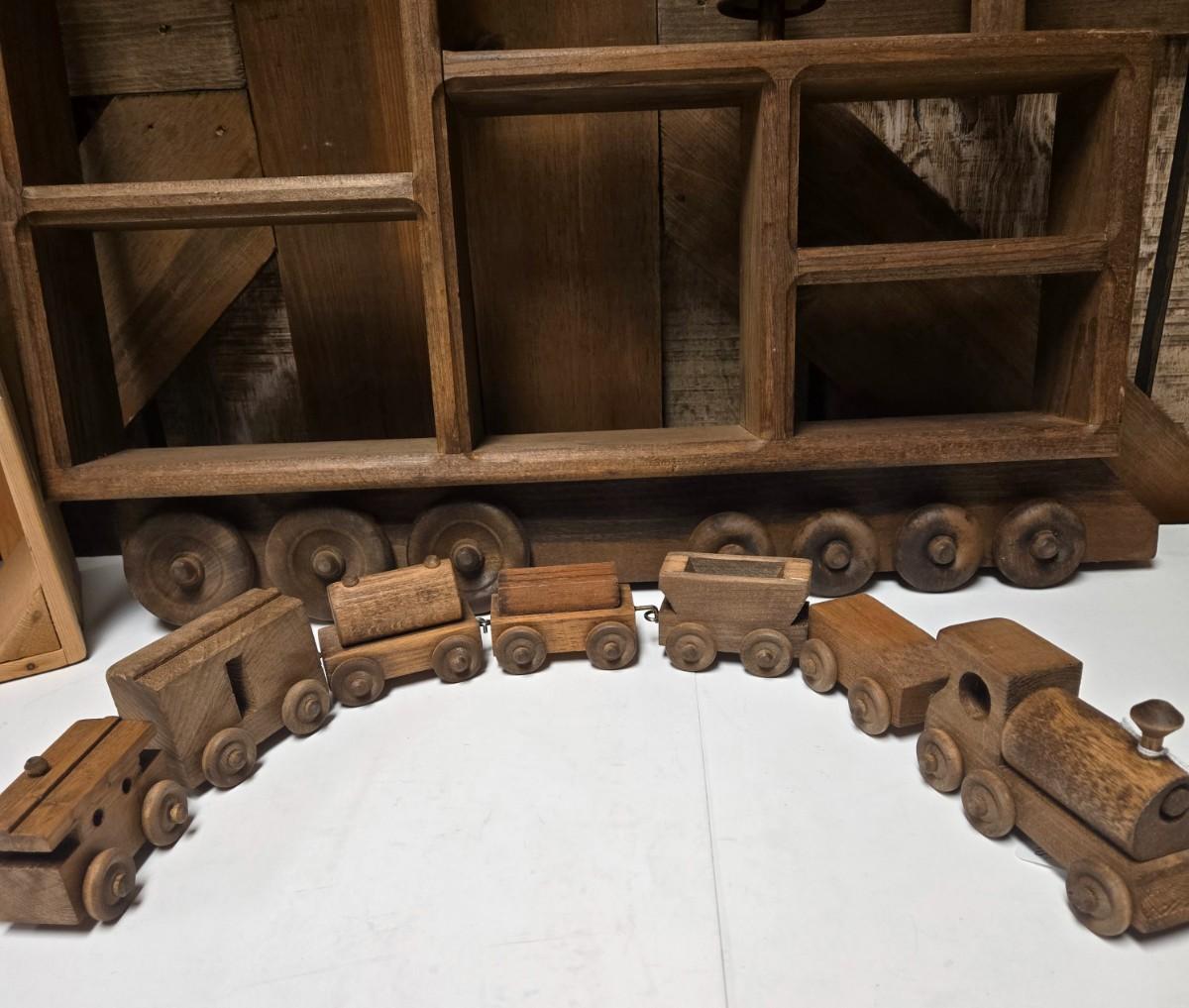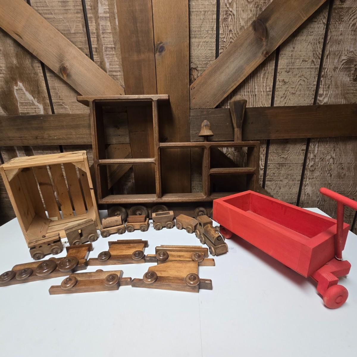 LOT 16S: Train Wall Shelf, Wooden Train Toys, Small Wagon, and More