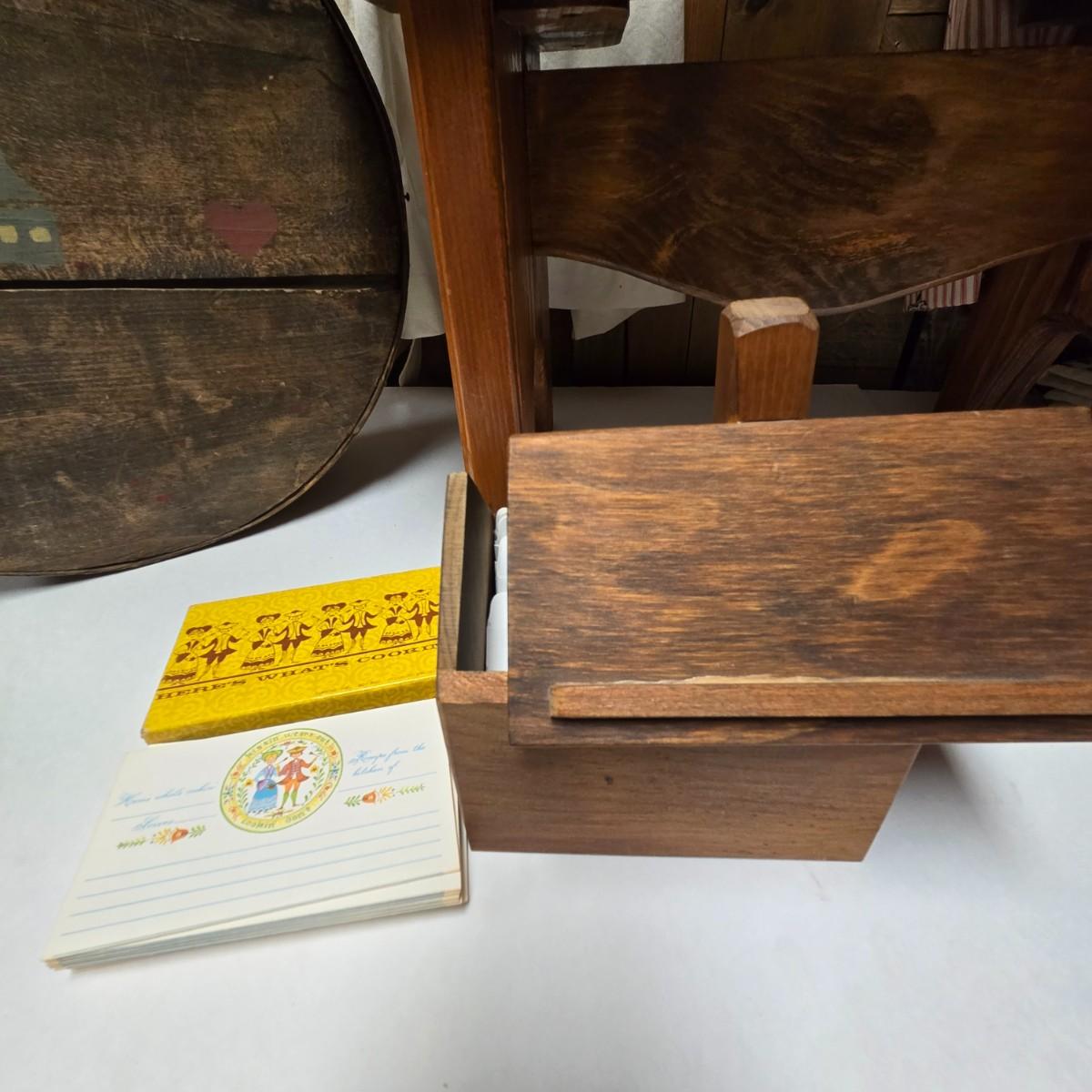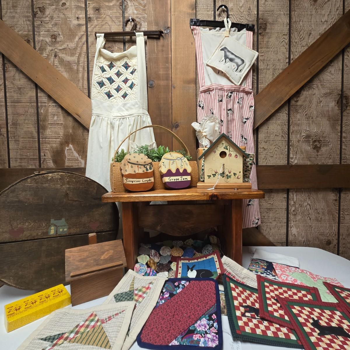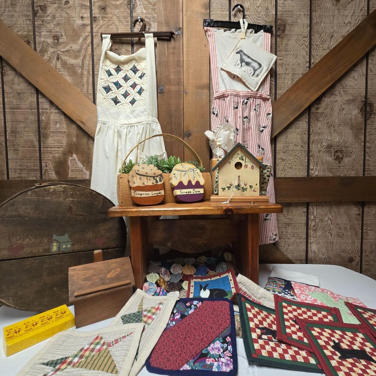 LOT 30S: Country Kitchen Decor and Accessories Including Step Stool, Two Aprons, Trivets, Recipe Box with Cards, Table Runner, and More