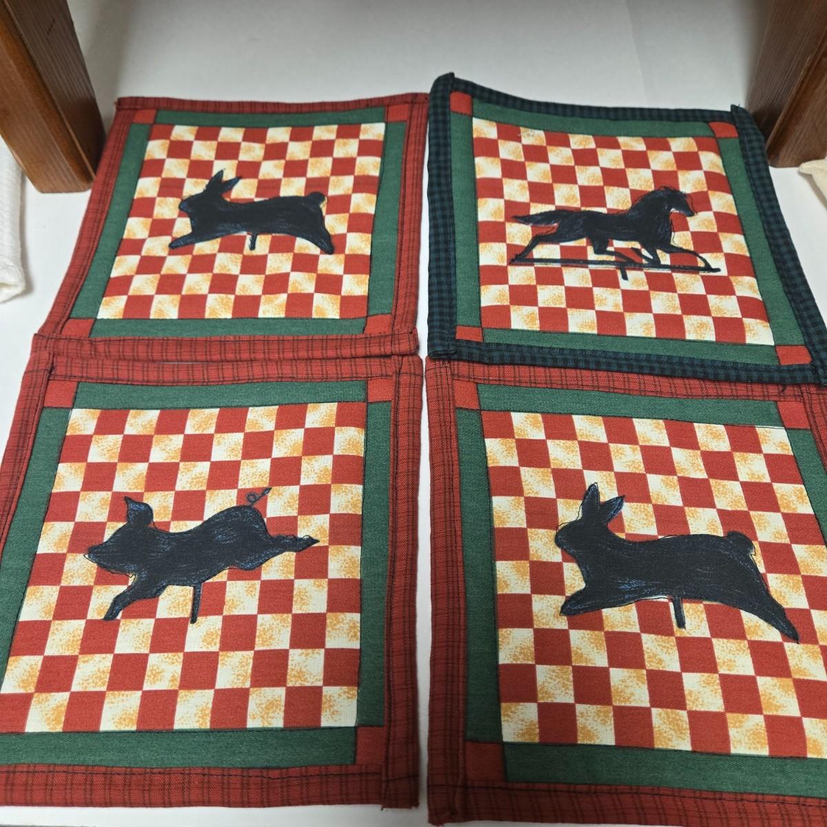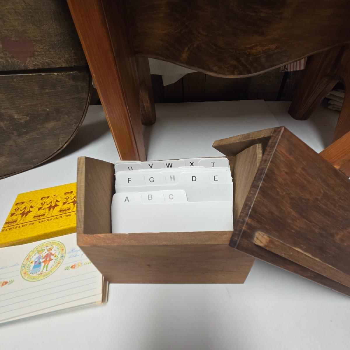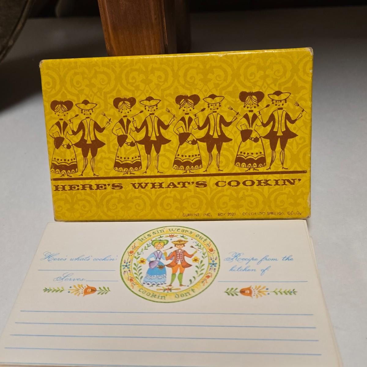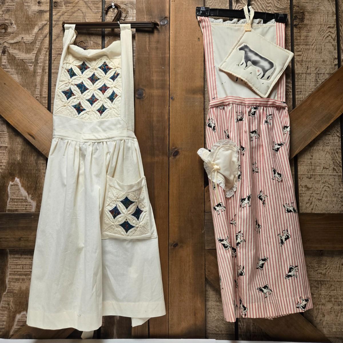 LOT 30S: Country Kitchen Decor and Accessories Including Step Stool, Two Aprons, Trivets, Recipe Box with Cards, Table Runner, and More