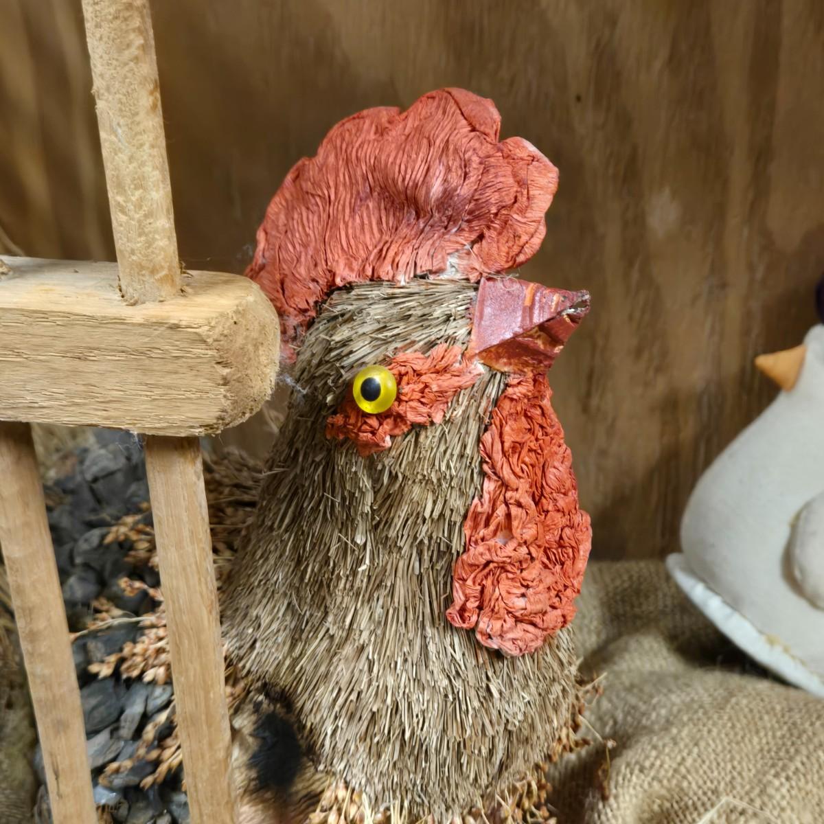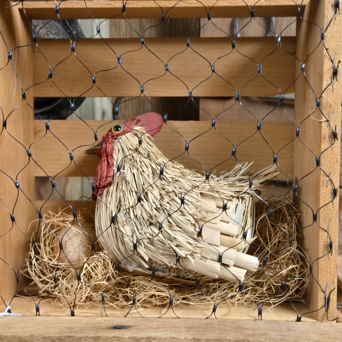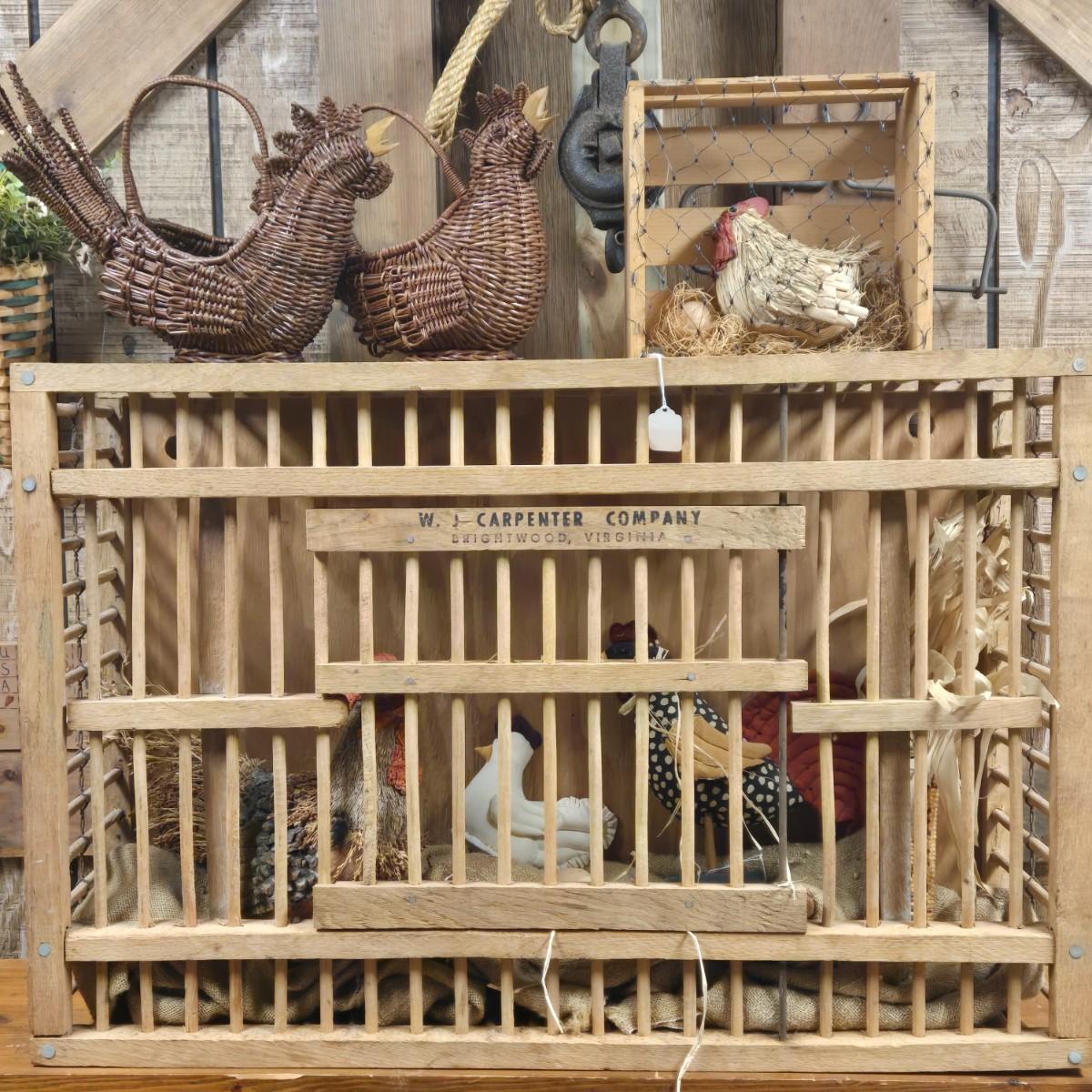 LOT 32S: Chicken Coop with Chickens and Eggs, Wicker Chicken Baskets, and Wall Hanging