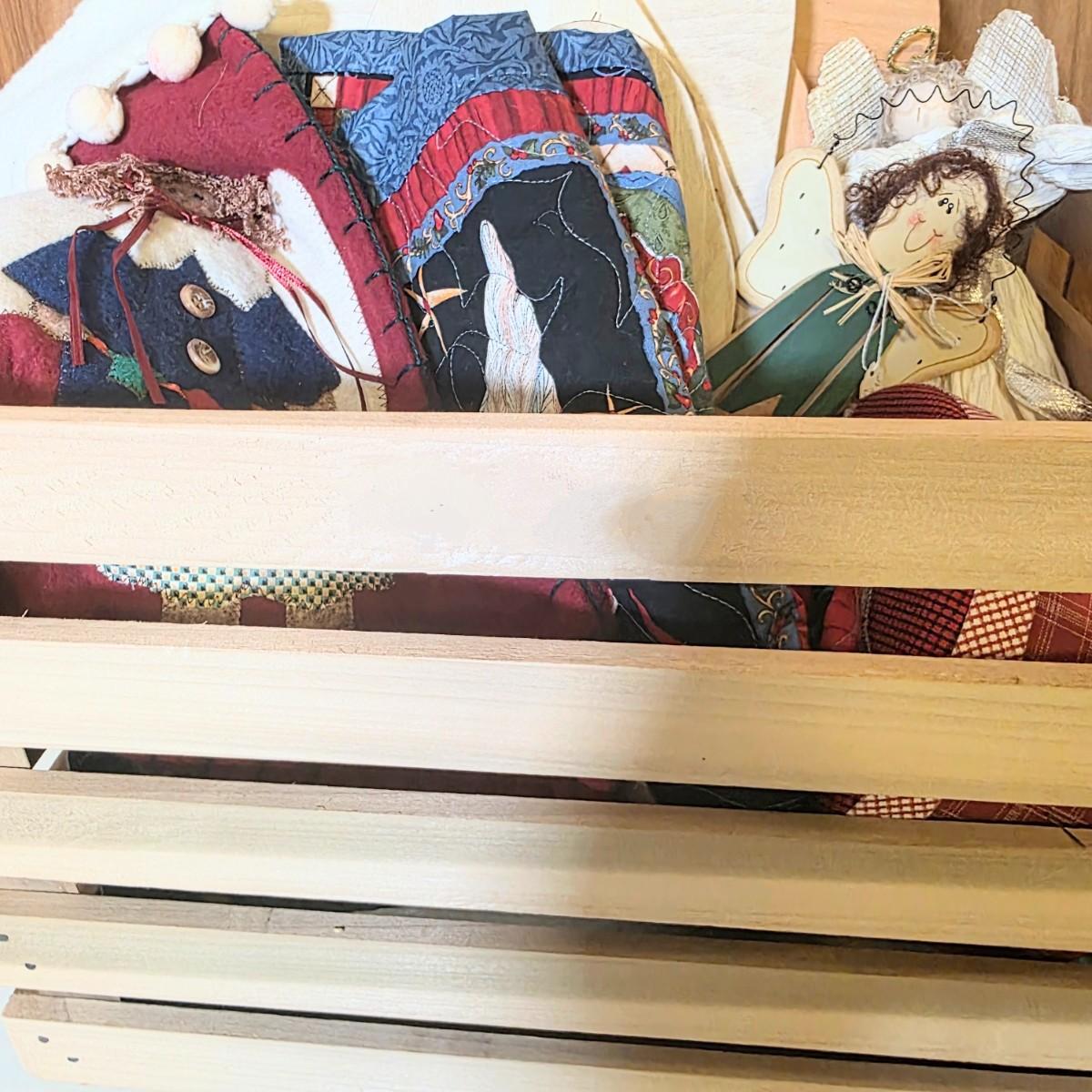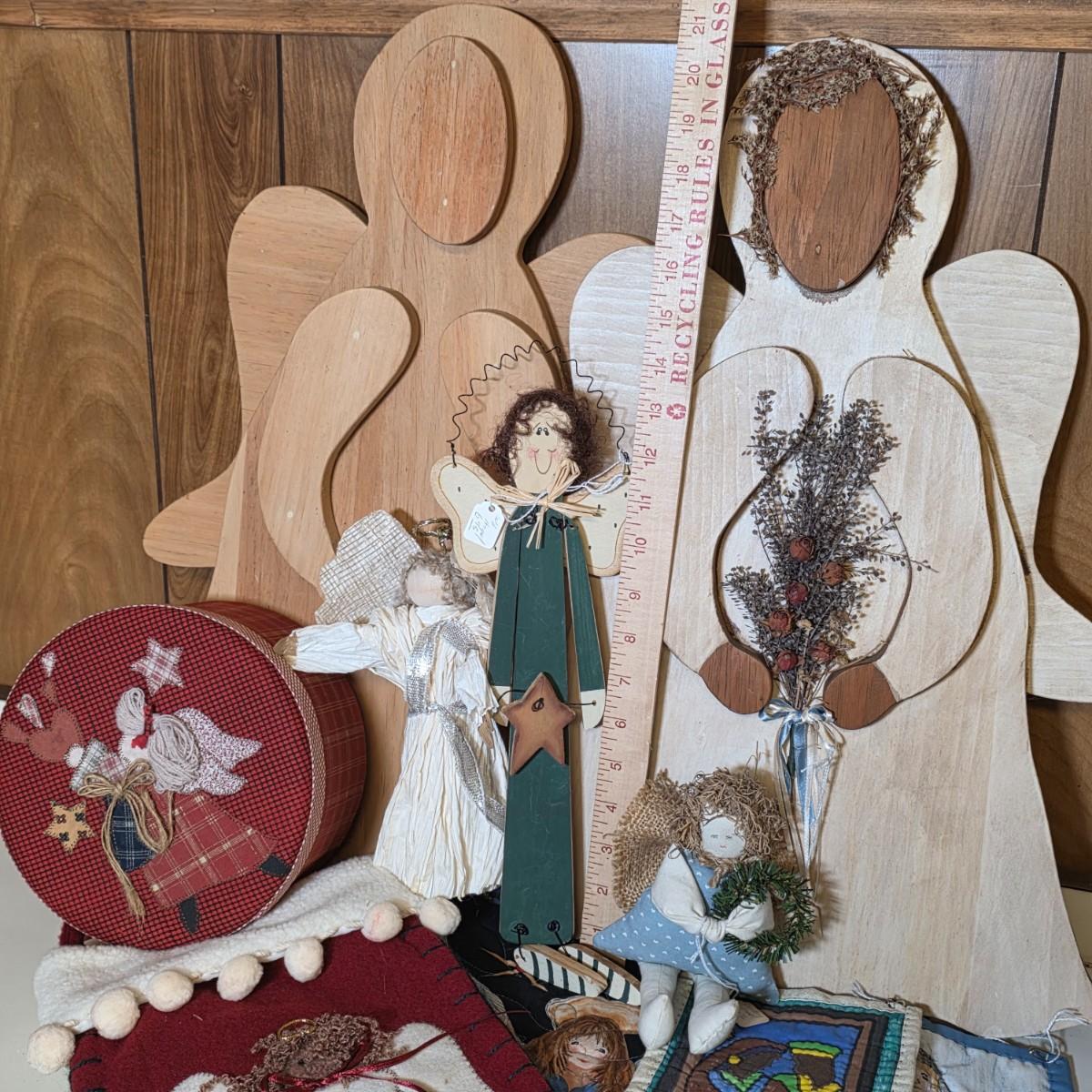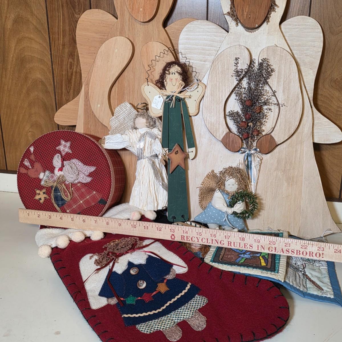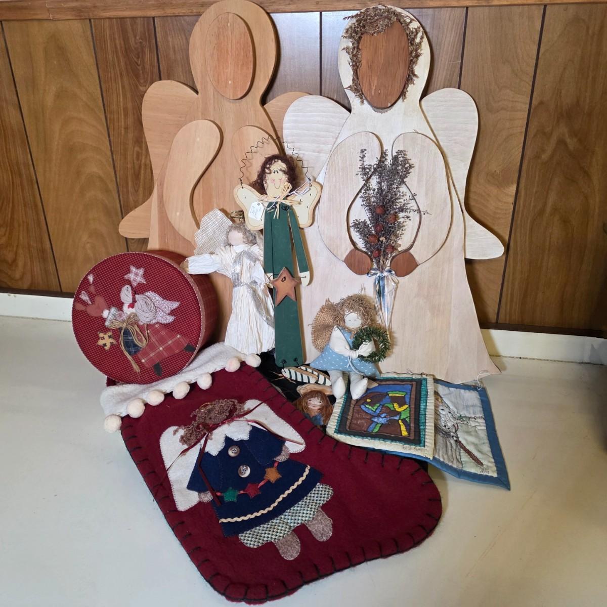LOT 103S: Darling Finished Angel & One Ready To Finish Your Way, Along W/Smaller Angels, Stocking, Trivets & Decorative Box In A Crate