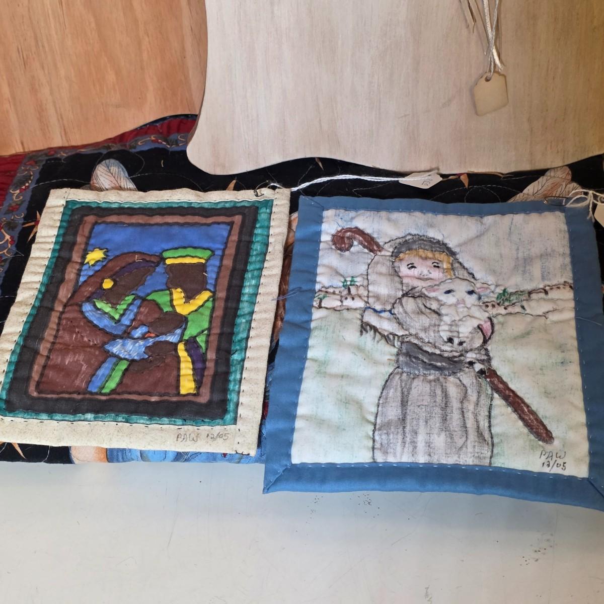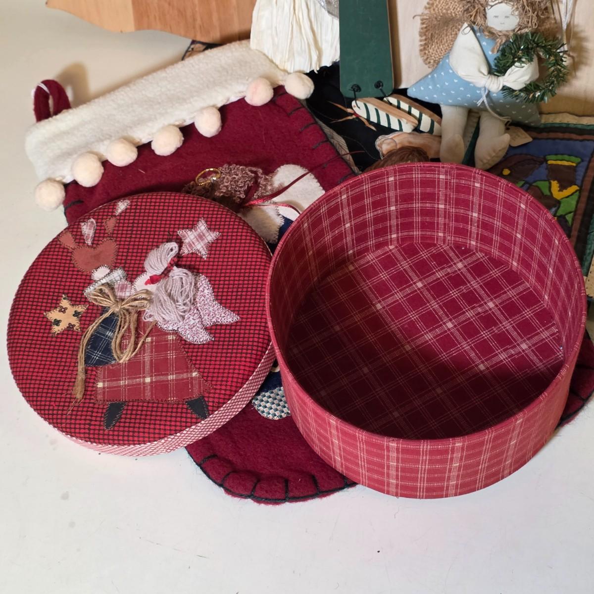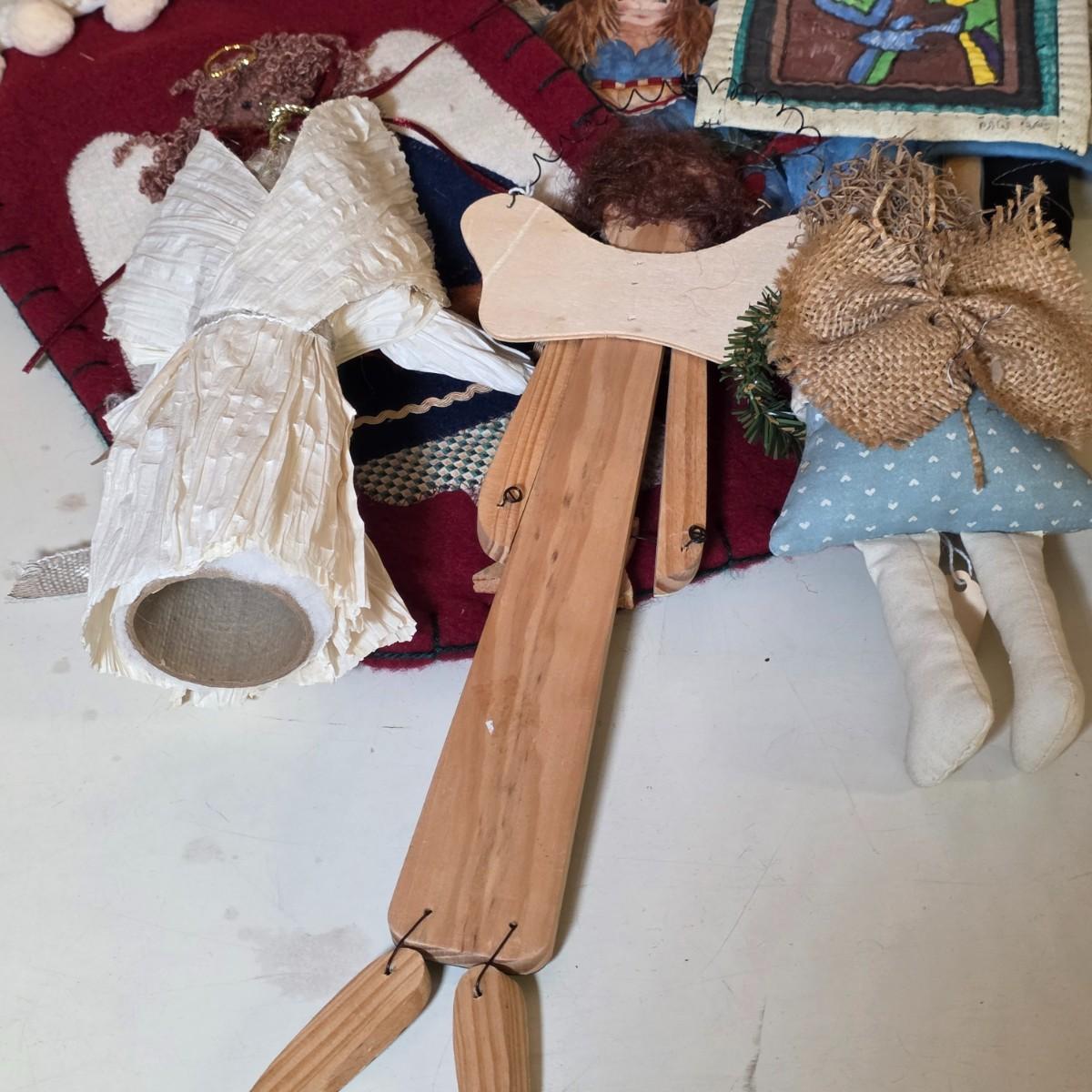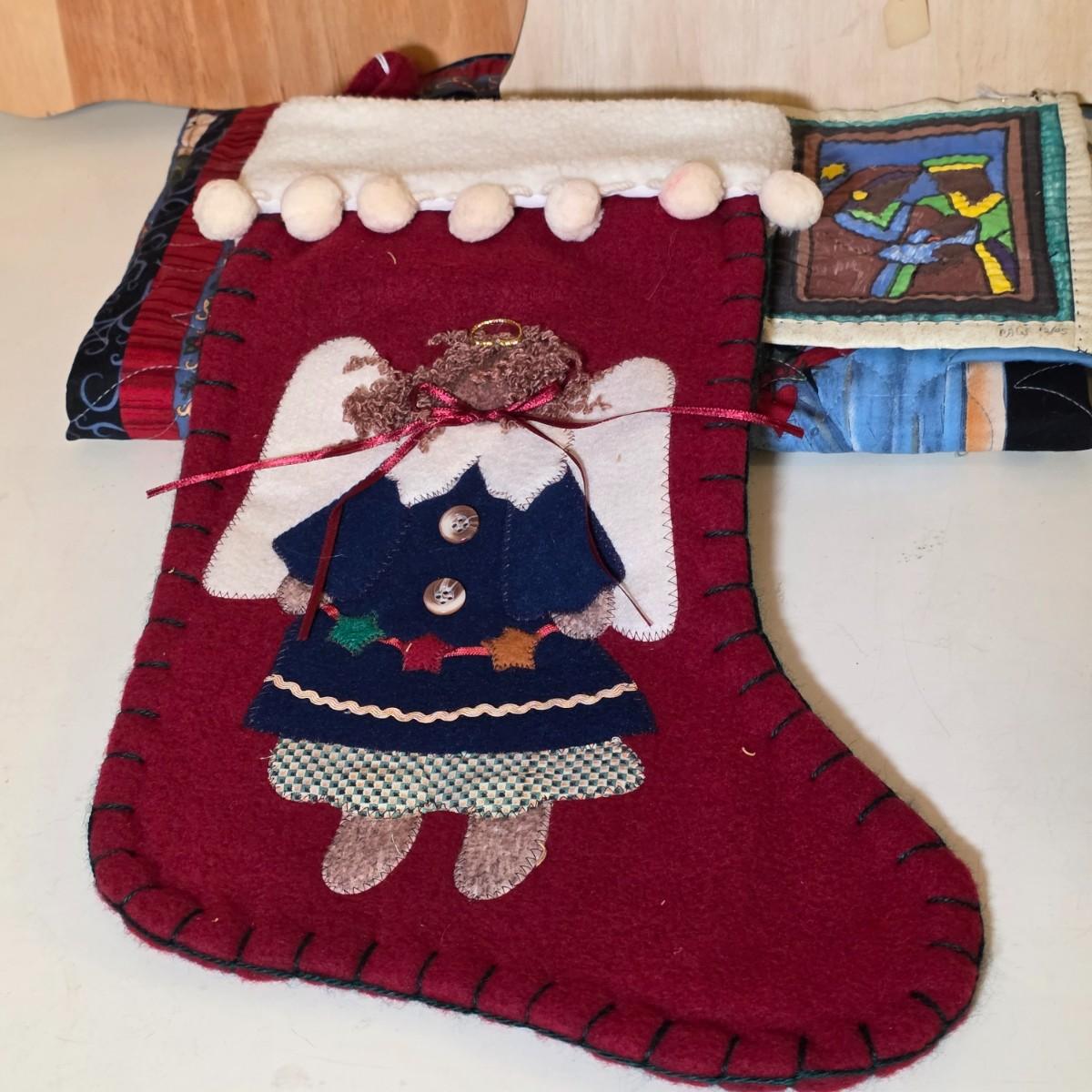 LOT 103S: Darling Finished Angel & One Ready To Finish Your Way, Along W/Smaller Angels, Stocking, Trivets & Decorative Box In A Crate