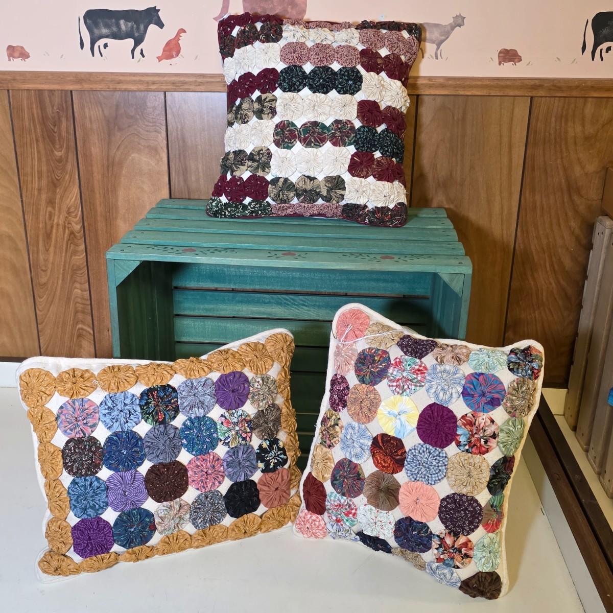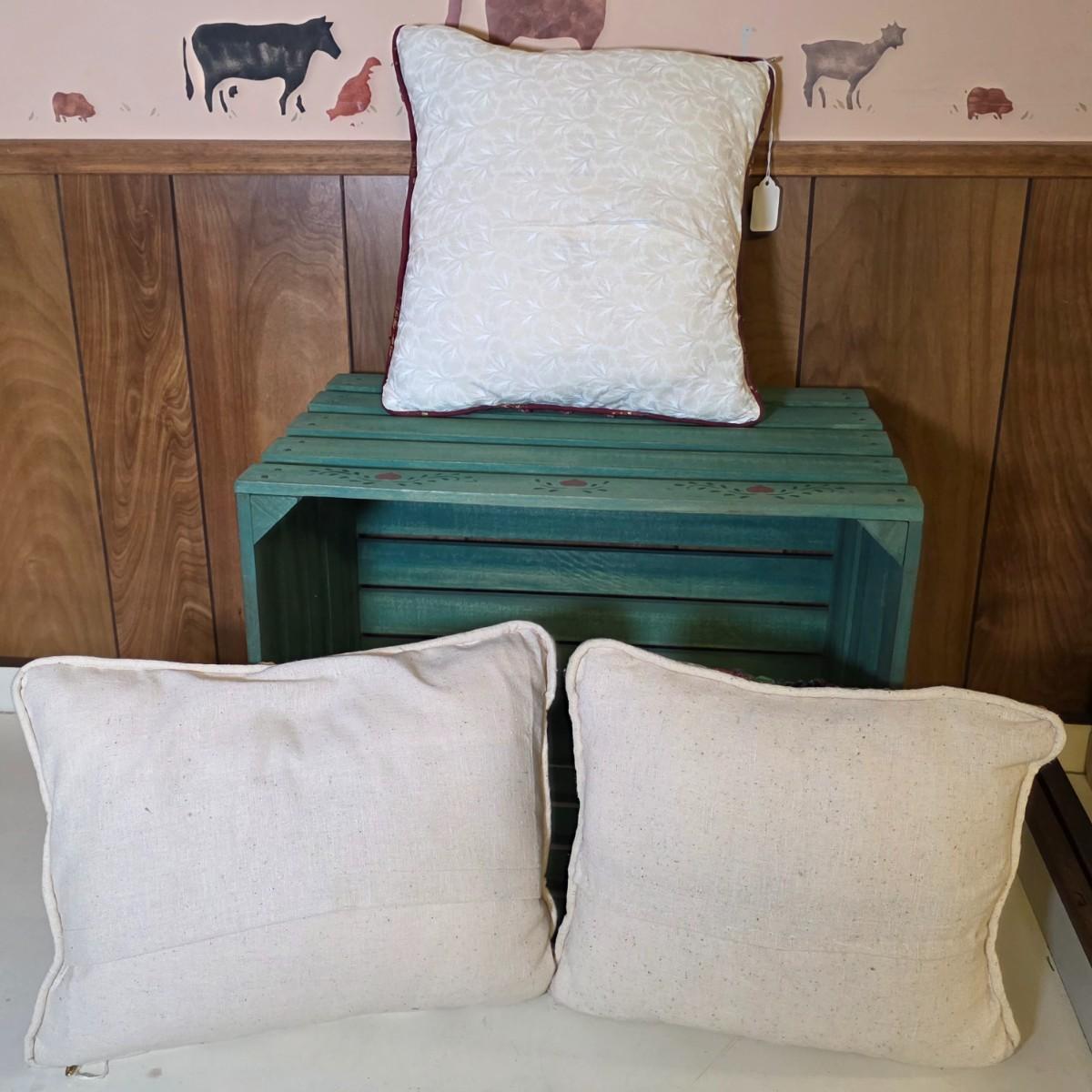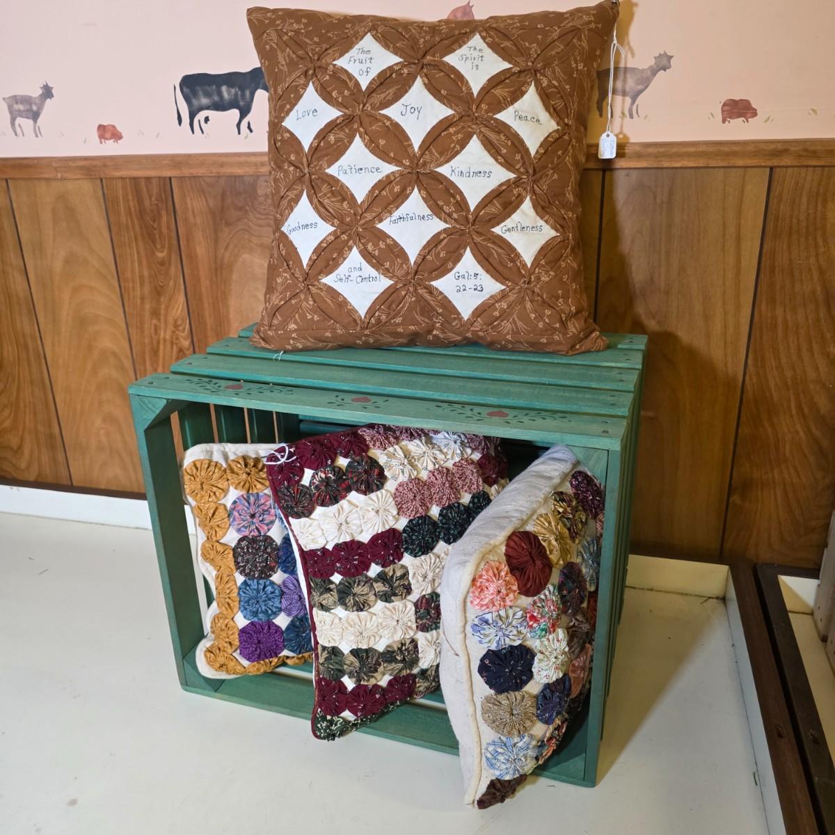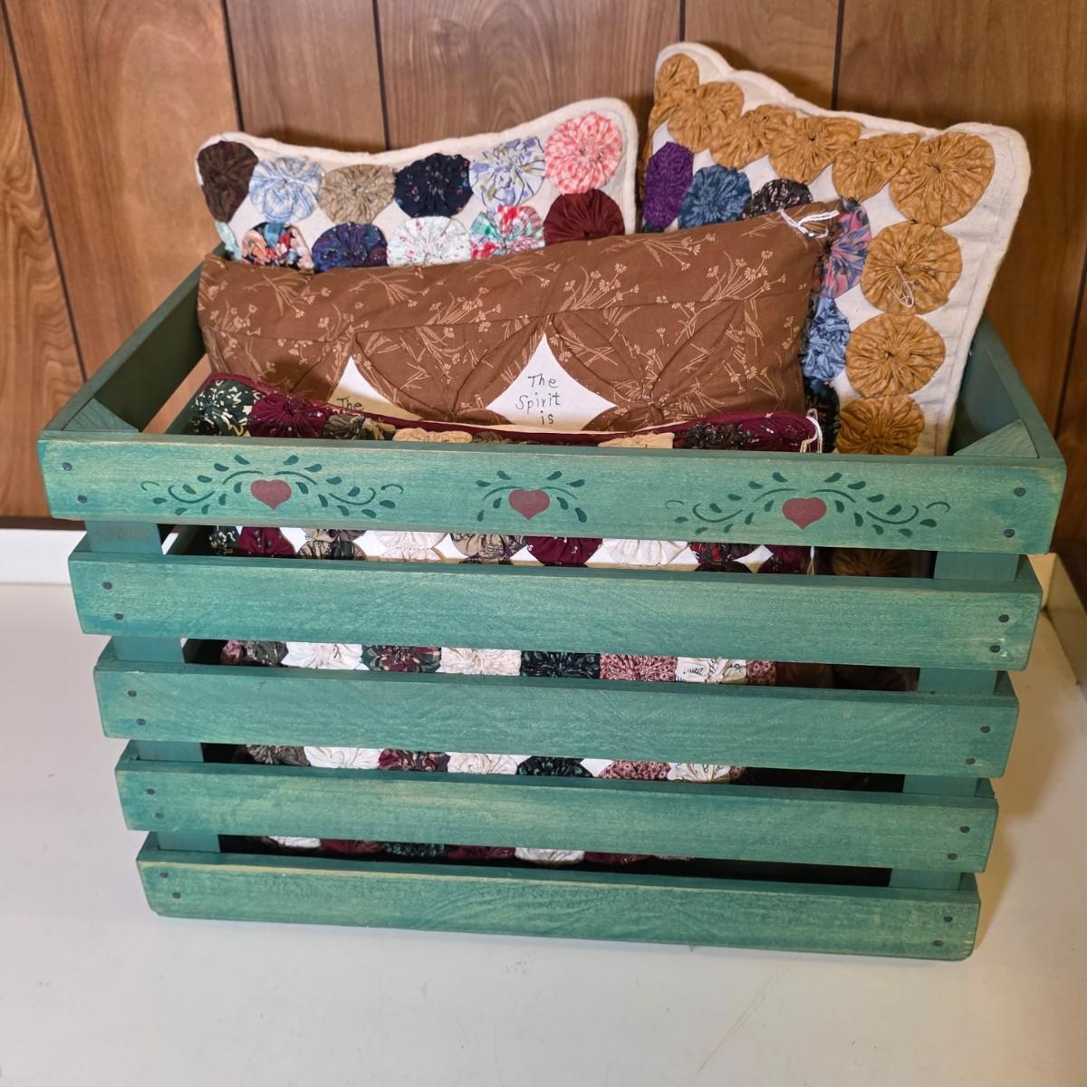 LOT 111S: Four Beautifully Handmade Pillows W/Hand Painted Crate