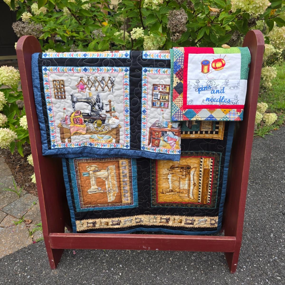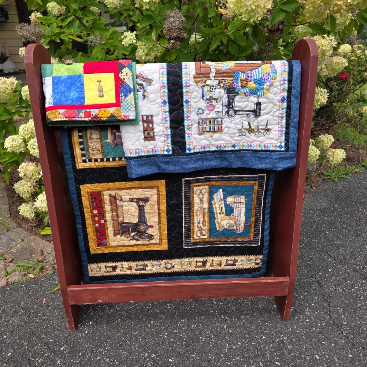 LOT 122S: Sew Many Cute Quilts! Vintage/Handmade Quilts W/Unique Details & Quilt Rack
