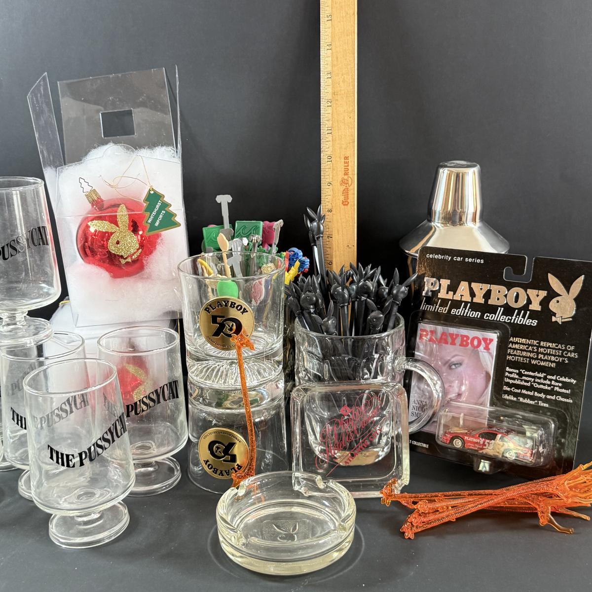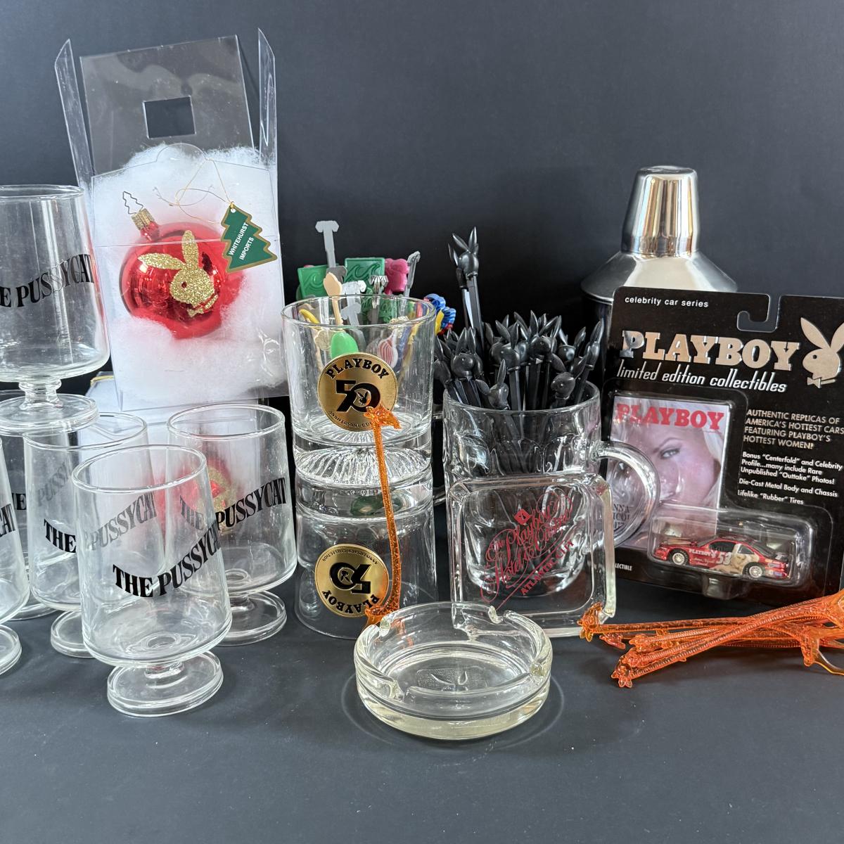 LOT 29: Large Collection of Playboy Memorabilia Including Glasses, Ashtrays, Toy Car, Ornaments and Glasses From the Pussycat