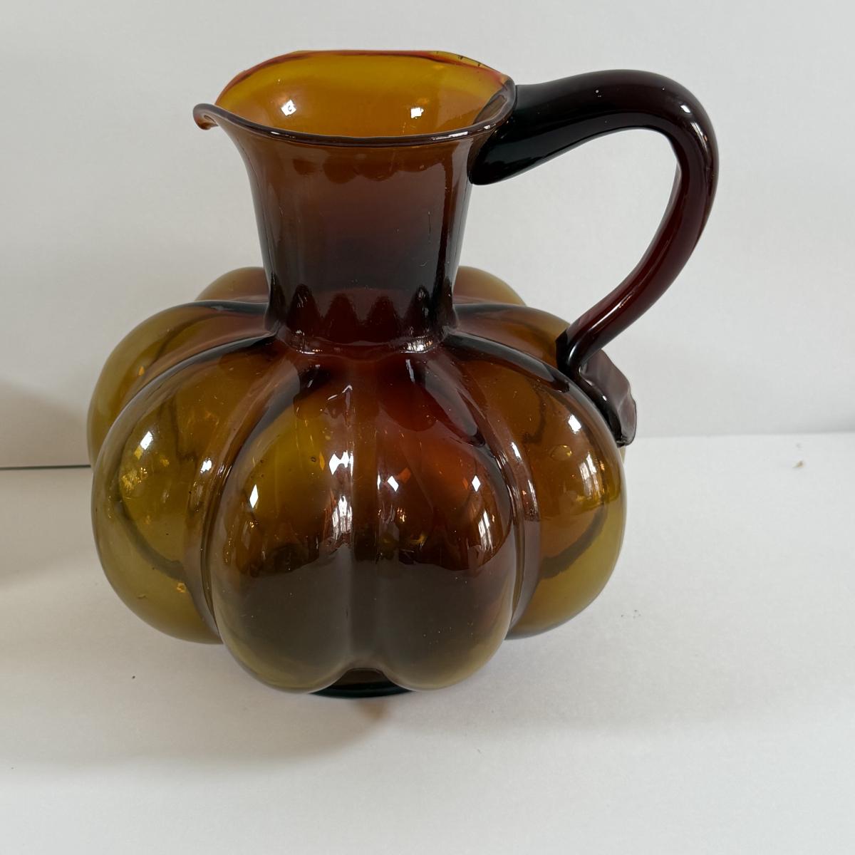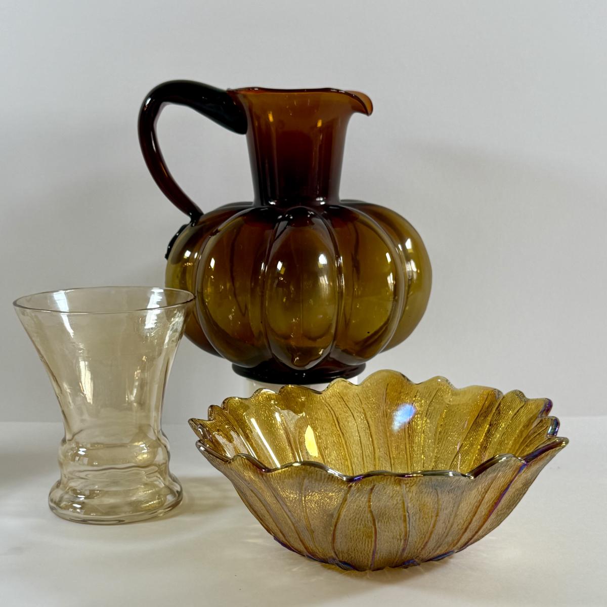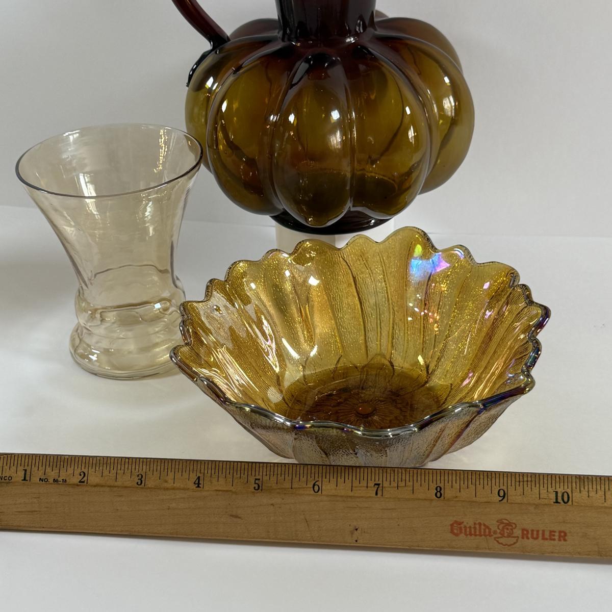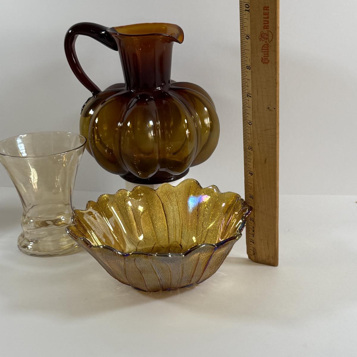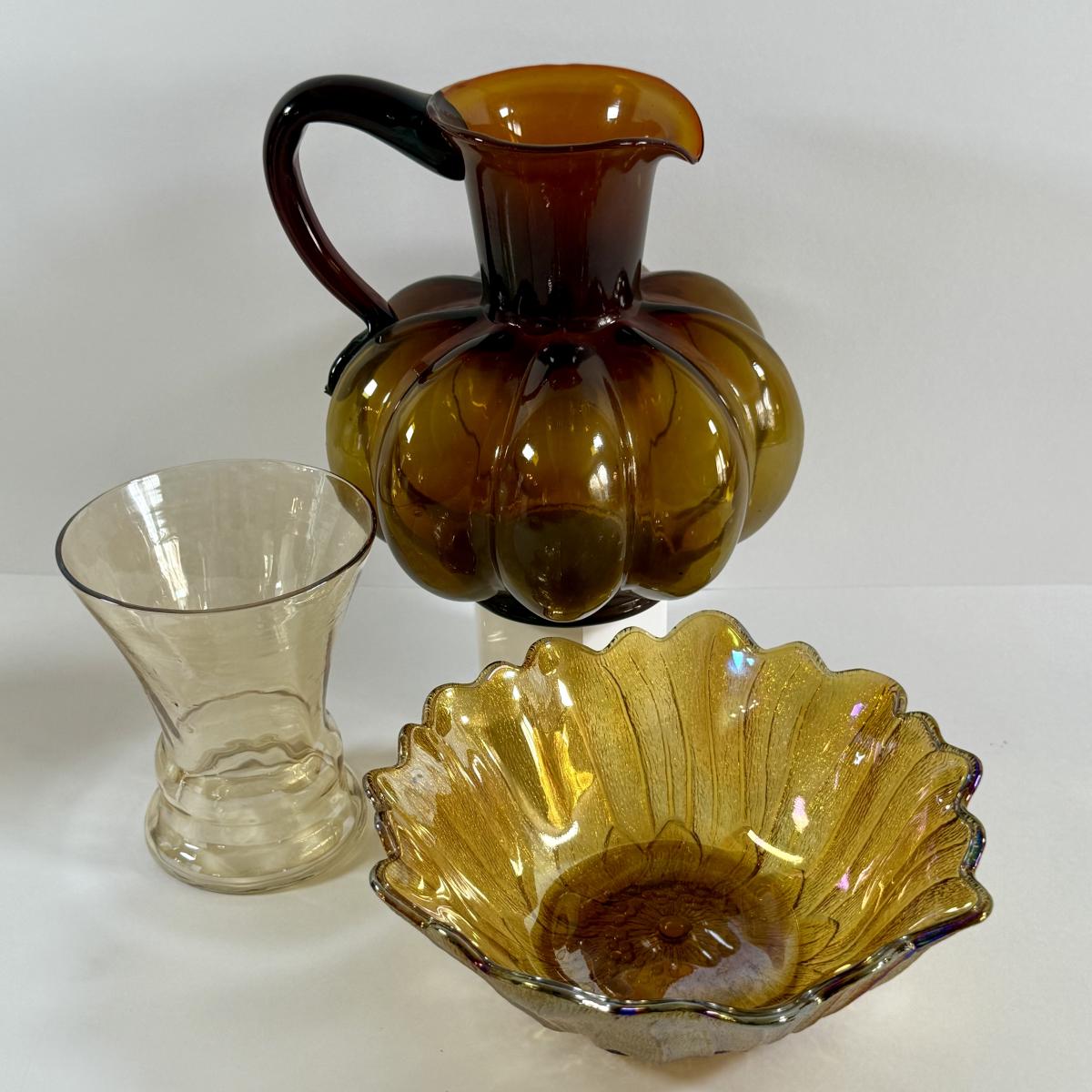 LOT 38: Collection of Amber Glass Pitcher and Vase and a Carnival Glass Sunflower Bowl