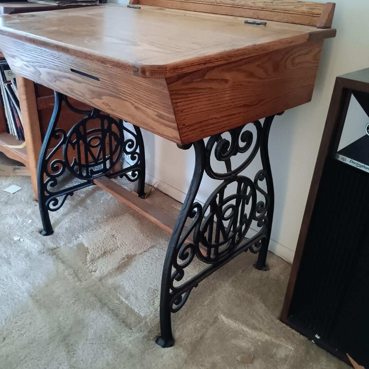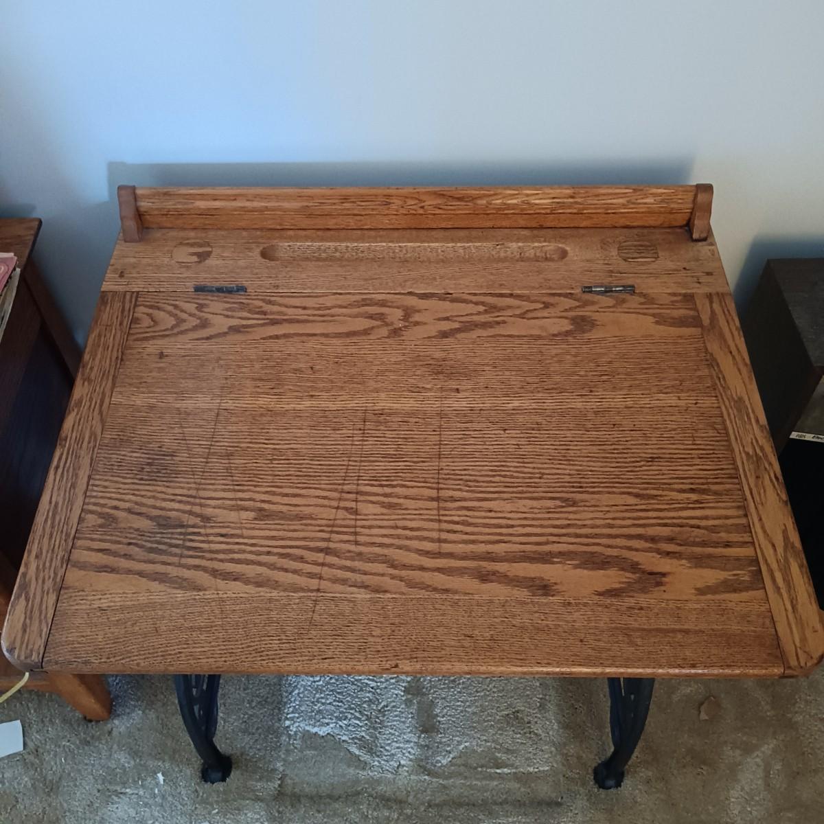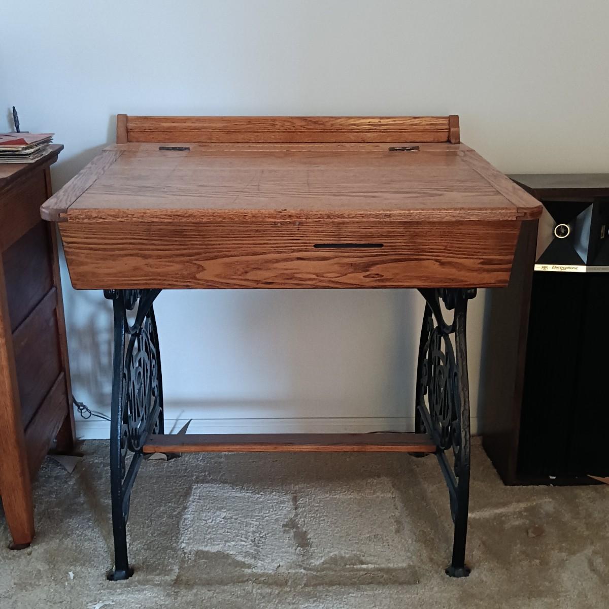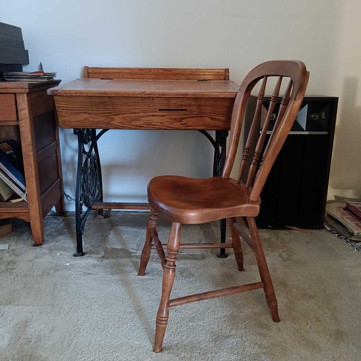 LOT 187: Vintage Oak and Cast Iron School Desk with Tell City Chairs Andover Dinette Chair 2202