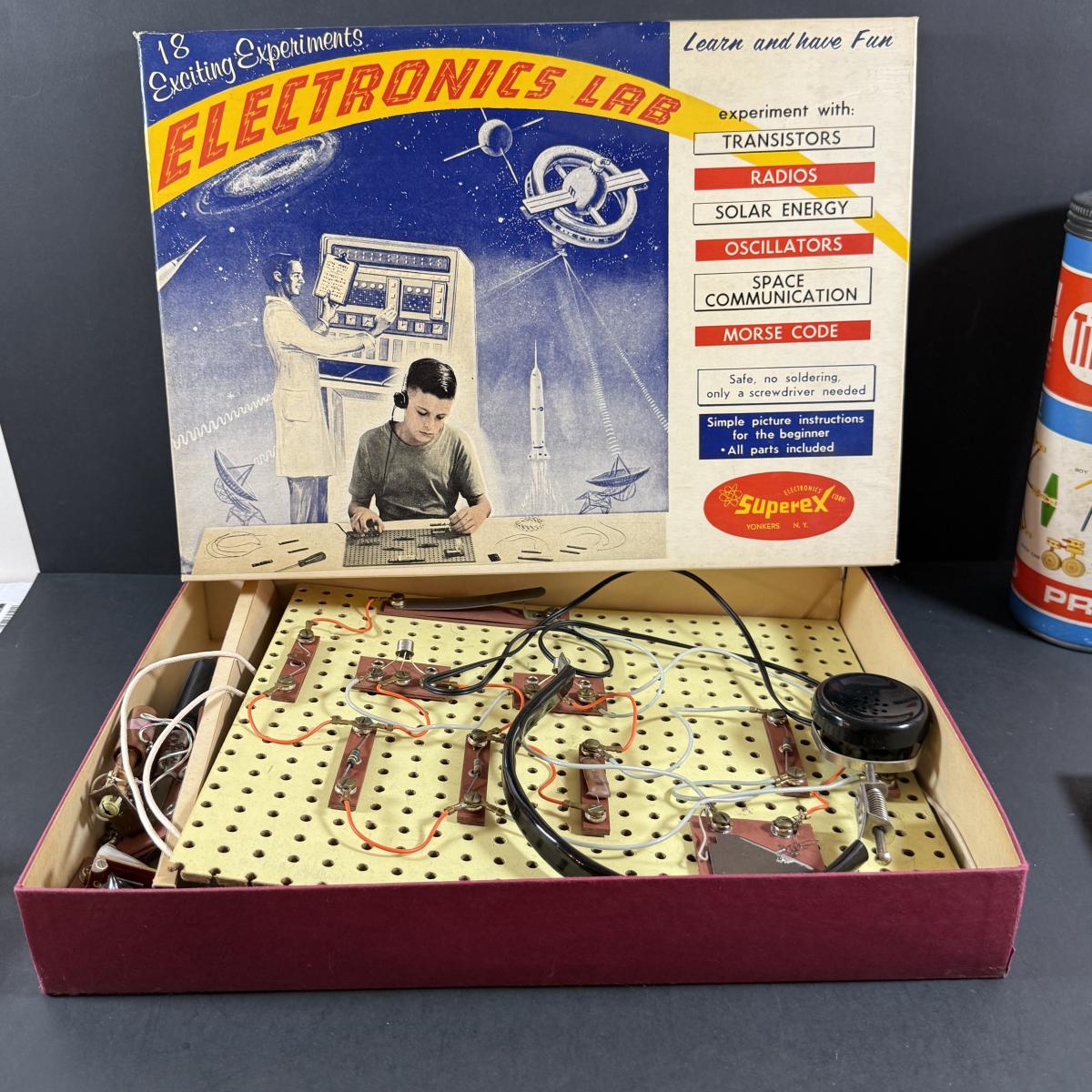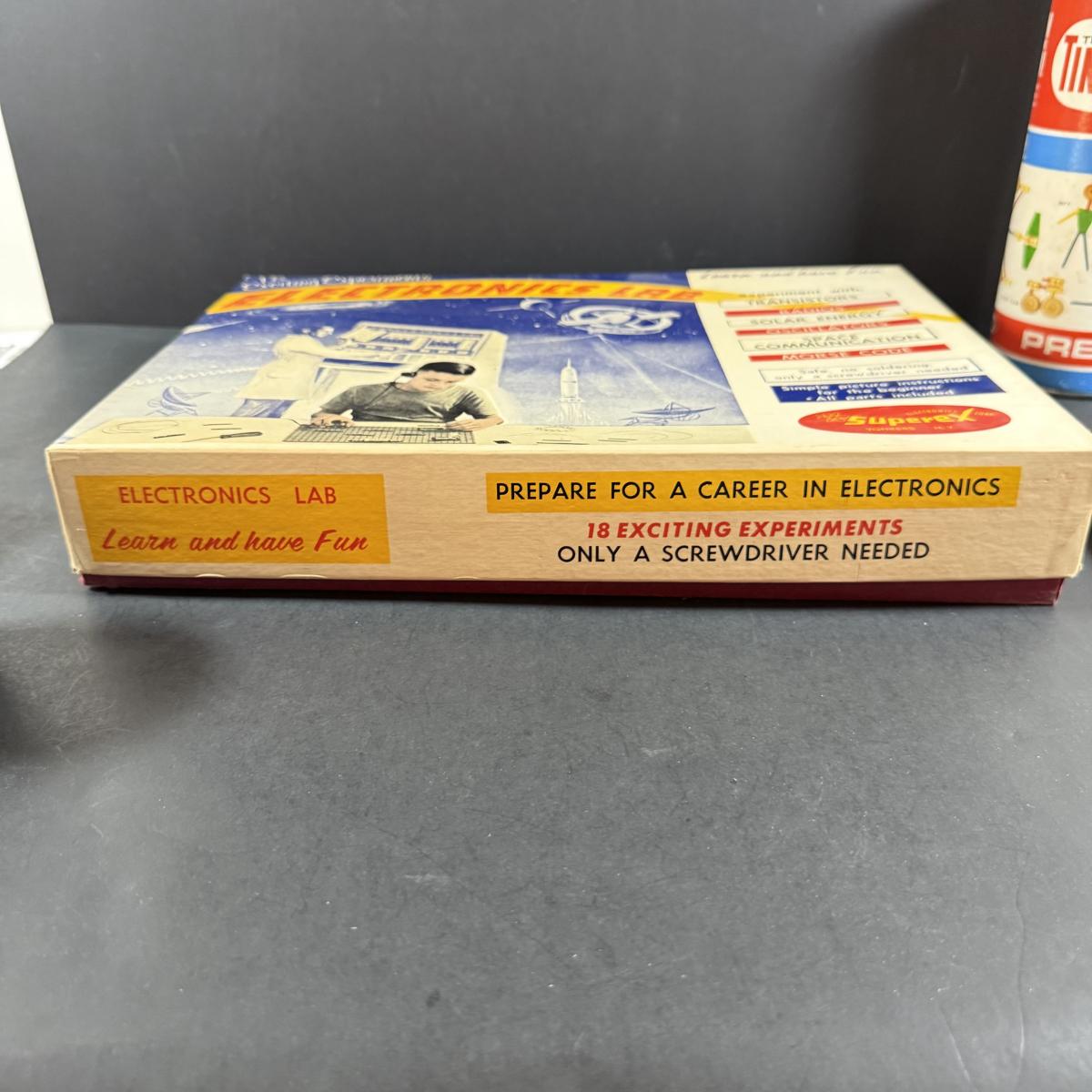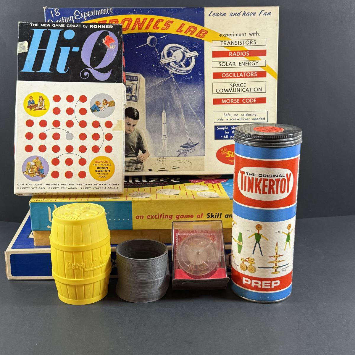 LOT 190: Collection of Vintage Toy and Games - Tinker Toy. Slinky, Electronics Lab and More