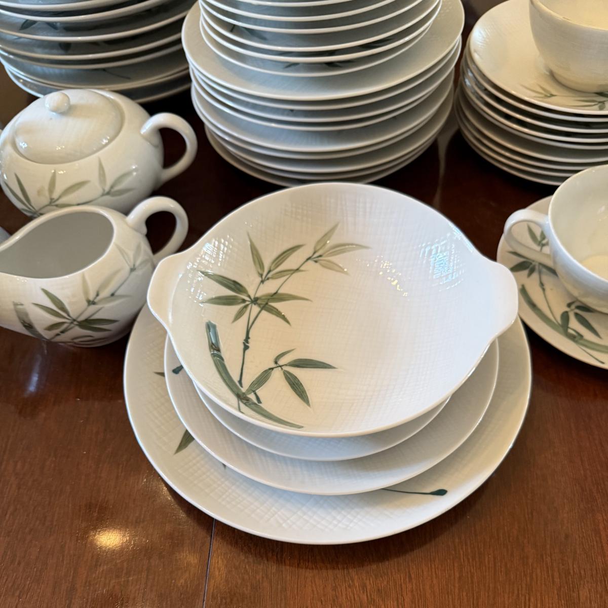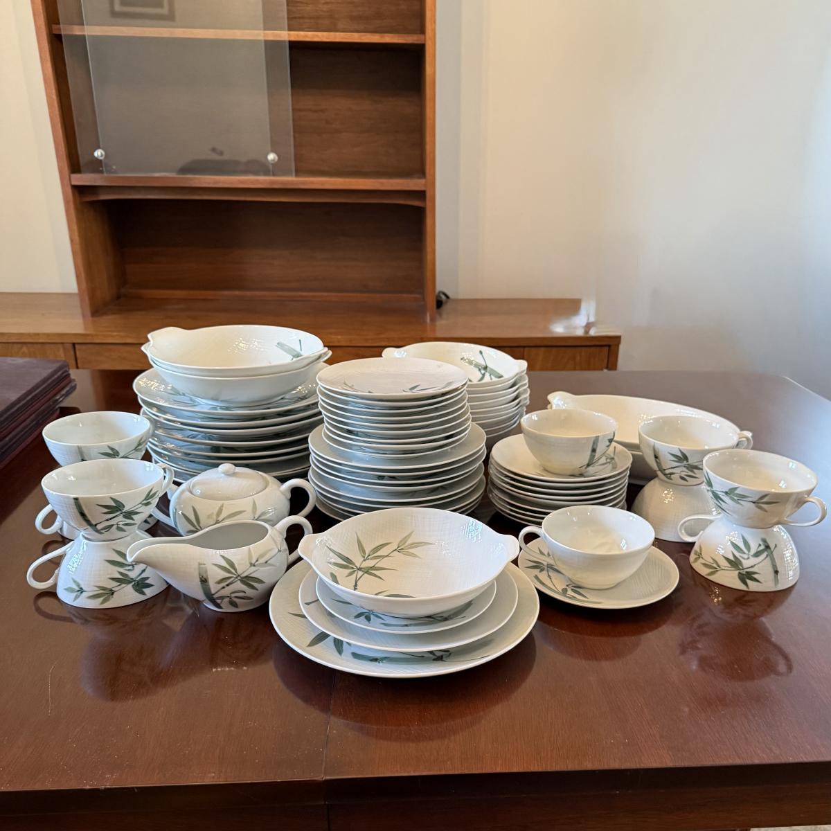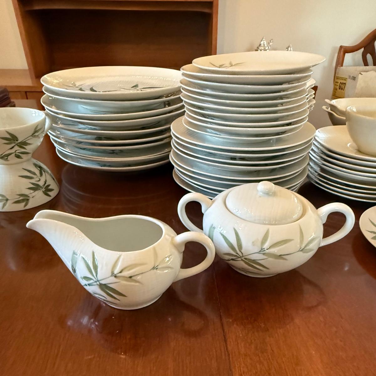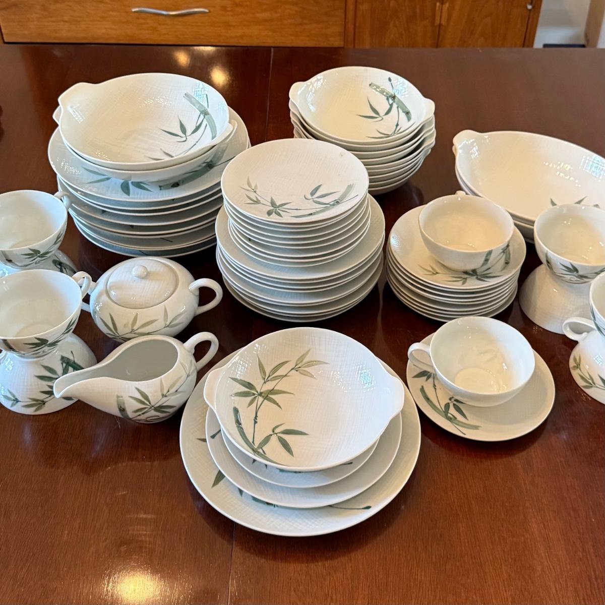 LOT 195: Hand Painted Bamboo China Complete Service for Ten with Serving Bowls and Sugar Bowl and Creamer
