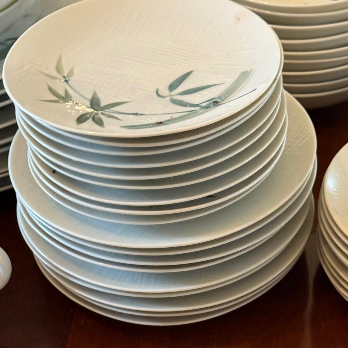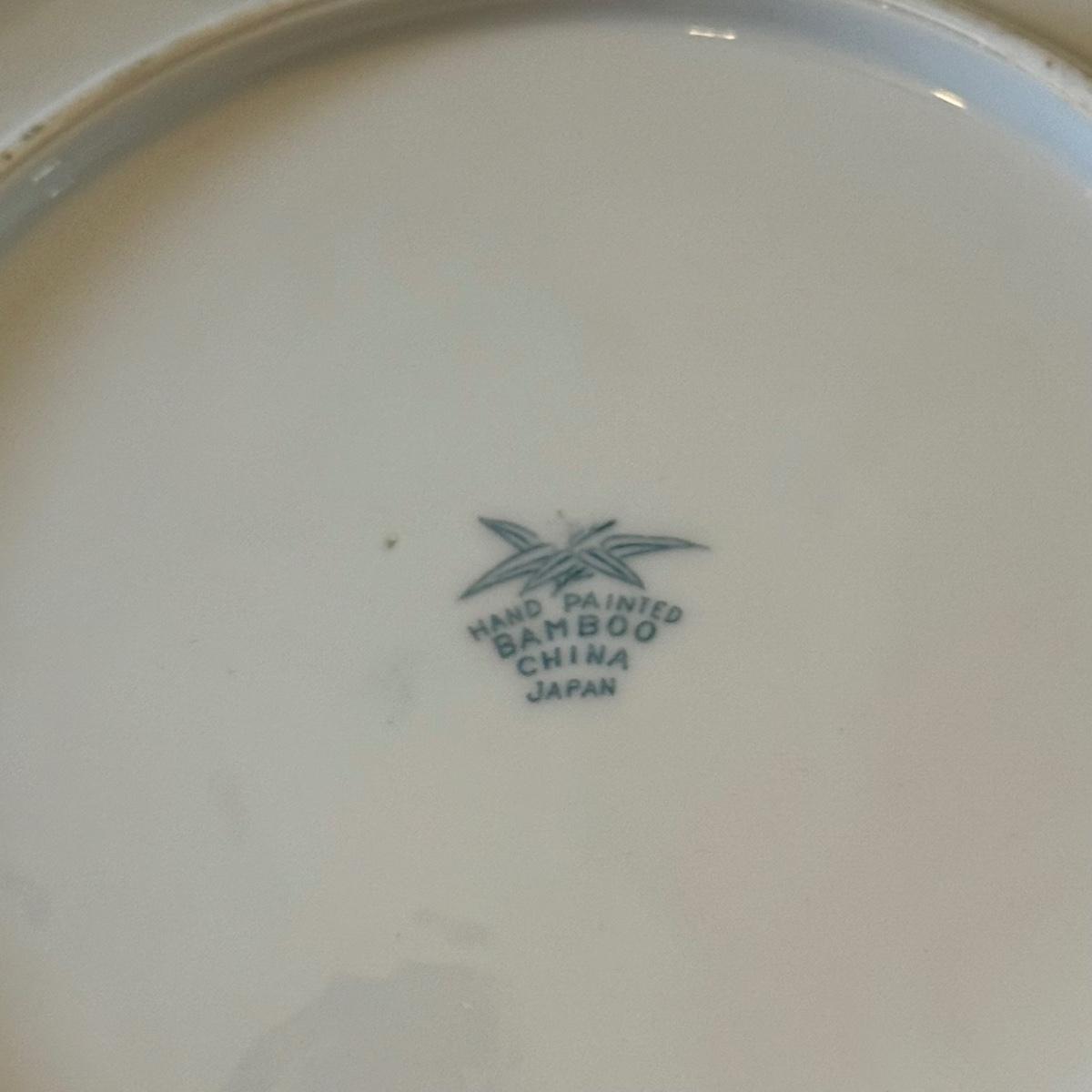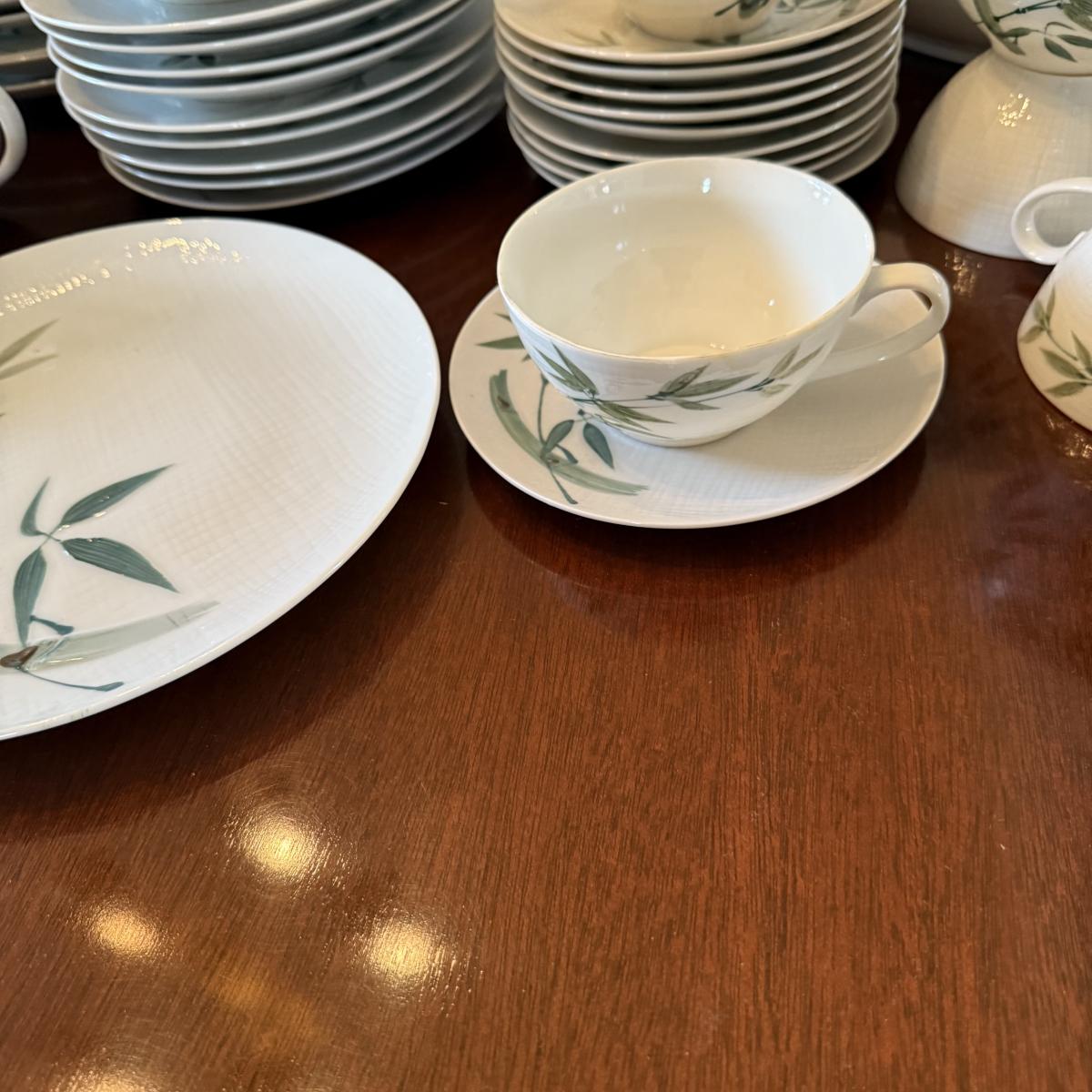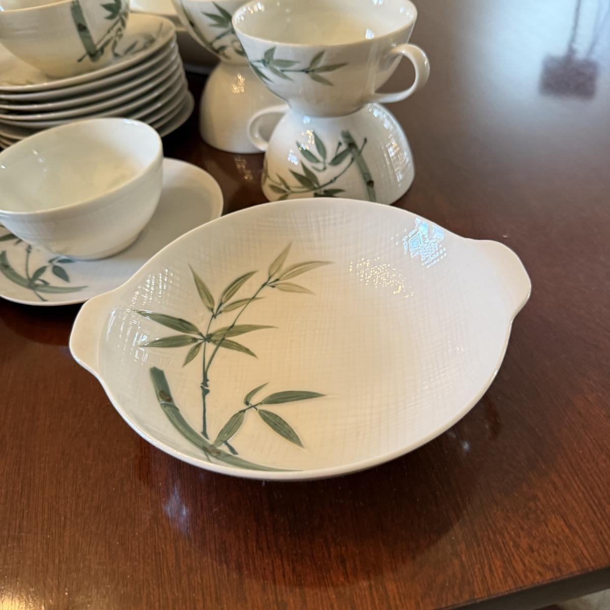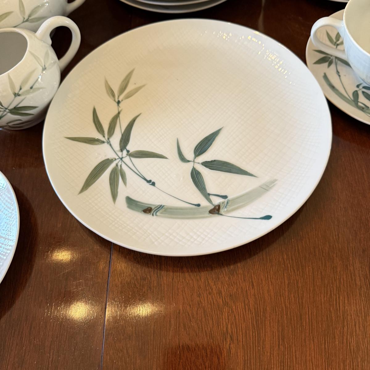 LOT 195: Hand Painted Bamboo China Complete Service for Ten with Serving Bowls and Sugar Bowl and Creamer