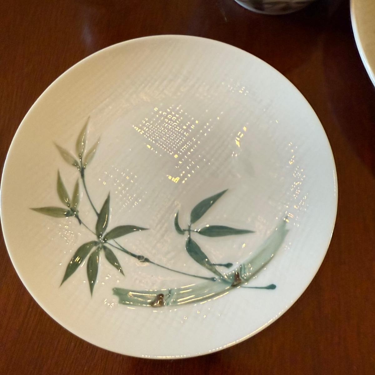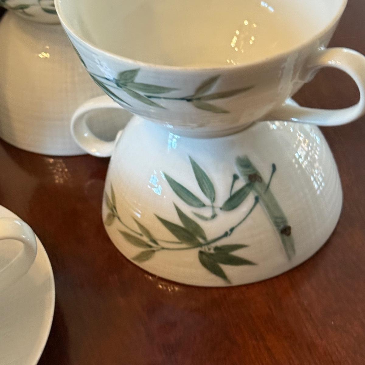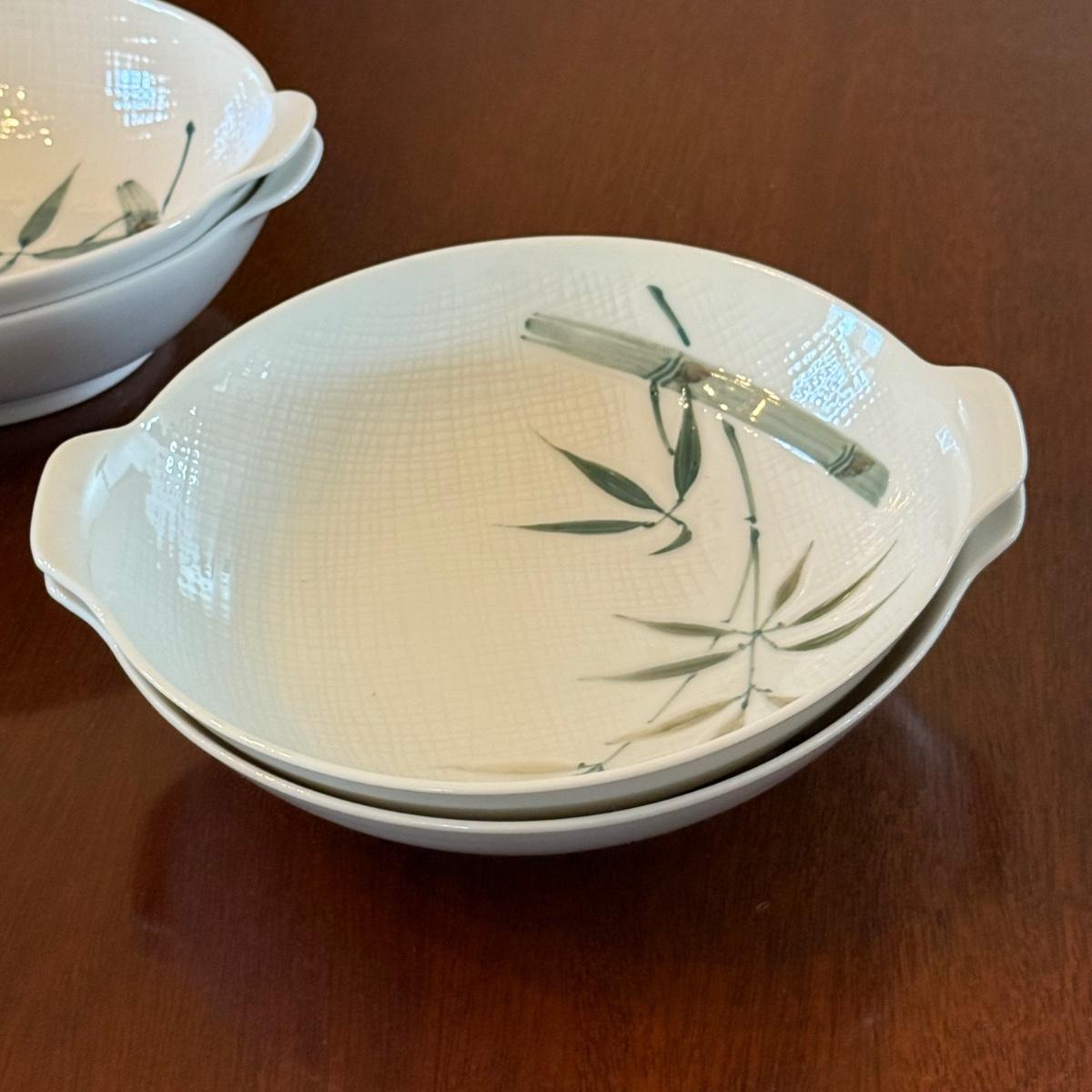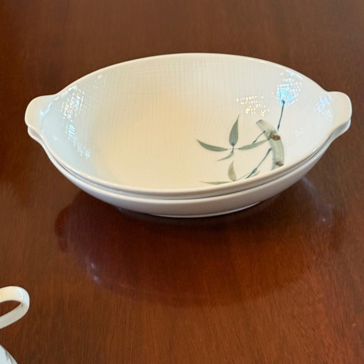 LOT 195: Hand Painted Bamboo China Complete Service for Ten with Serving Bowls and Sugar Bowl and Creamer