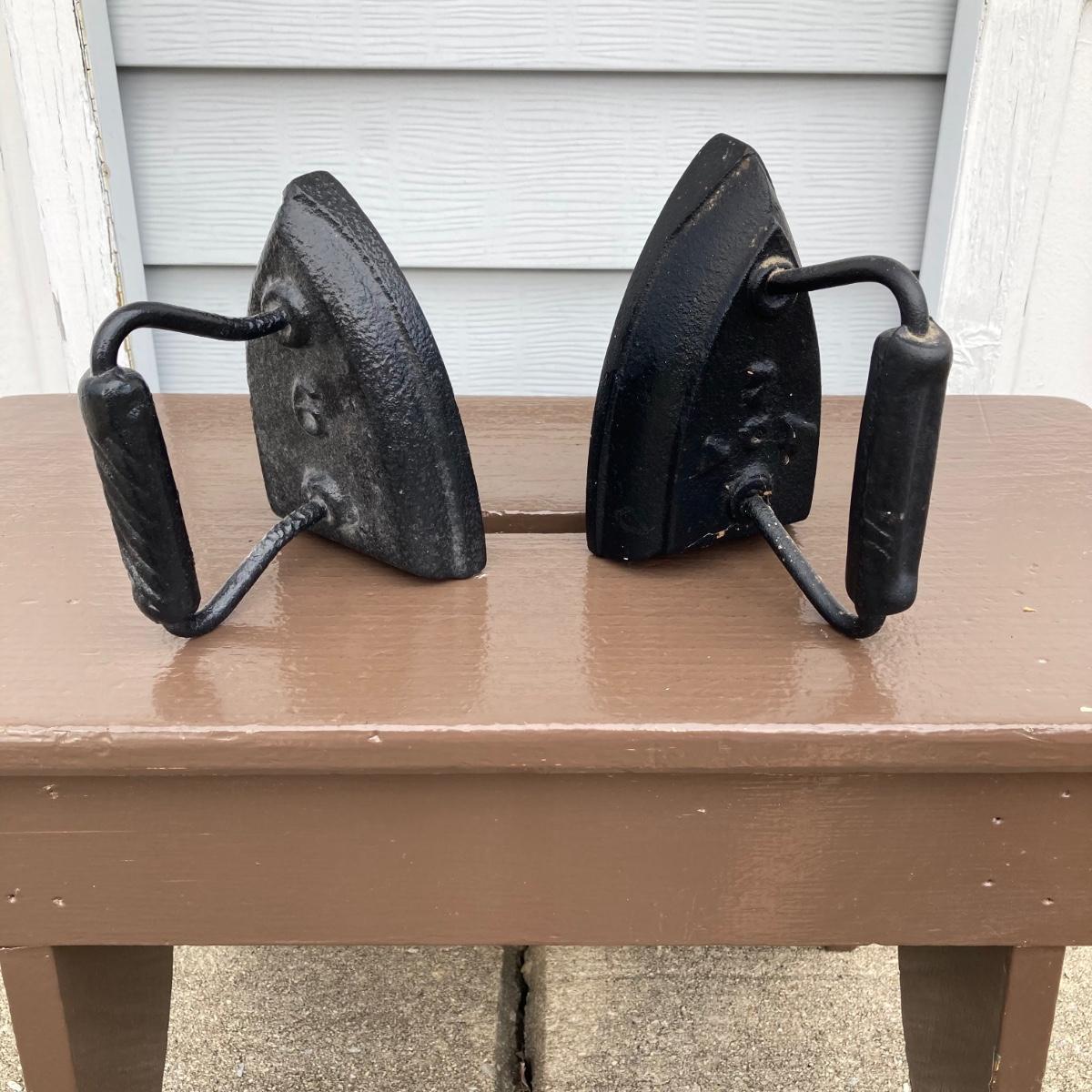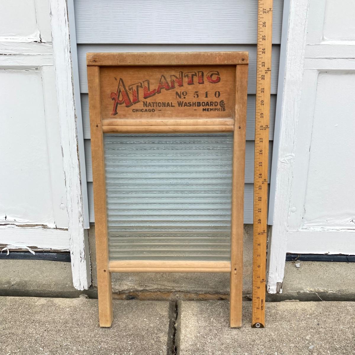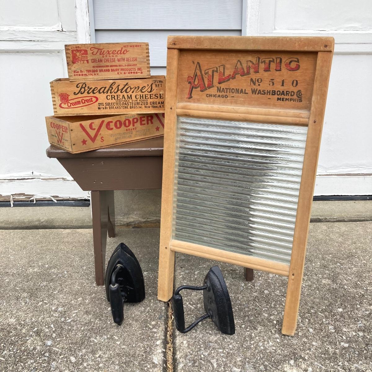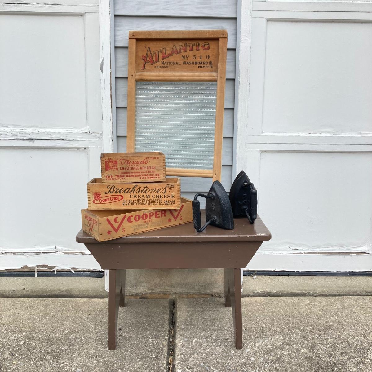 LOT 225: Atlantic National Washboard No. 510, Three Wooden Cheese Boxes, Painted Brown Step Stool / Bench and Pair of Cast Iron Flat Irons