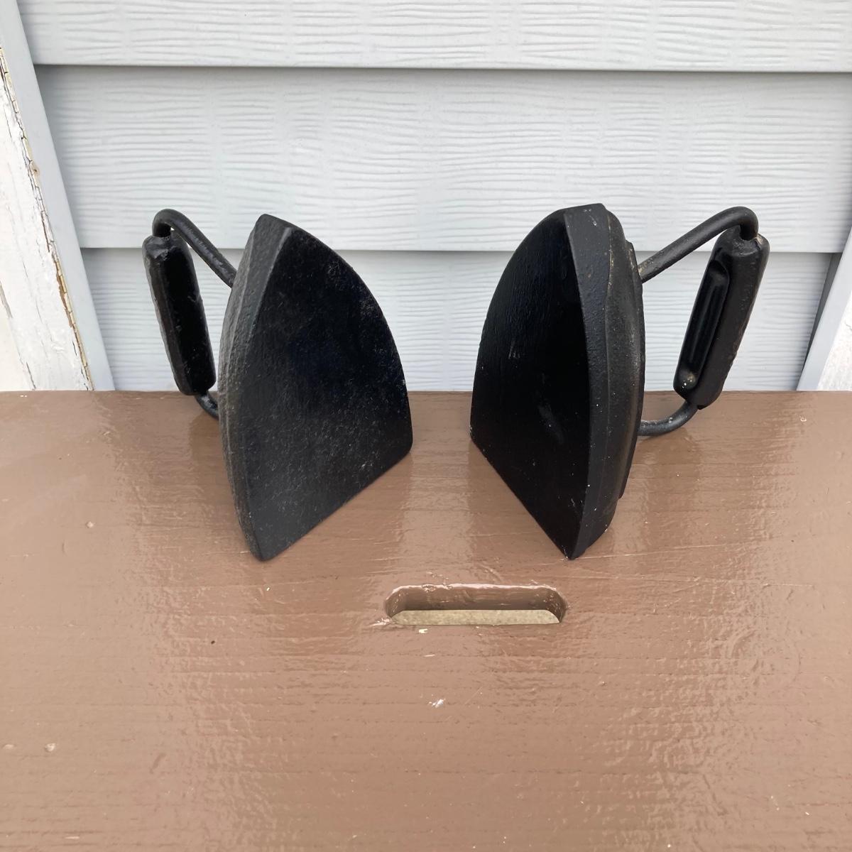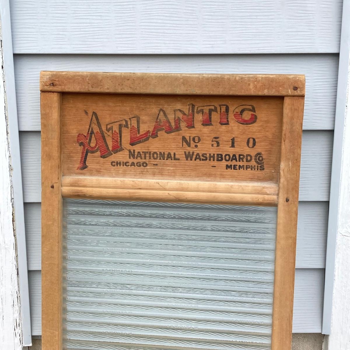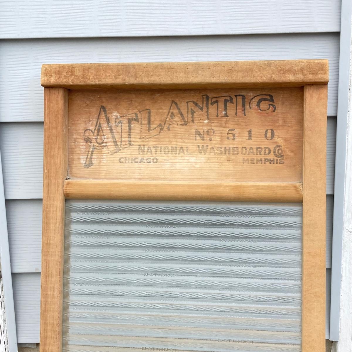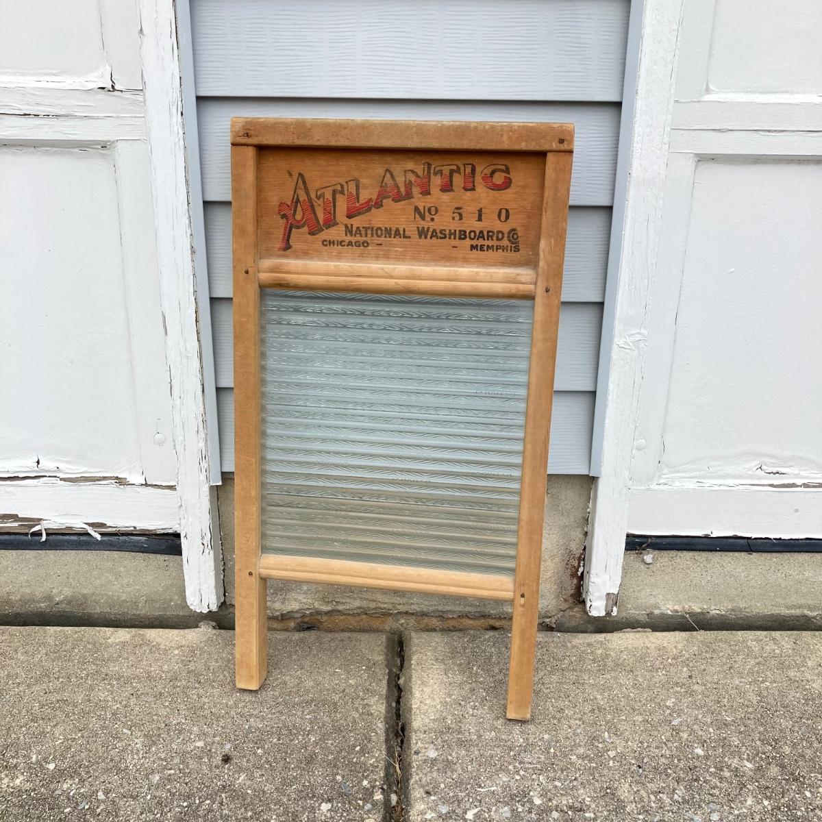LOT 225: Atlantic National Washboard No. 510, Three Wooden Cheese Boxes, Painted Brown Step Stool / Bench and Pair of Cast Iron Flat Irons