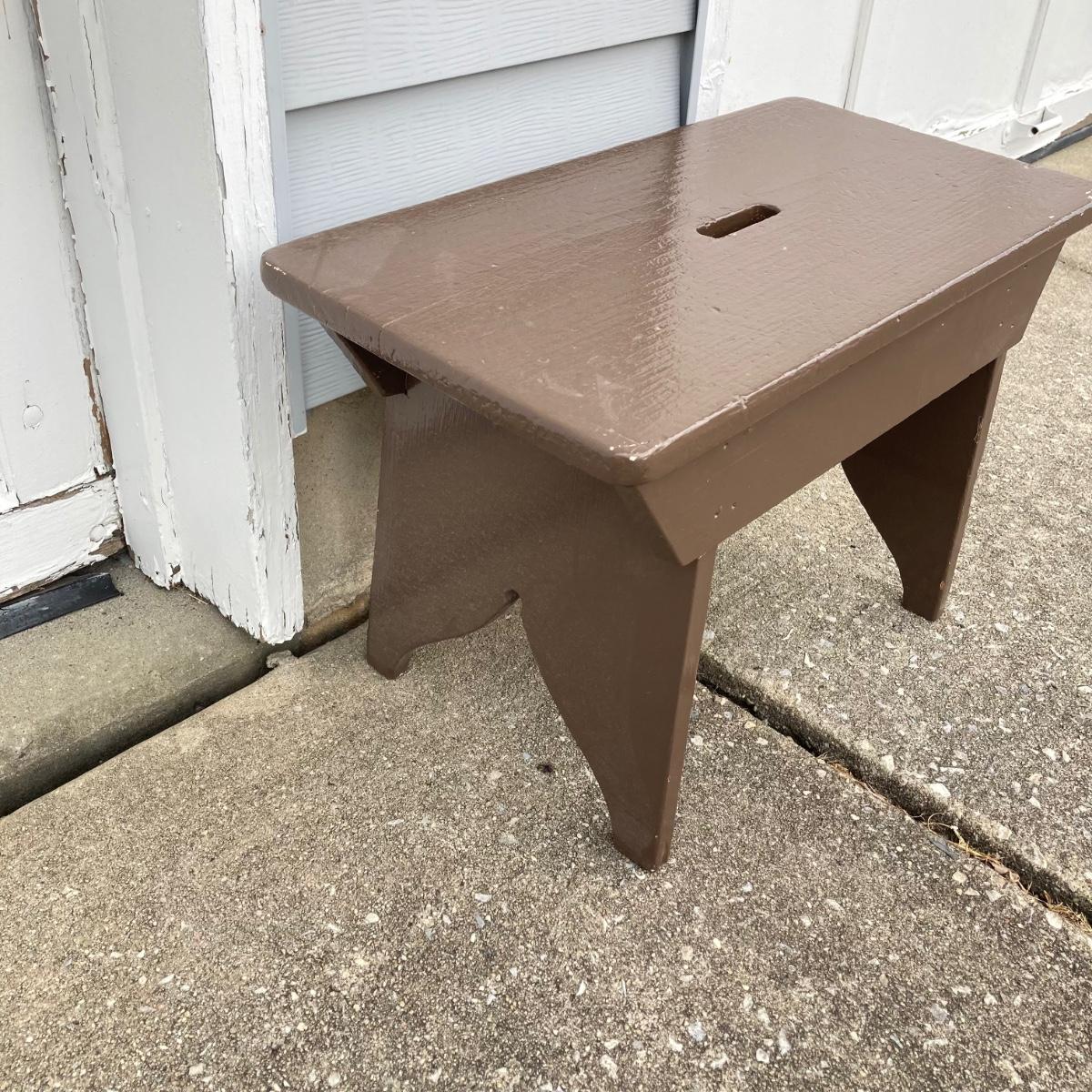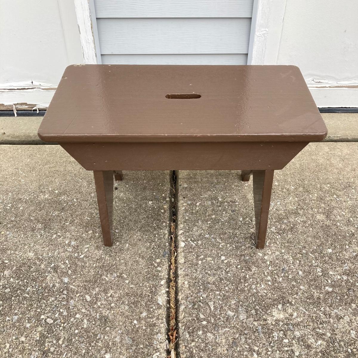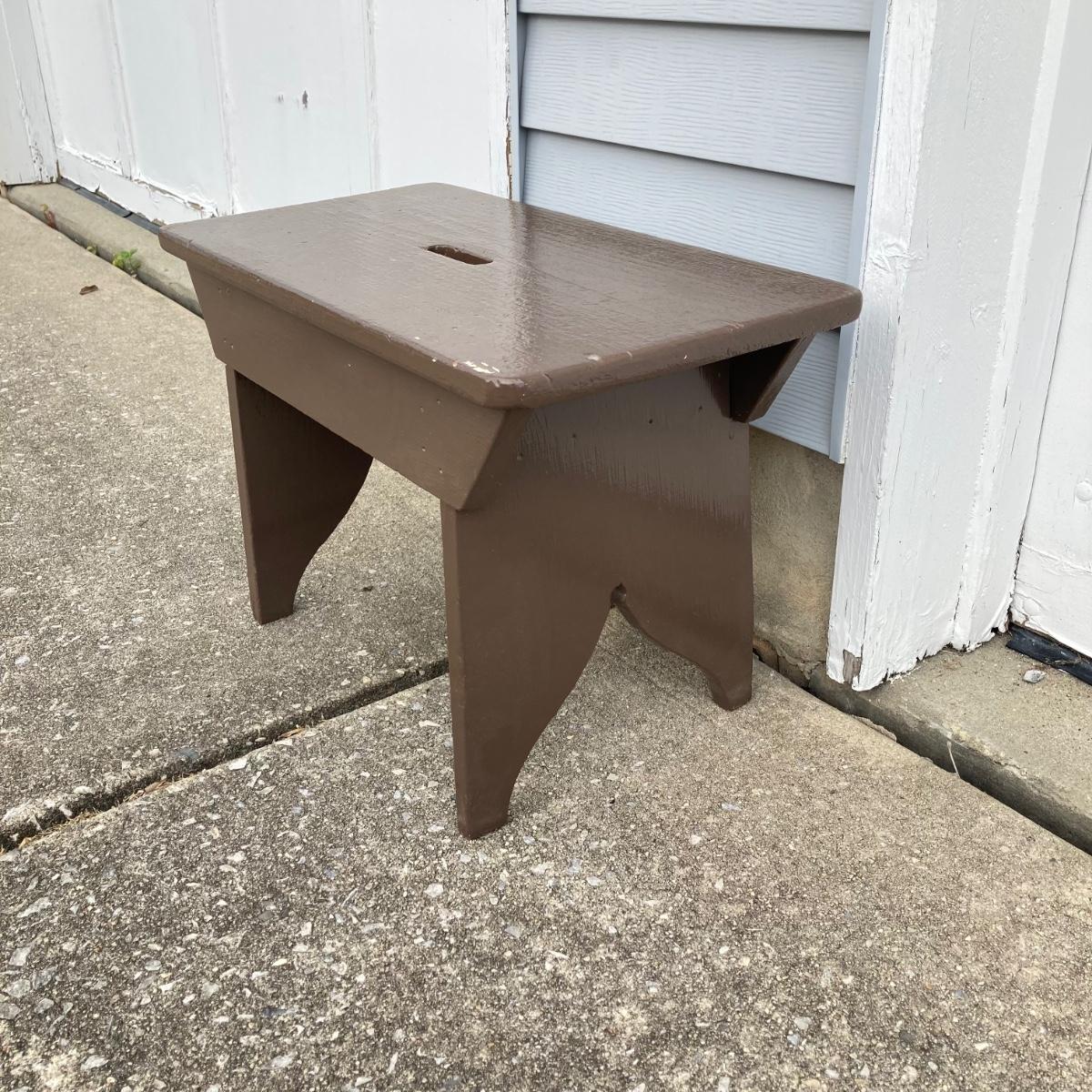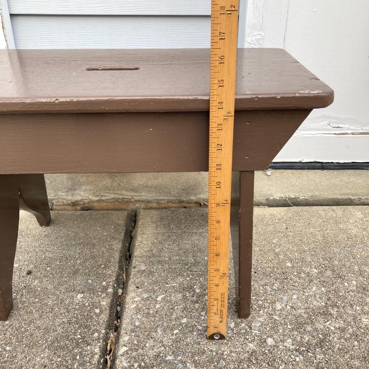 LOT 225: Atlantic National Washboard No. 510, Three Wooden Cheese Boxes, Painted Brown Step Stool / Bench and Pair of Cast Iron Flat Irons