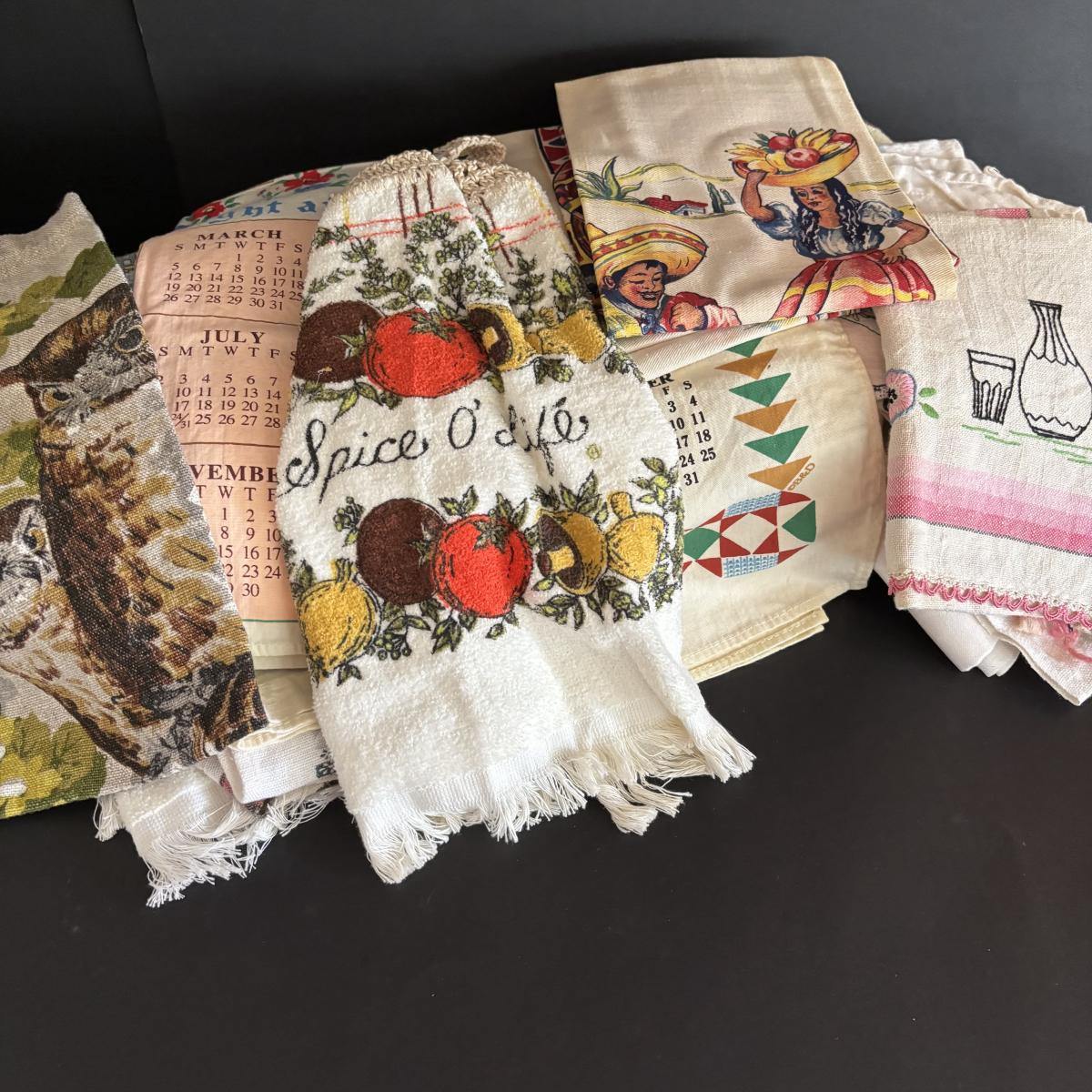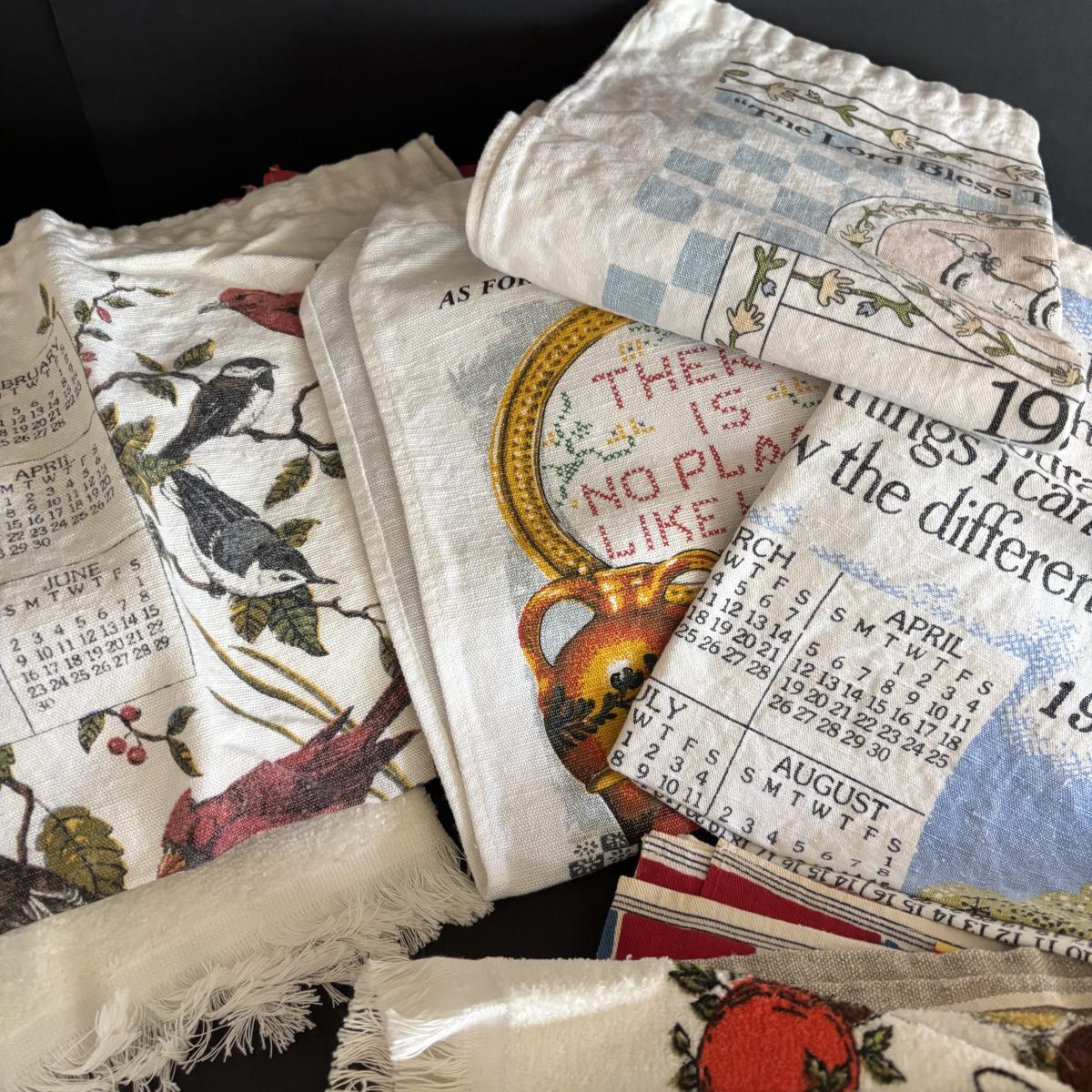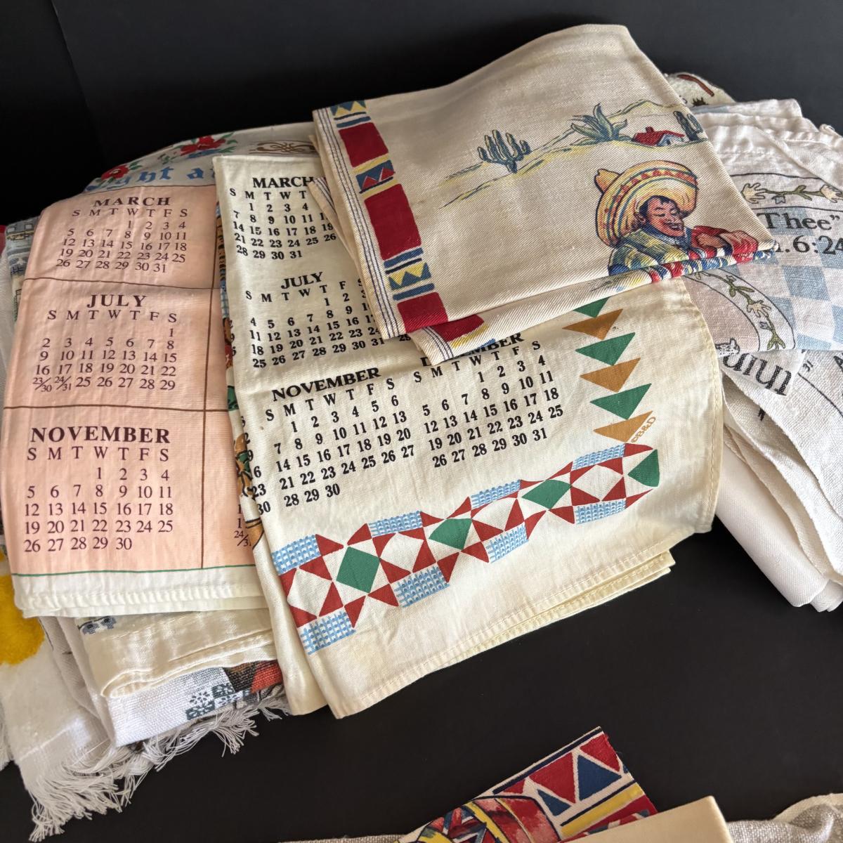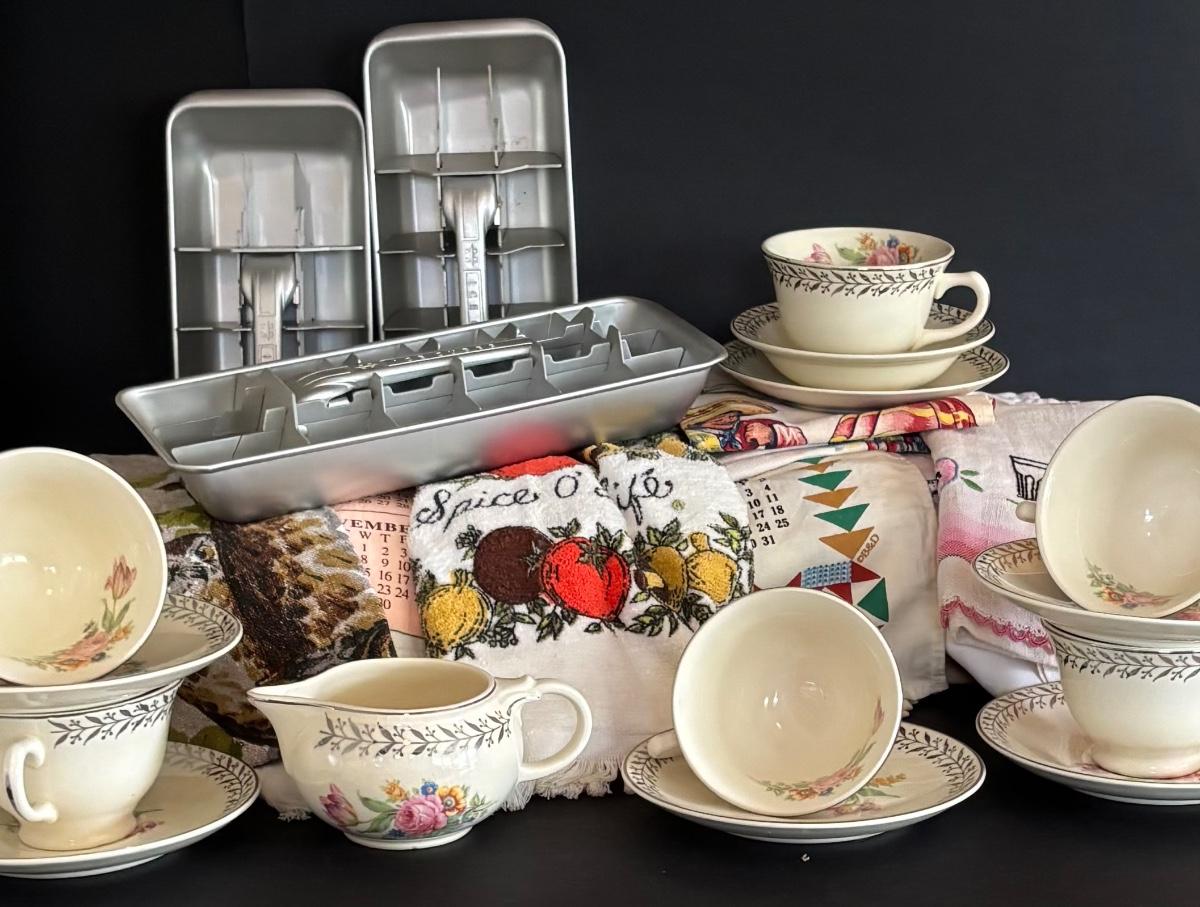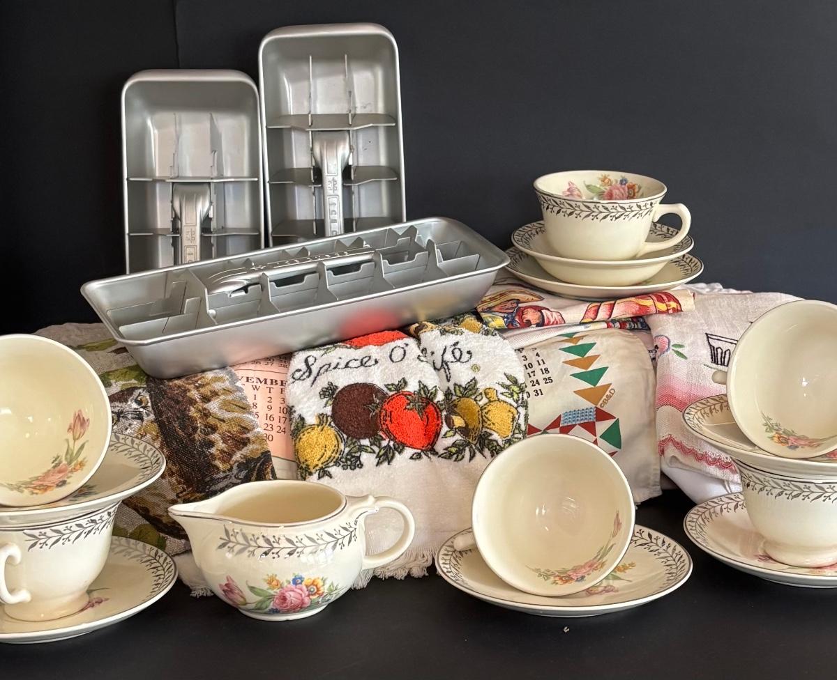 LOT 244: Vintage Kitchen Calendar Towel & Linens, Ice Trays along with Taylor Smith Taylor Dishware