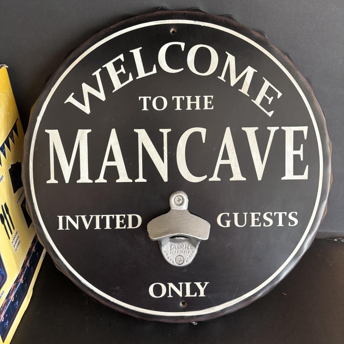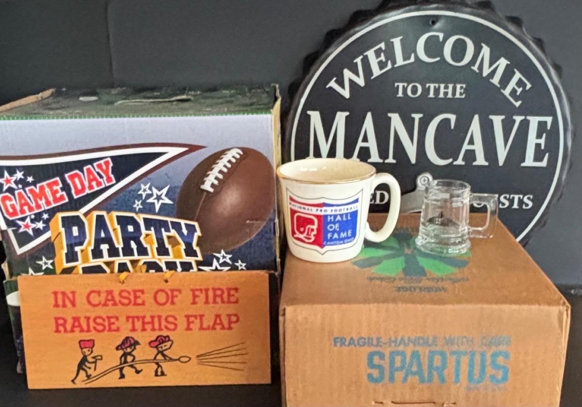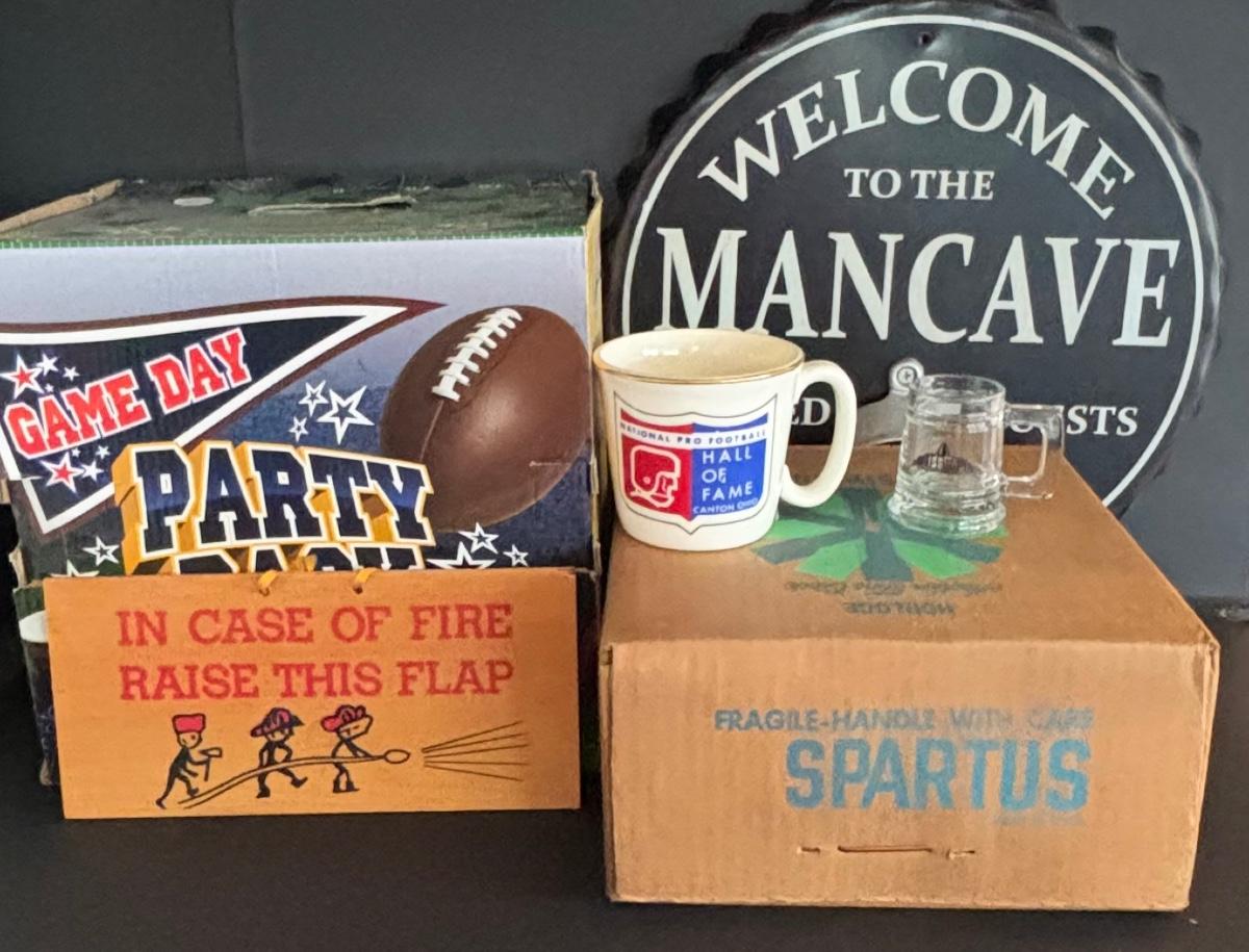 LOT 245: Vintage Spartus Clock w/Original Packaging, NIP Game Day Party Pack, Man Cave Sign & More