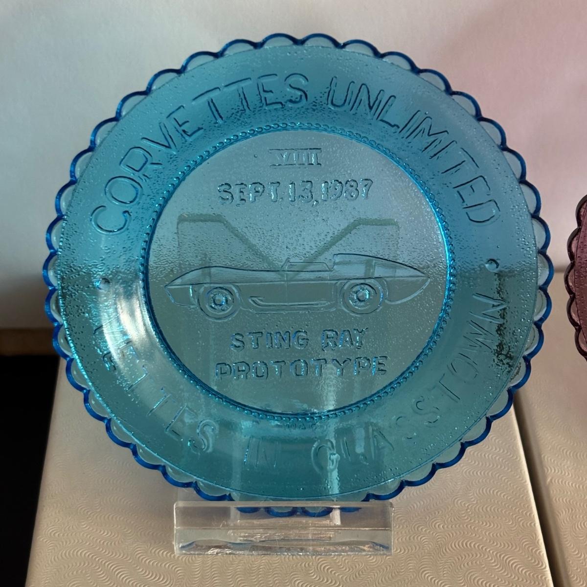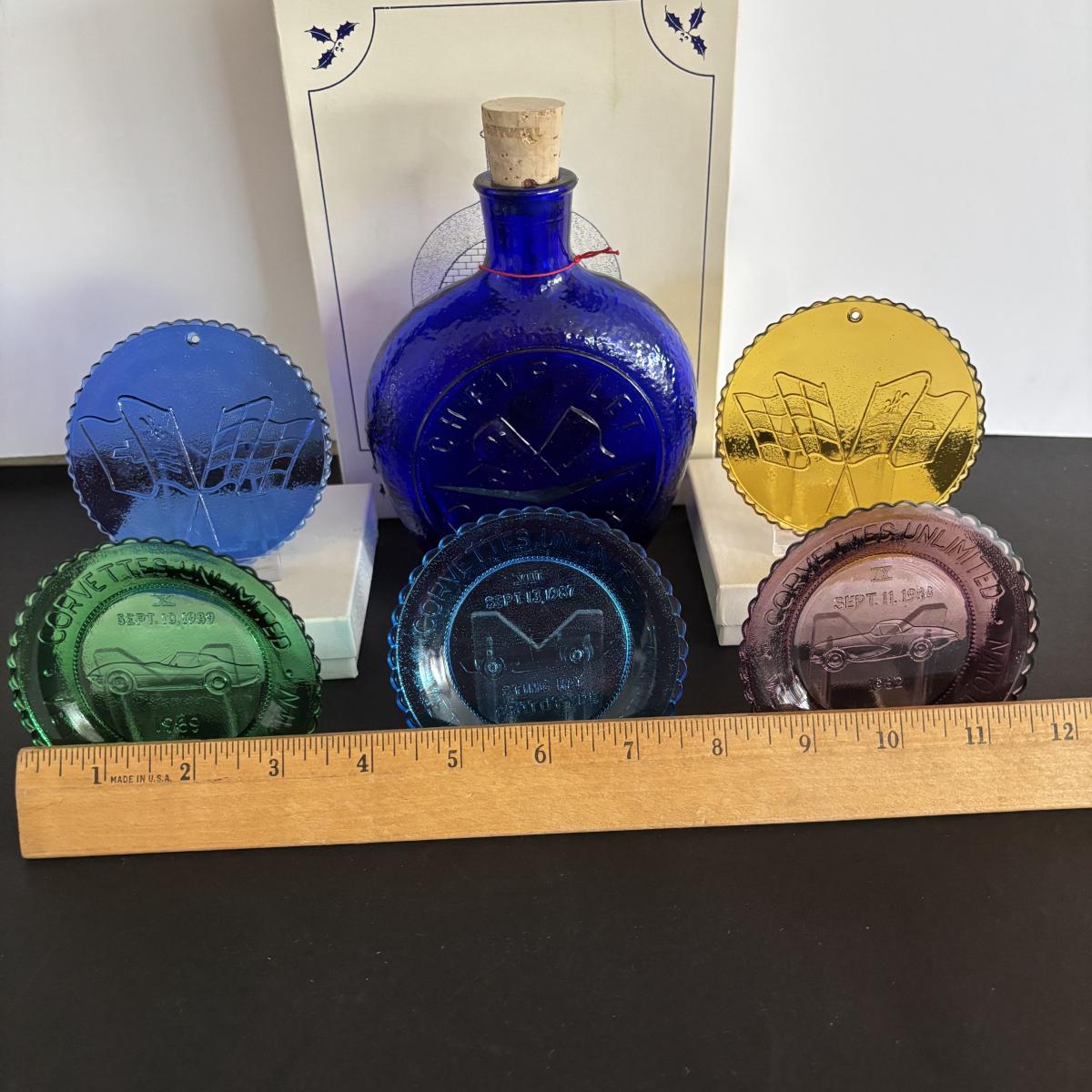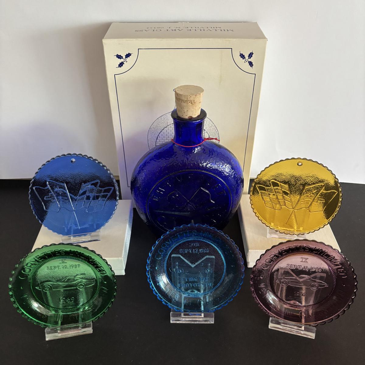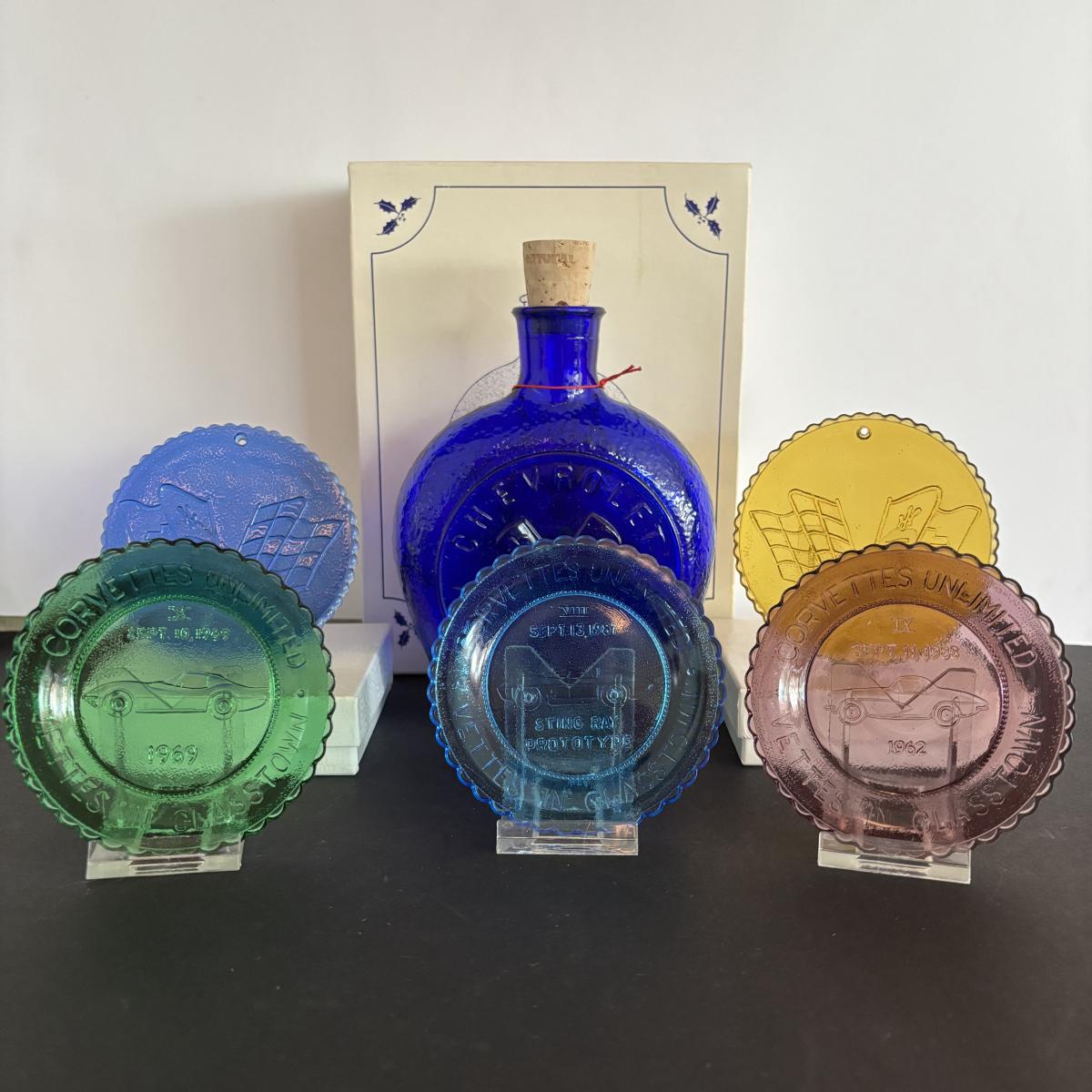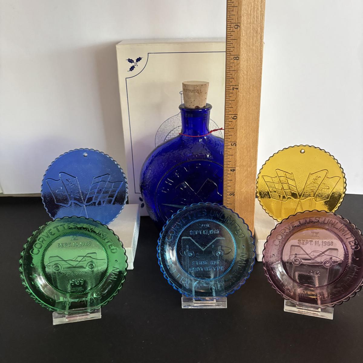 LOT 246: Wheaton Art Glass Cobalt Blue Chevrolet Corvette Decanter, Great American Cars Corvette Paper Weight, Corvettes in Glasstown Souvenir Plates, Chevrolet & Checkered Flag Sun Catchers