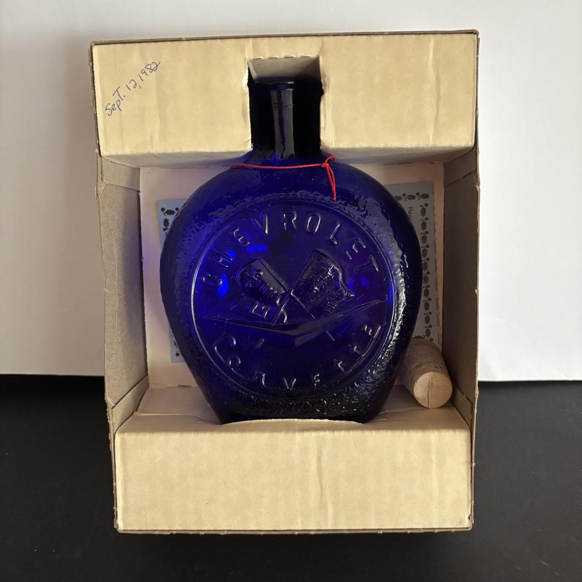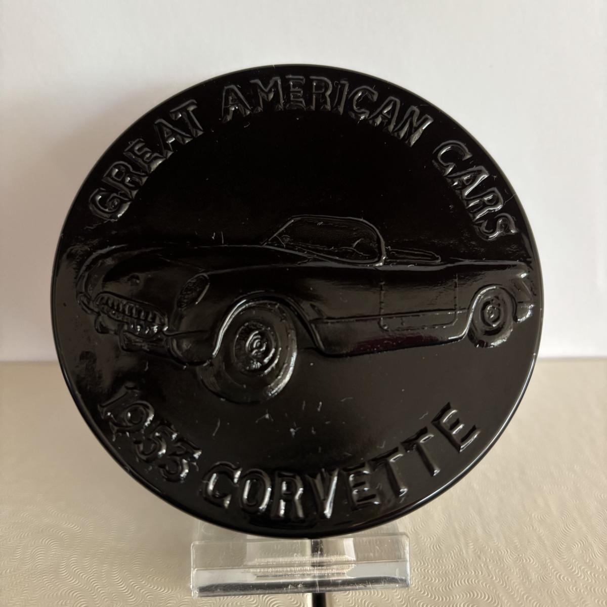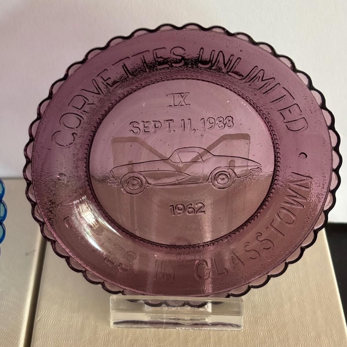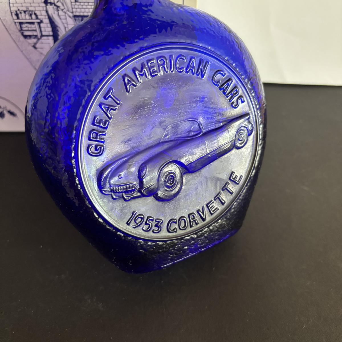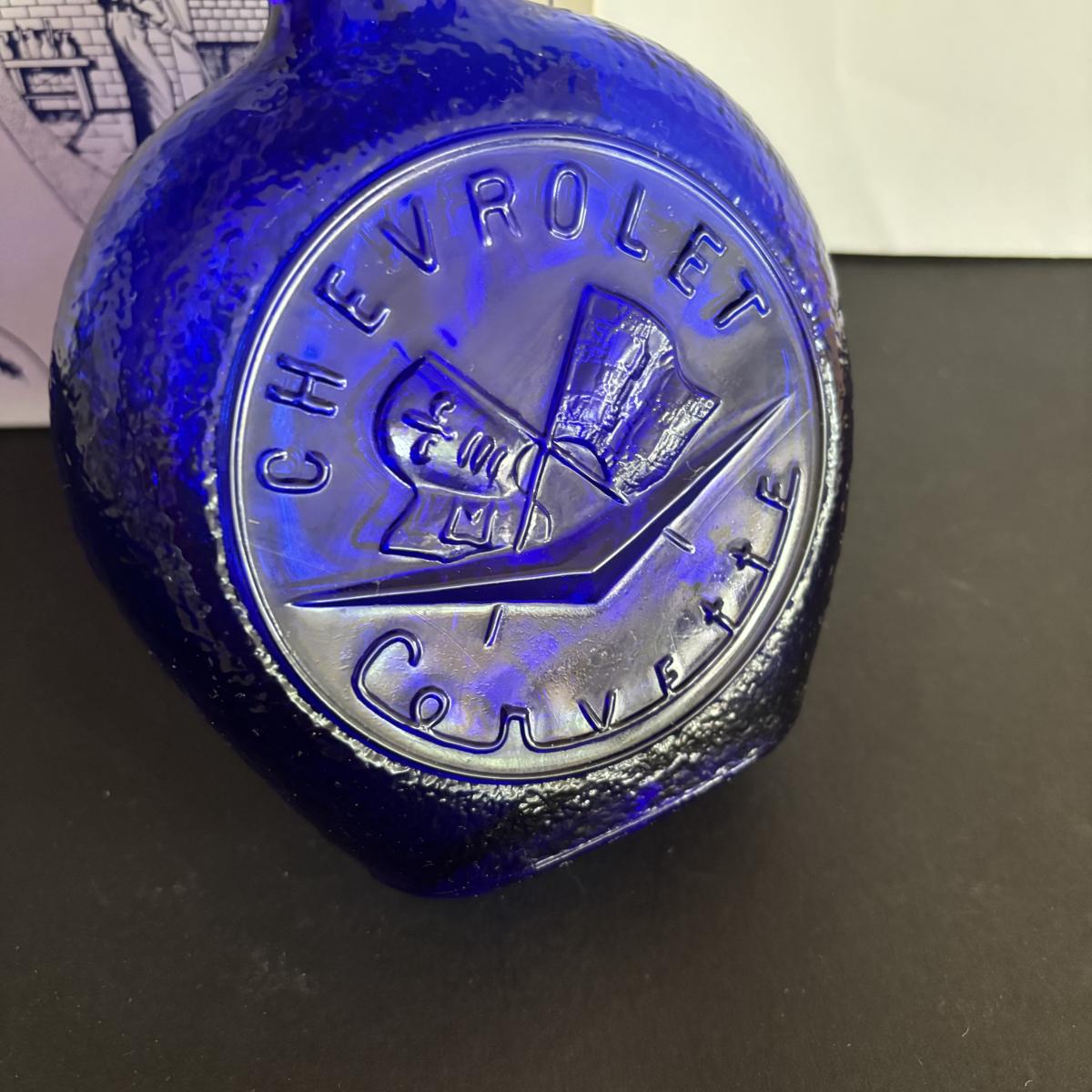 LOT 246: Wheaton Art Glass Cobalt Blue Chevrolet Corvette Decanter, Great American Cars Corvette Paper Weight, Corvettes in Glasstown Souvenir Plates, Chevrolet & Checkered Flag Sun Catchers