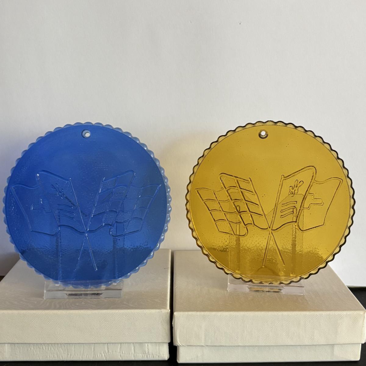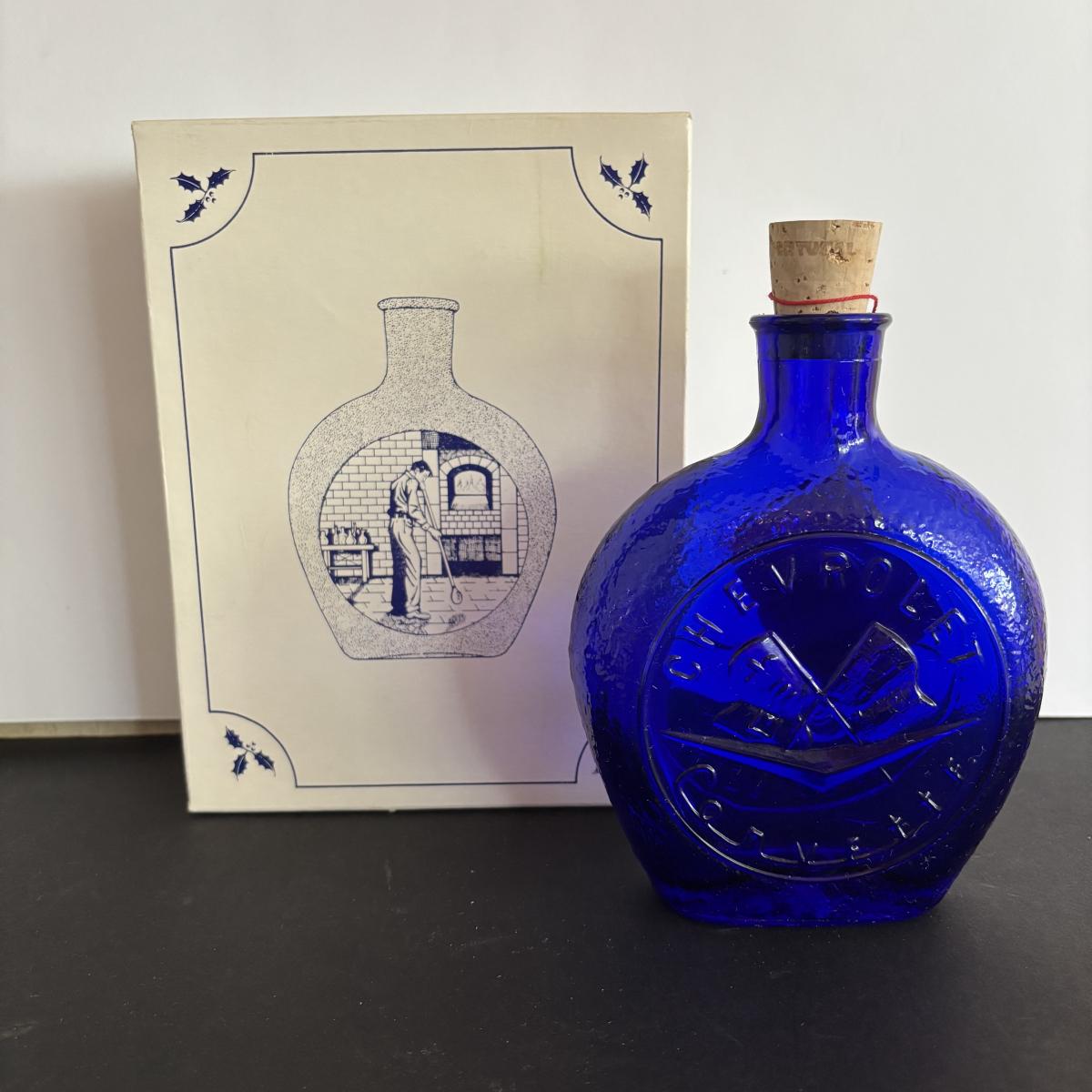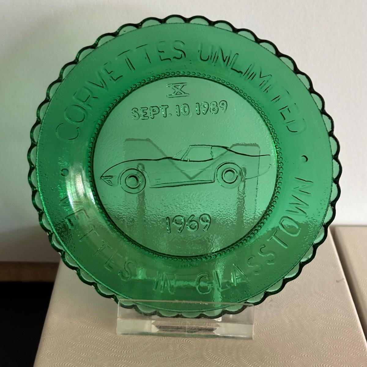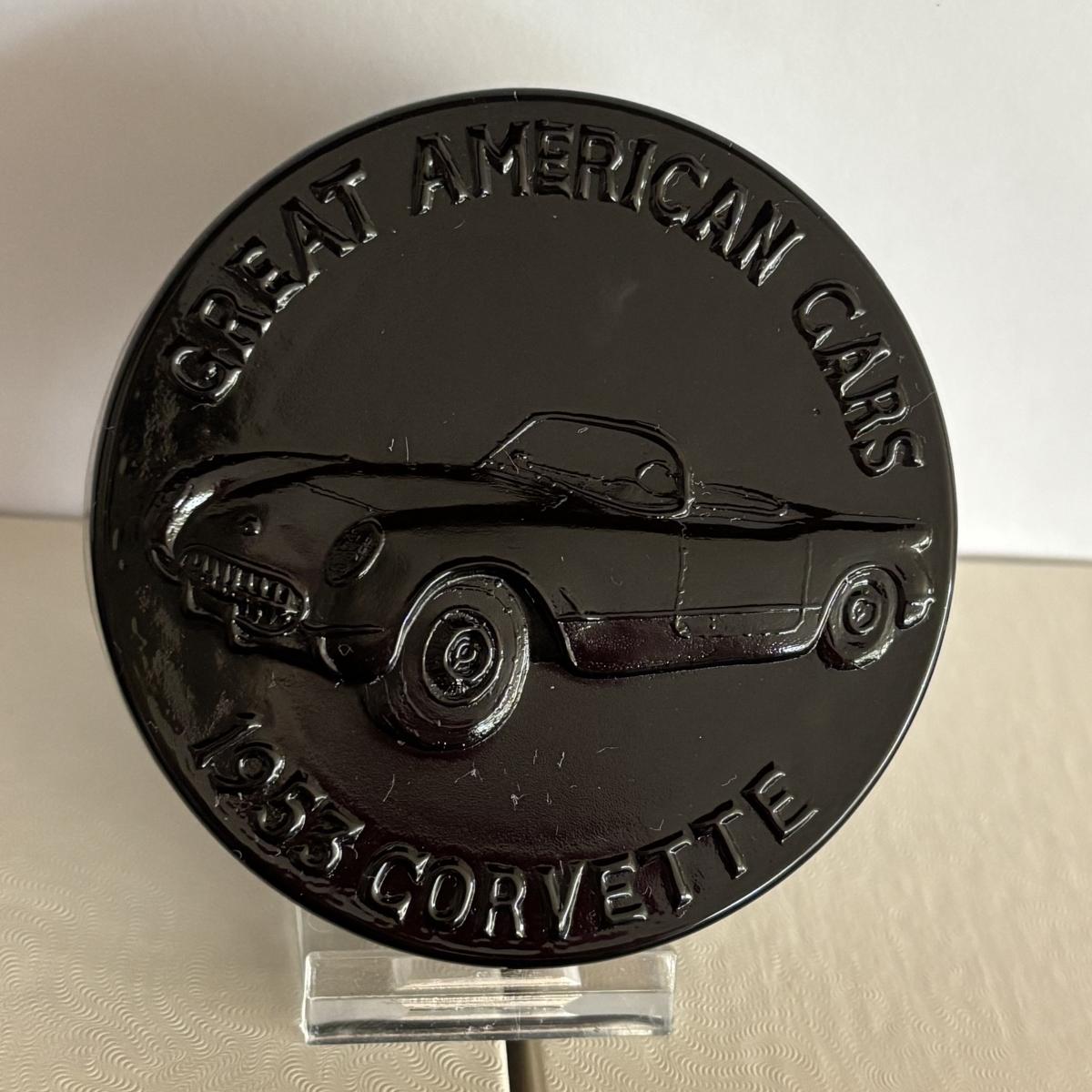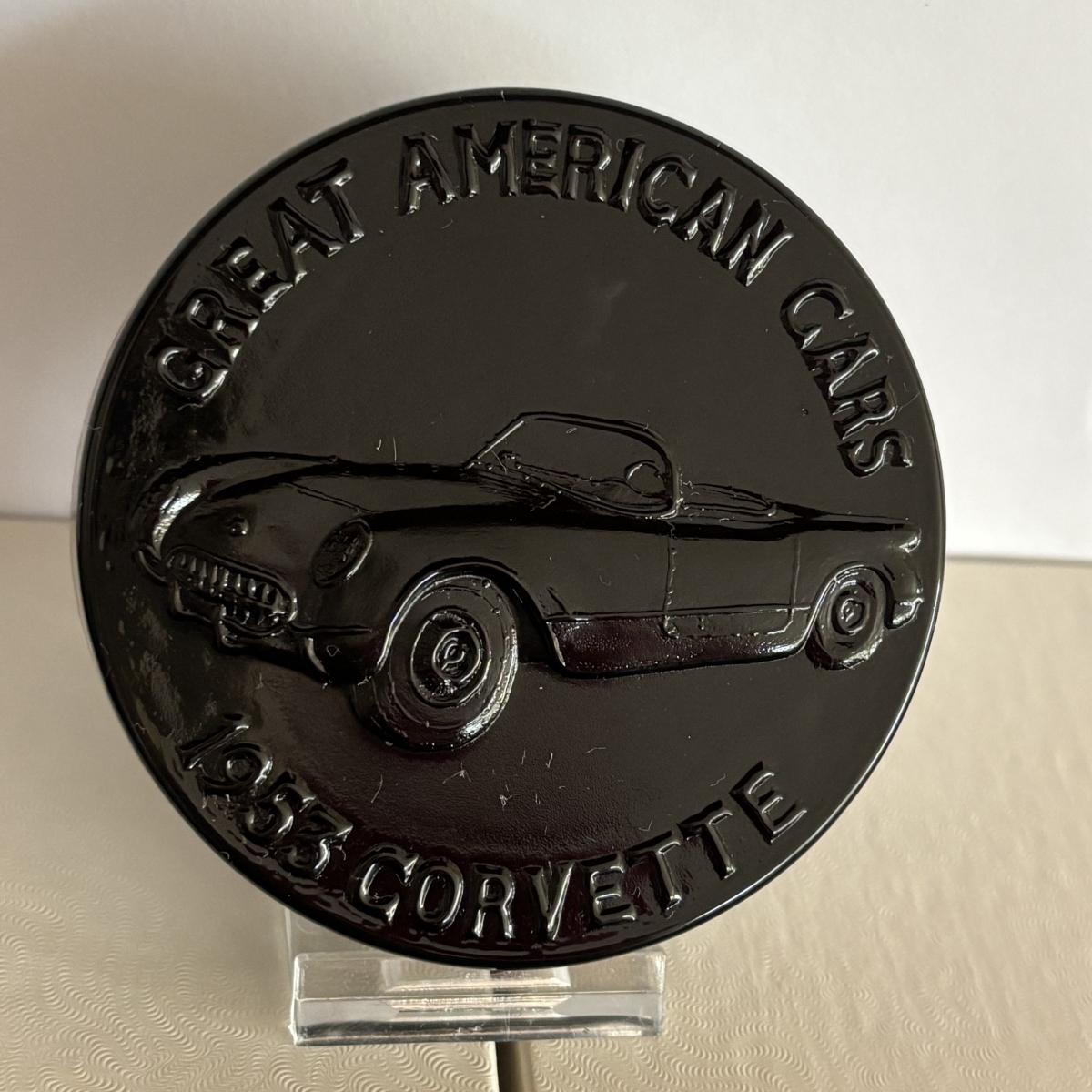 LOT 246: Wheaton Art Glass Cobalt Blue Chevrolet Corvette Decanter, Great American Cars Corvette Paper Weight, Corvettes in Glasstown Souvenir Plates, Chevrolet & Checkered Flag Sun Catchers