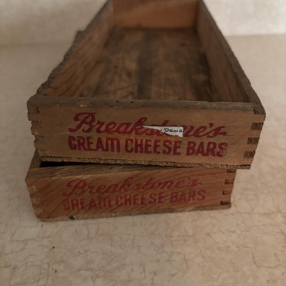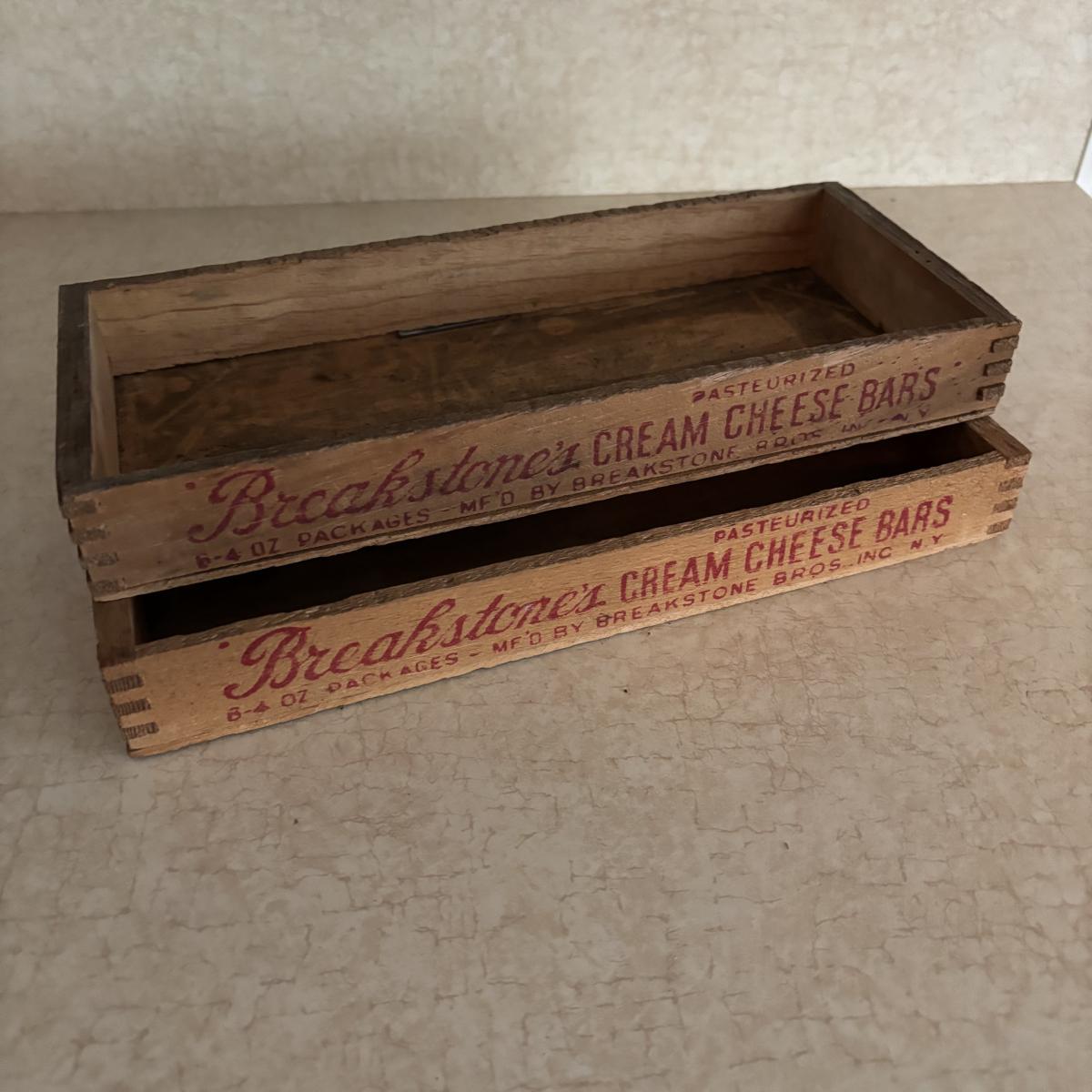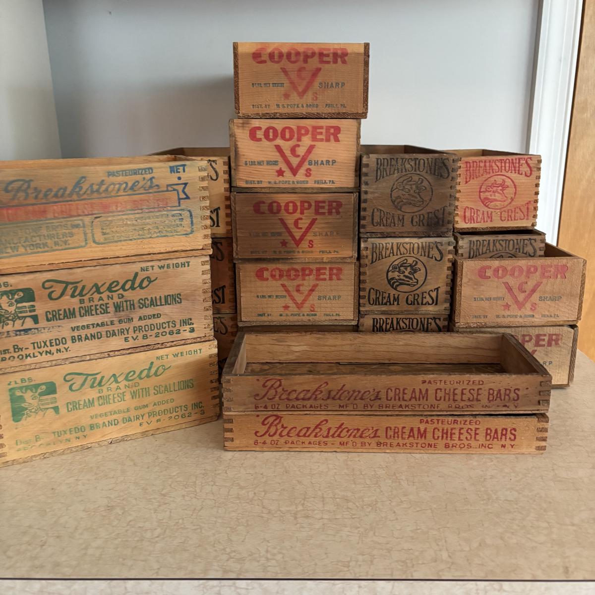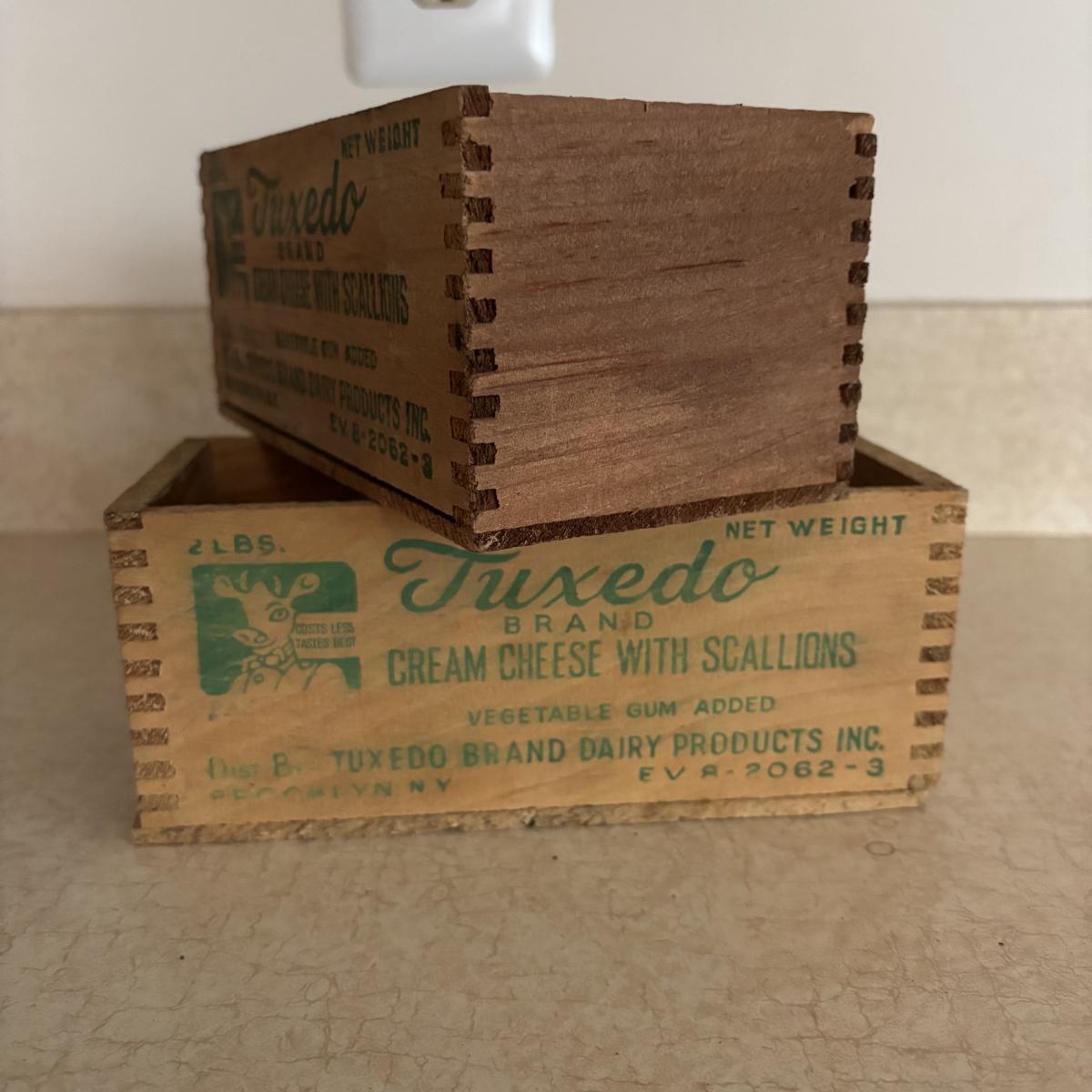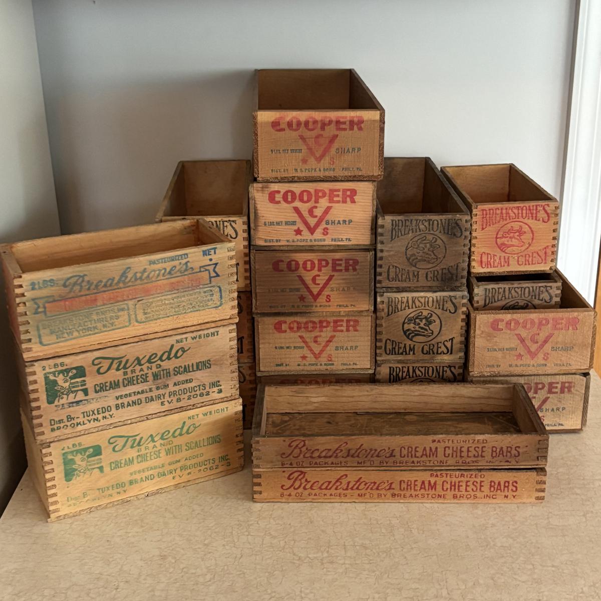 LOT 248: Vintage Wood Boxes: Cooper Sharp Cheese, Breakstone's Cream Cheese, Tuxedo Brand Cream Cheese