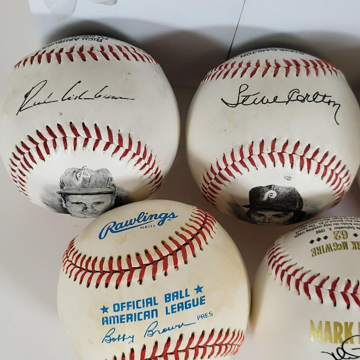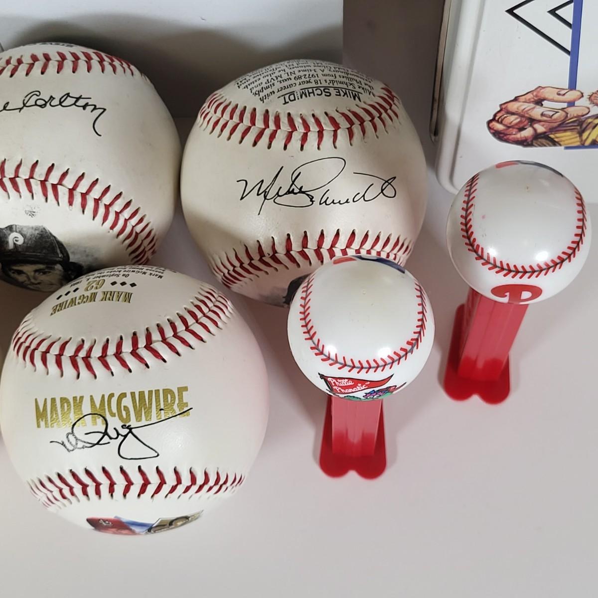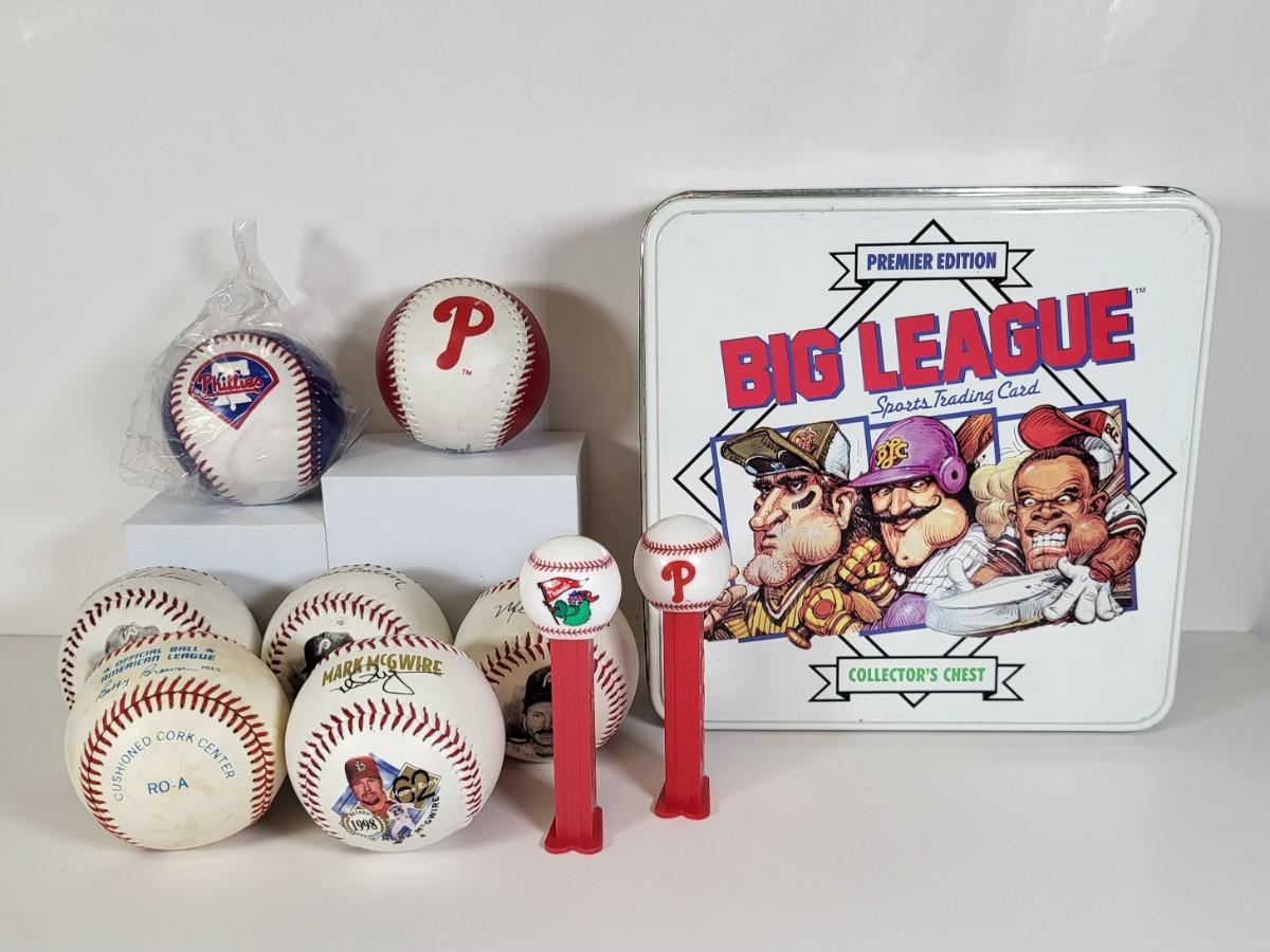 LOT 84: Baseball Memorabilia Lot Including Facsimile Autographs, Baseballs, Rare Big League Collectors Tin and More