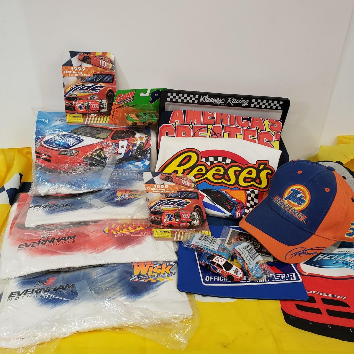 LOT 118: Huge Nascar Collection; Tshirts, Hats, Toy Cars, Flag & More