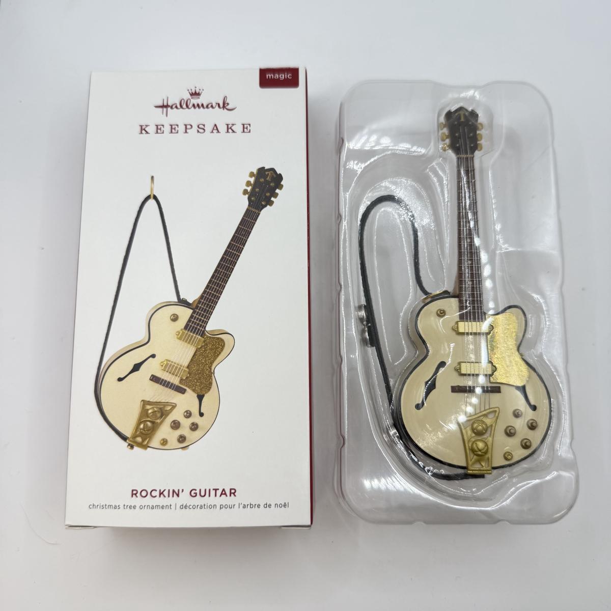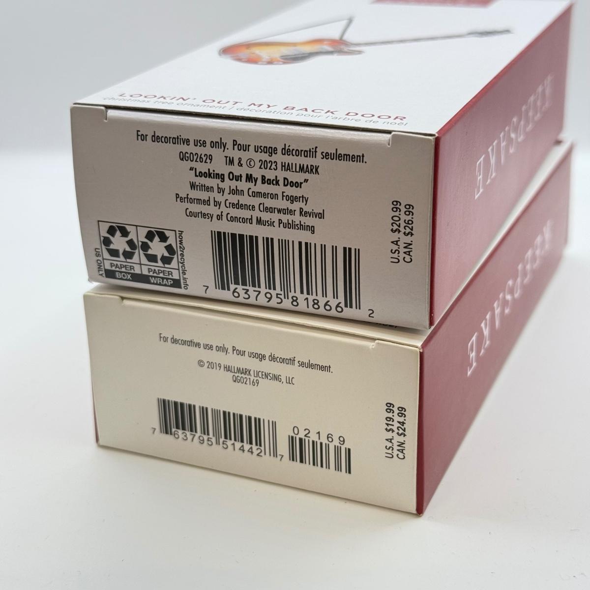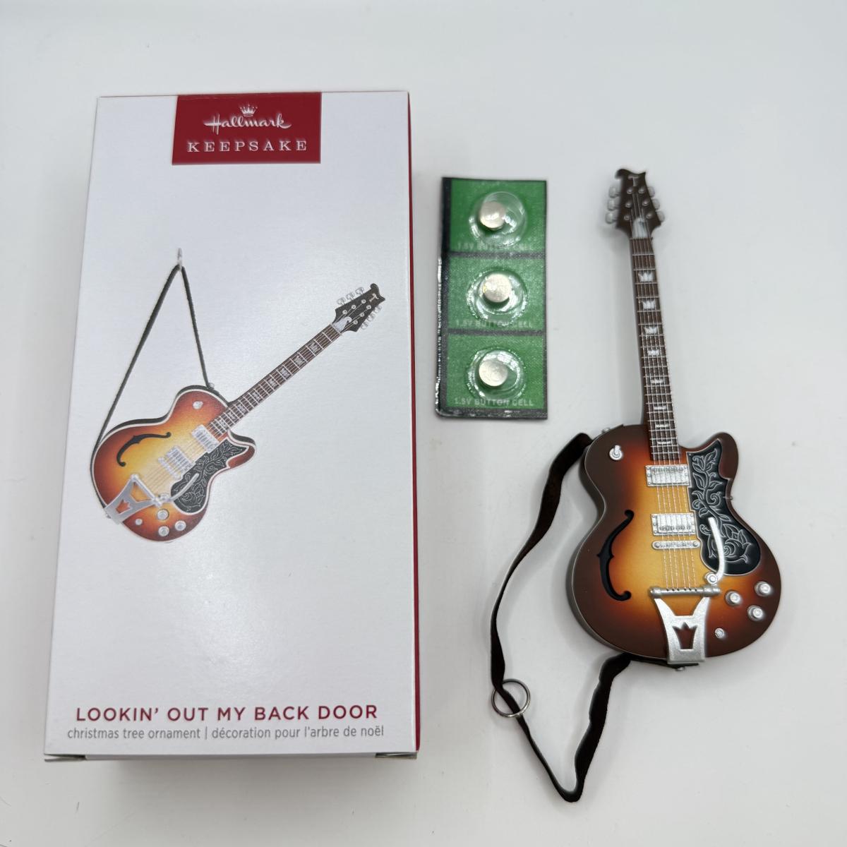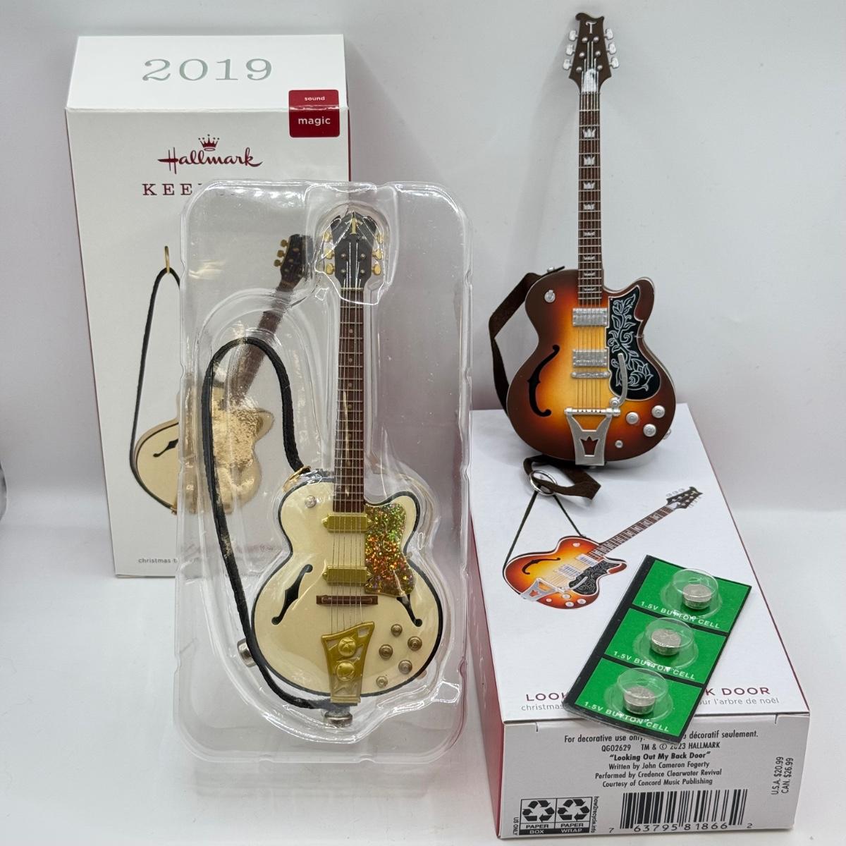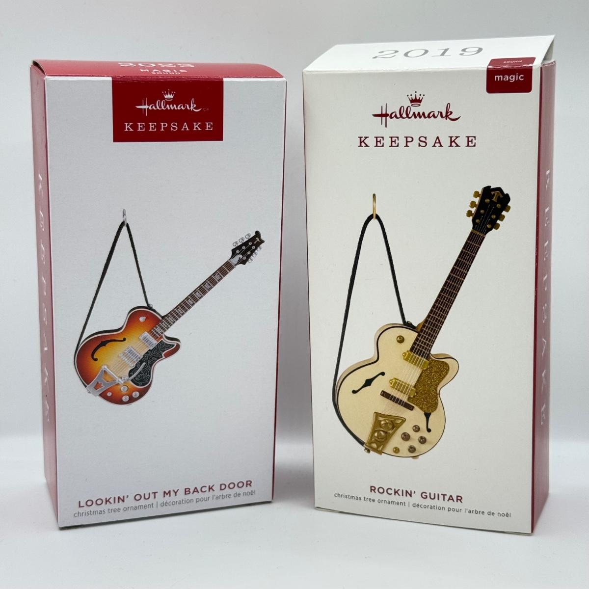 LOT 172: Hallmark Keepsake Guitar Ornaments in Boxes: 2023 Lookin' Out My Back Door & 2019 Rockin' Guitar