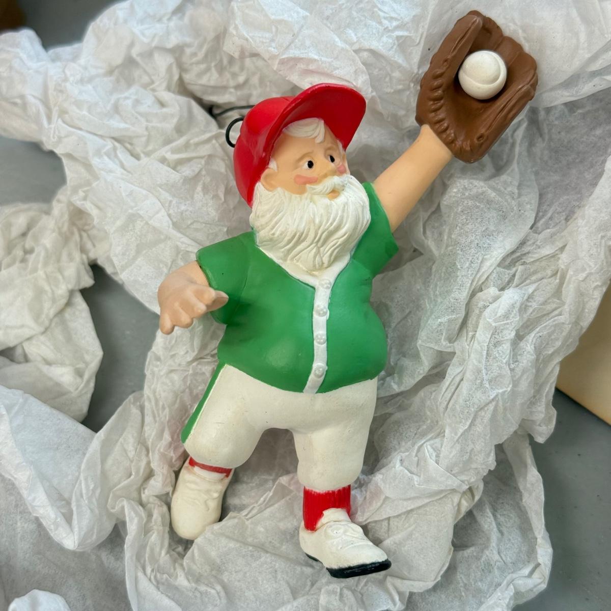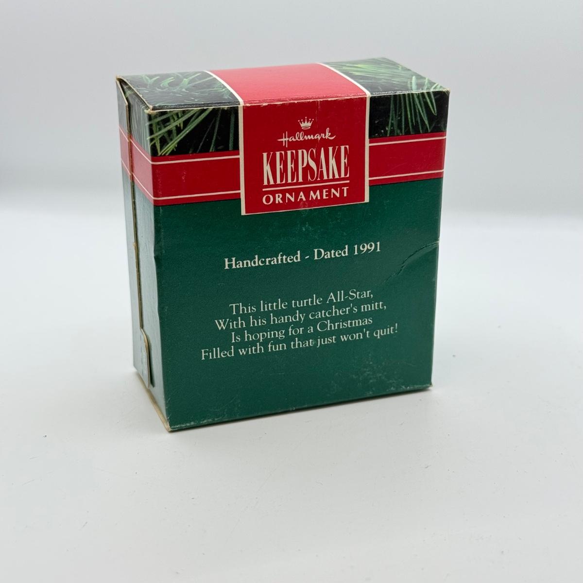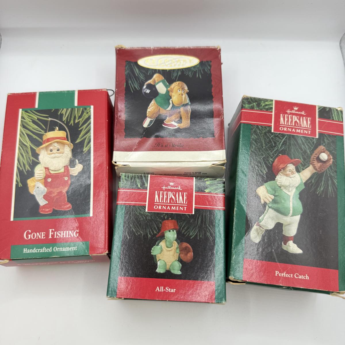LOT 177: Hallmark Keepsake Ornaments in Boxes: Bowling Monkey, Baseball & Fishing Santas & Turtle All Star