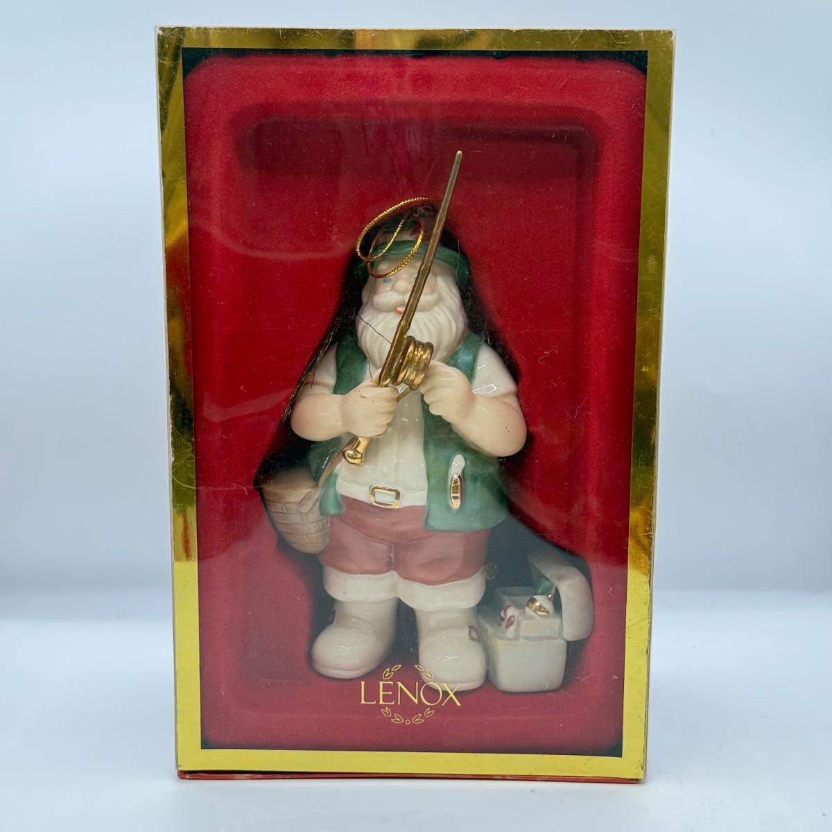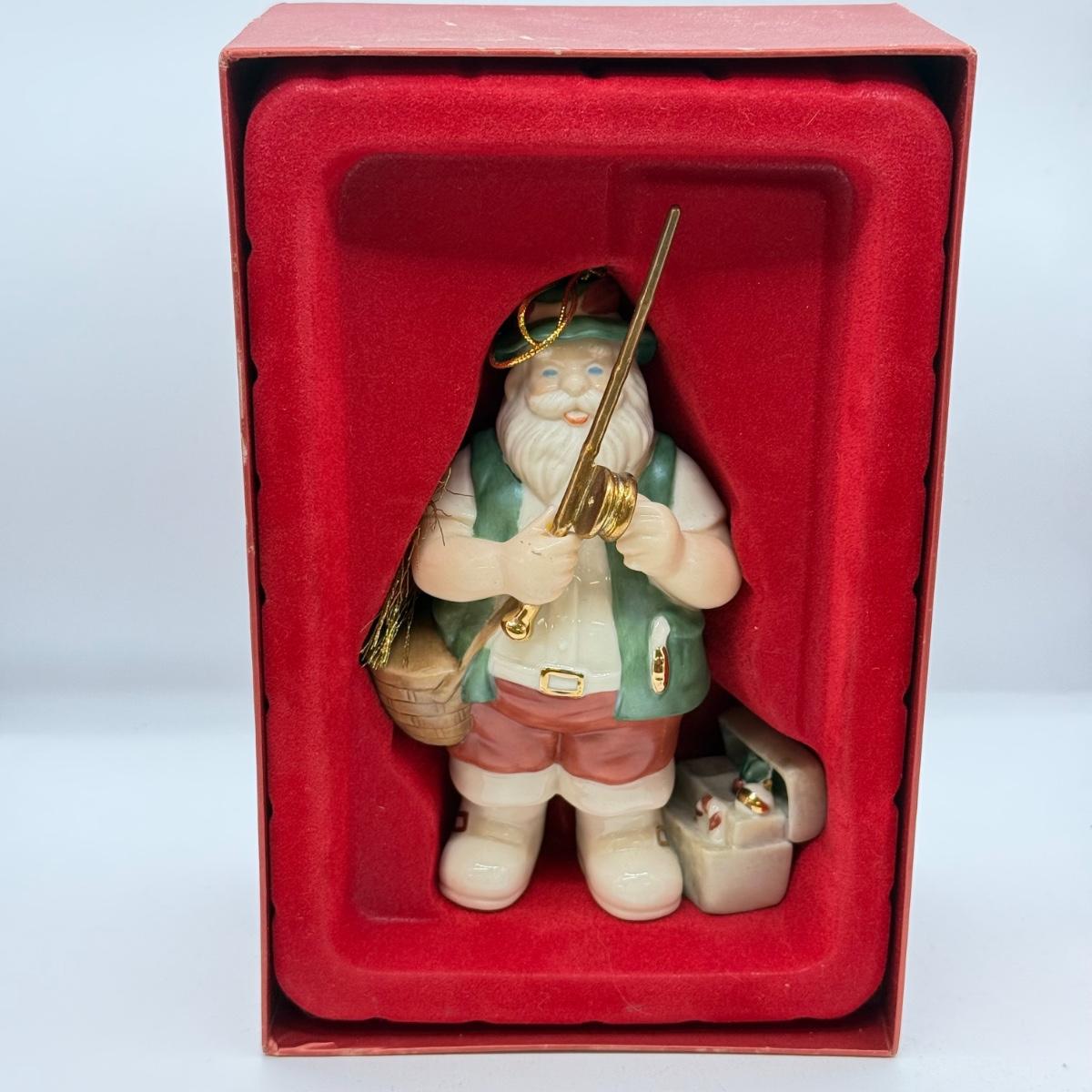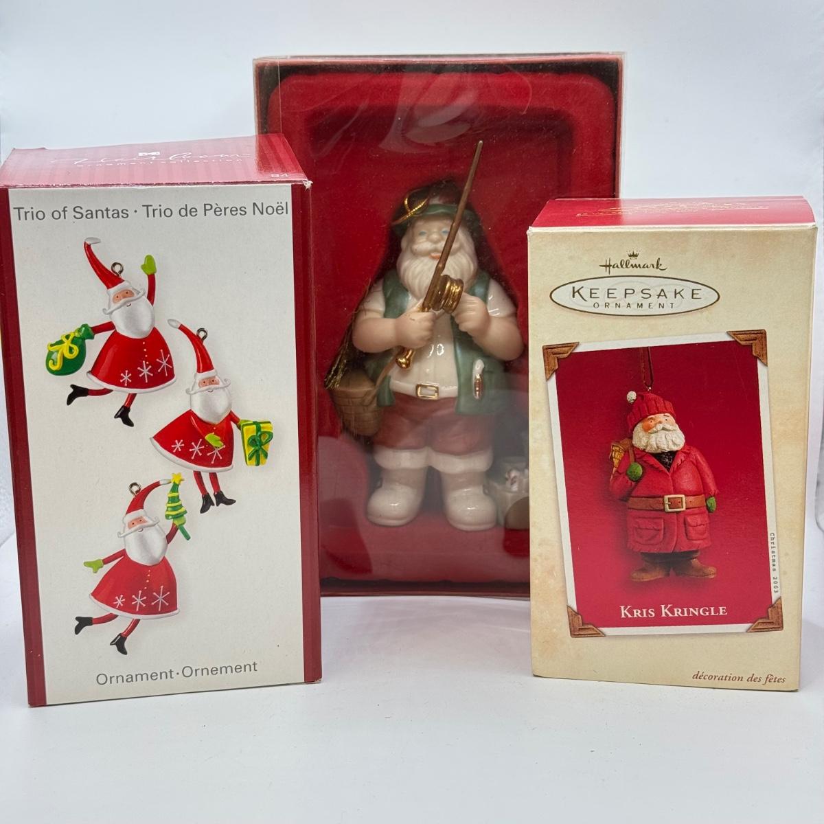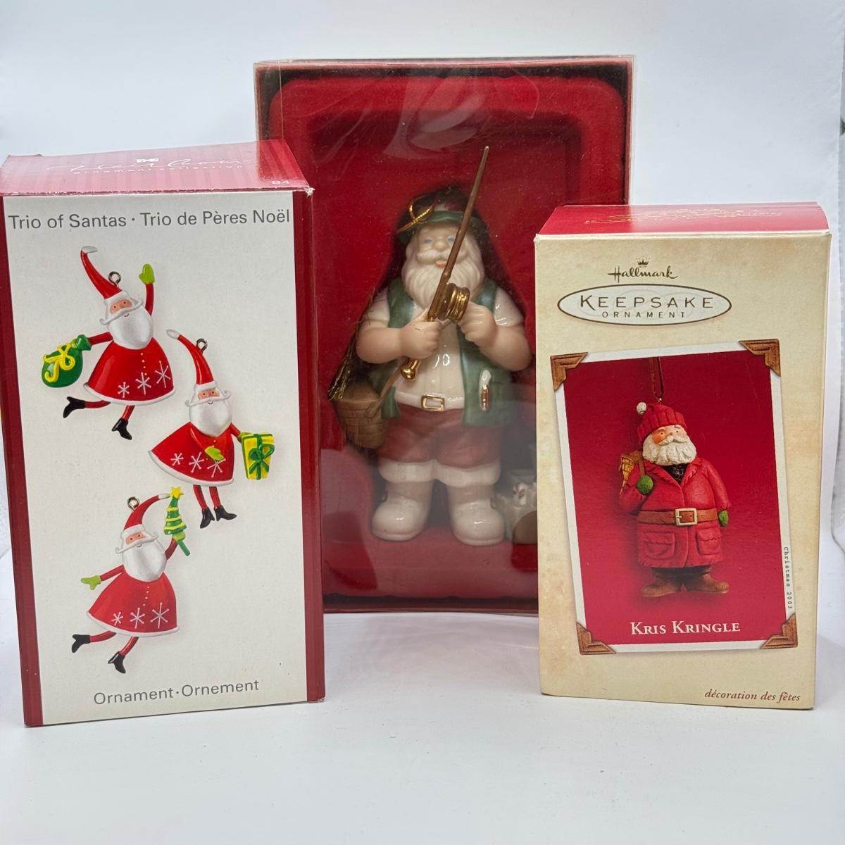 LOT 178: Lenox Fishing Santa, Hallmark Keepsake Ornament Kris Kringle & Trio of Santas all in Boxes