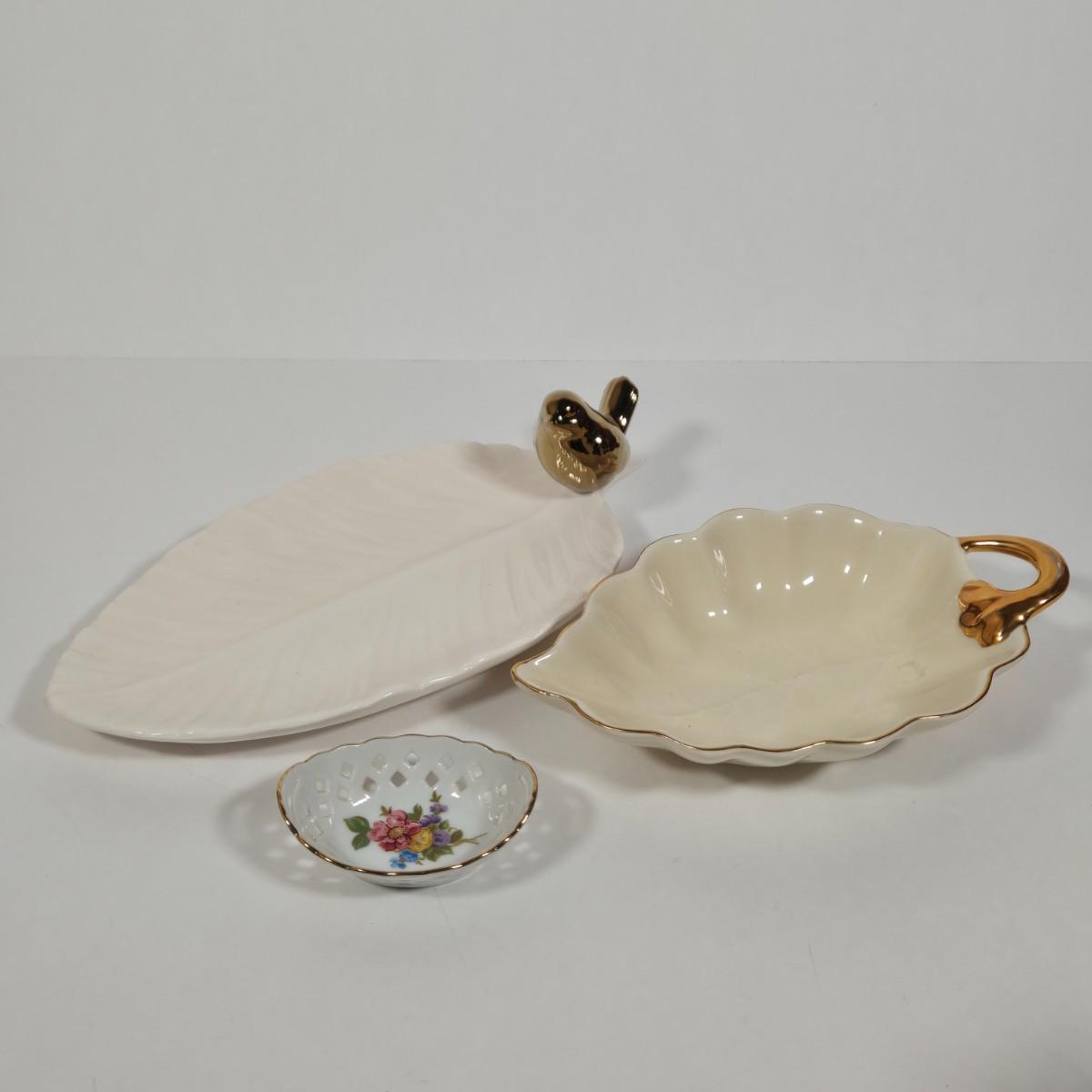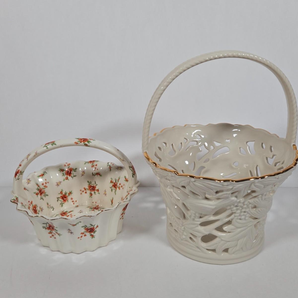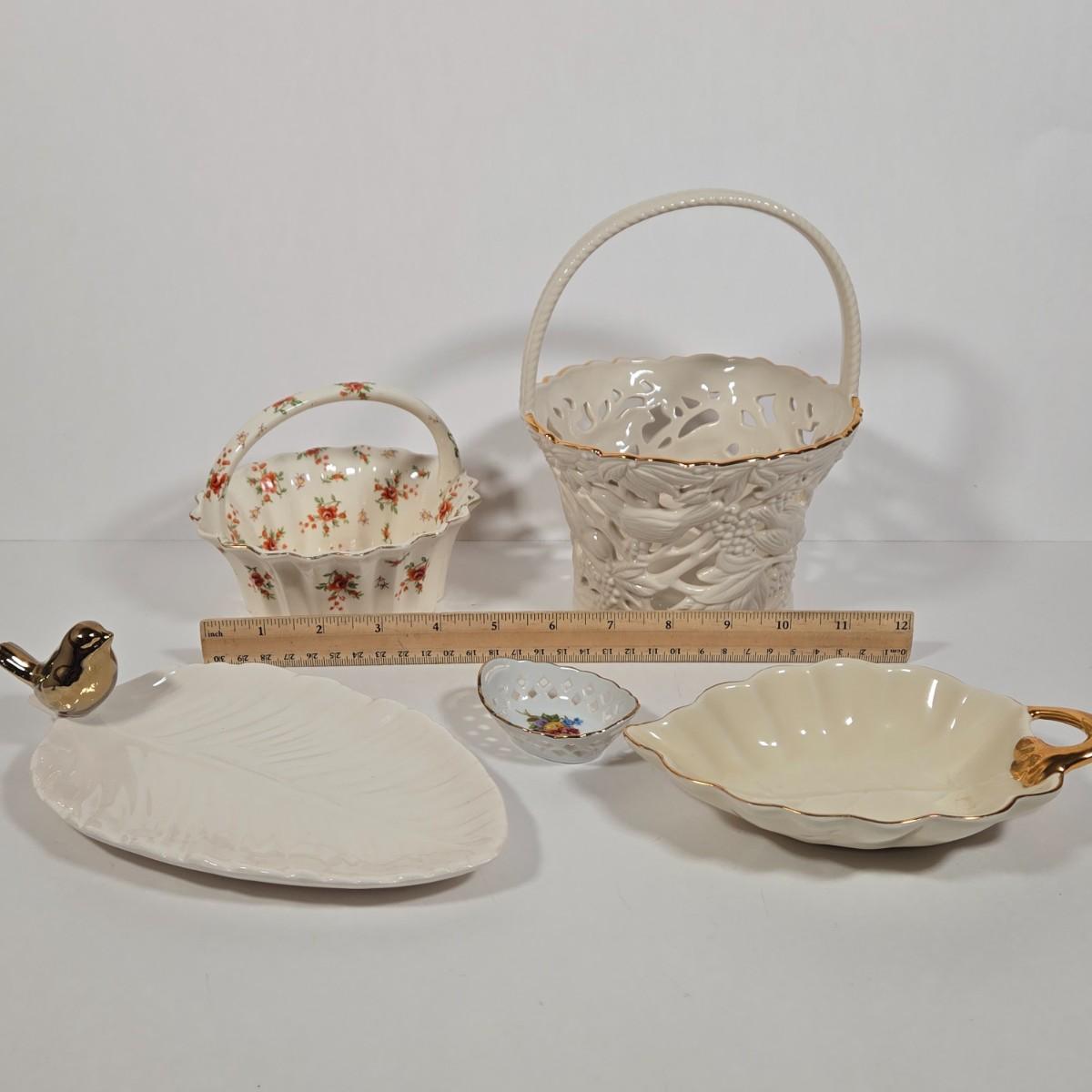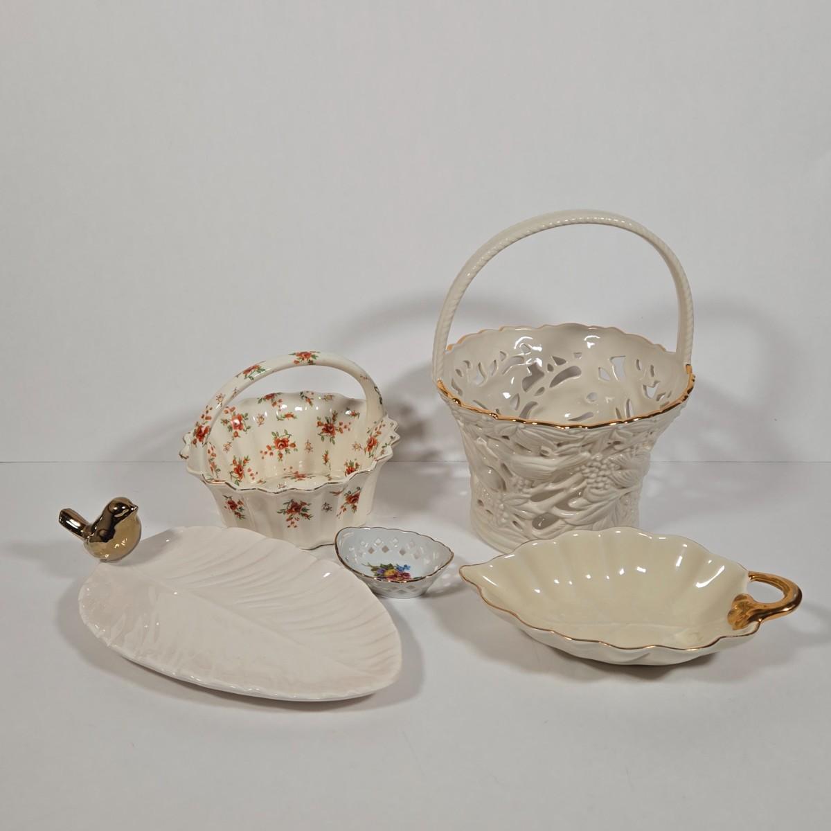 LOT 10D: Vintage Japan Moriyama Mori-Machi Chintz Candy Dish, Lenox Filigree Forest Basket, Reutter Porzellan Germany Miniature Basket, & More