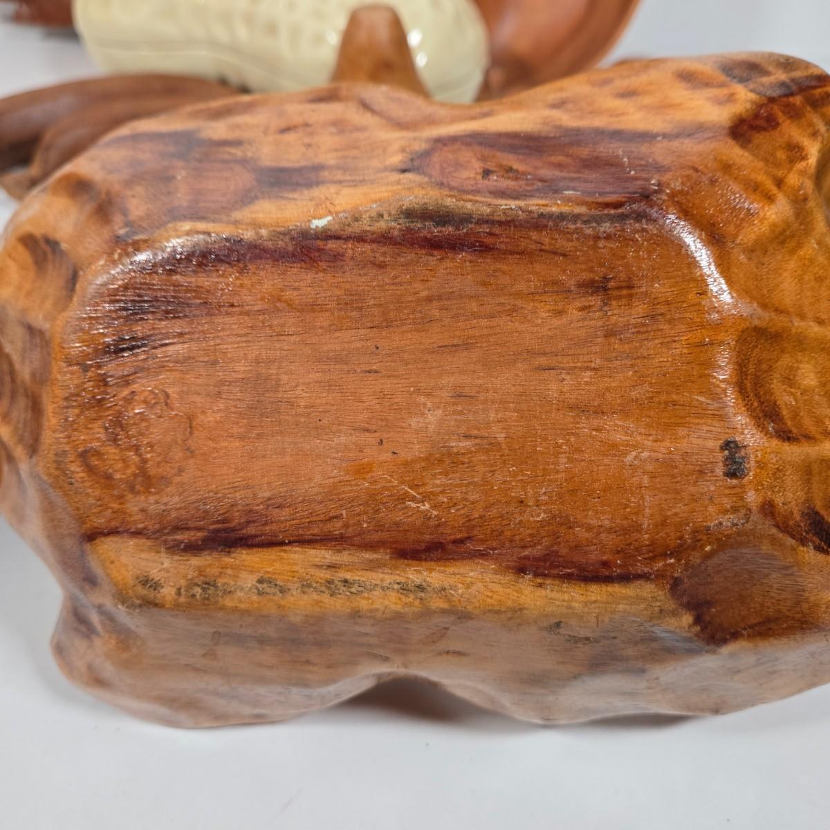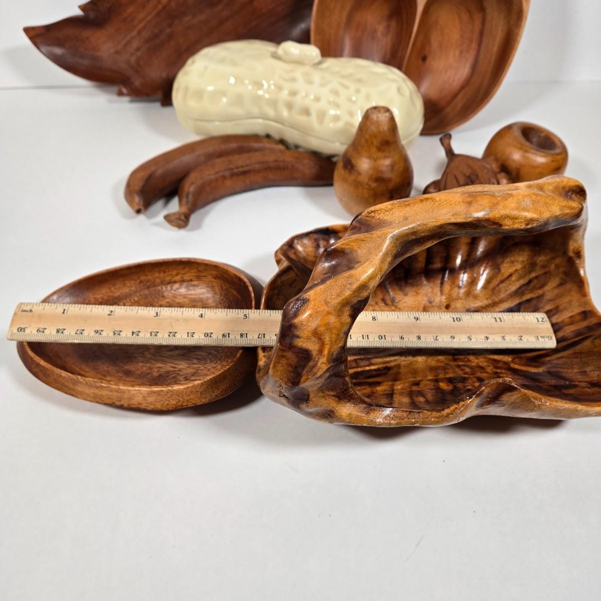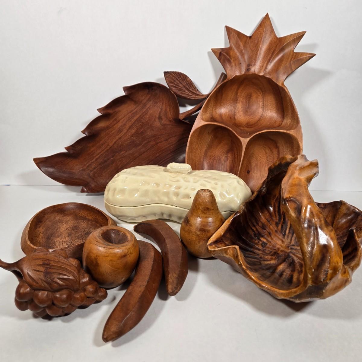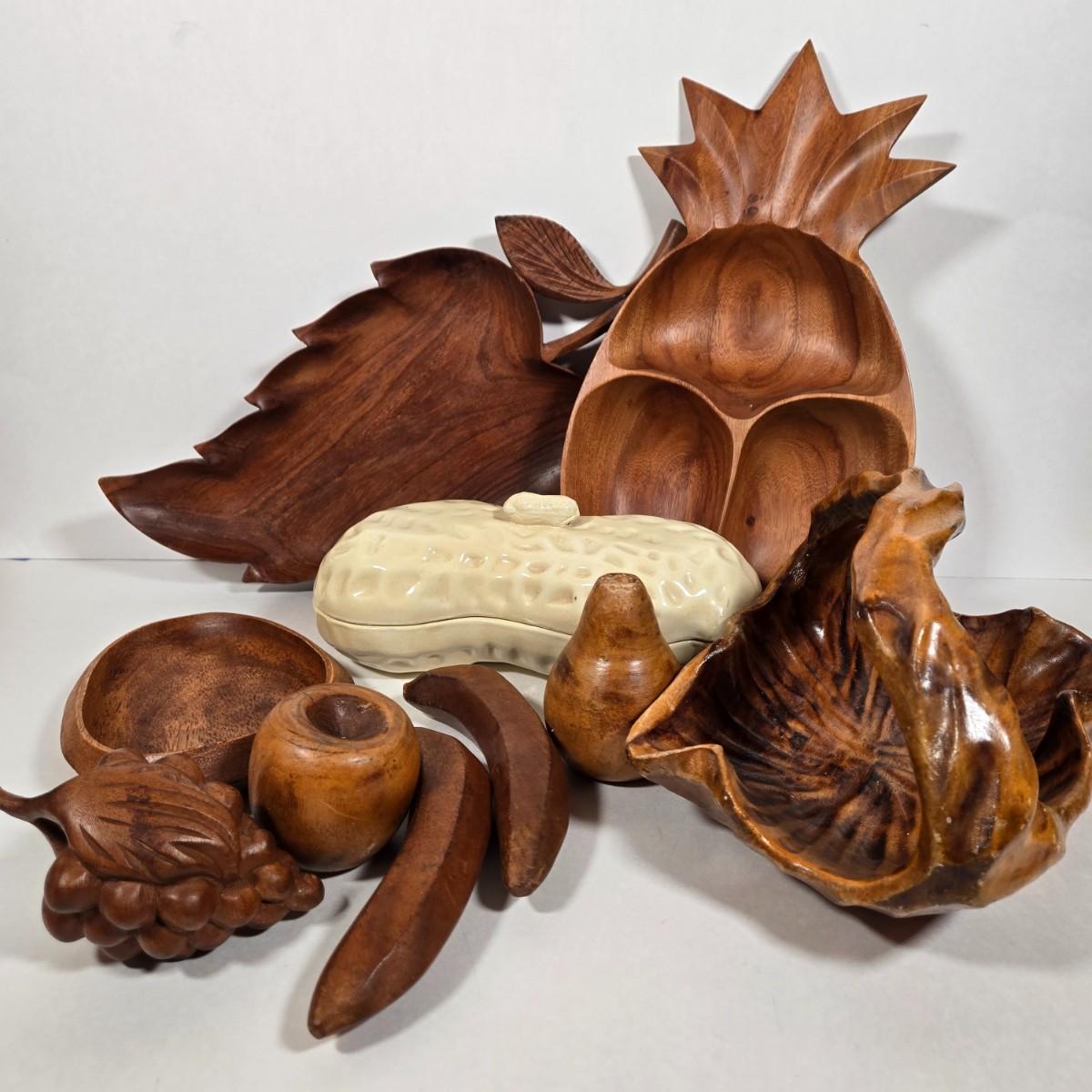 LOT 11D: Wooden Trays, Basket, & Fruit, and Covered Ceramic Peanut Candy Dish