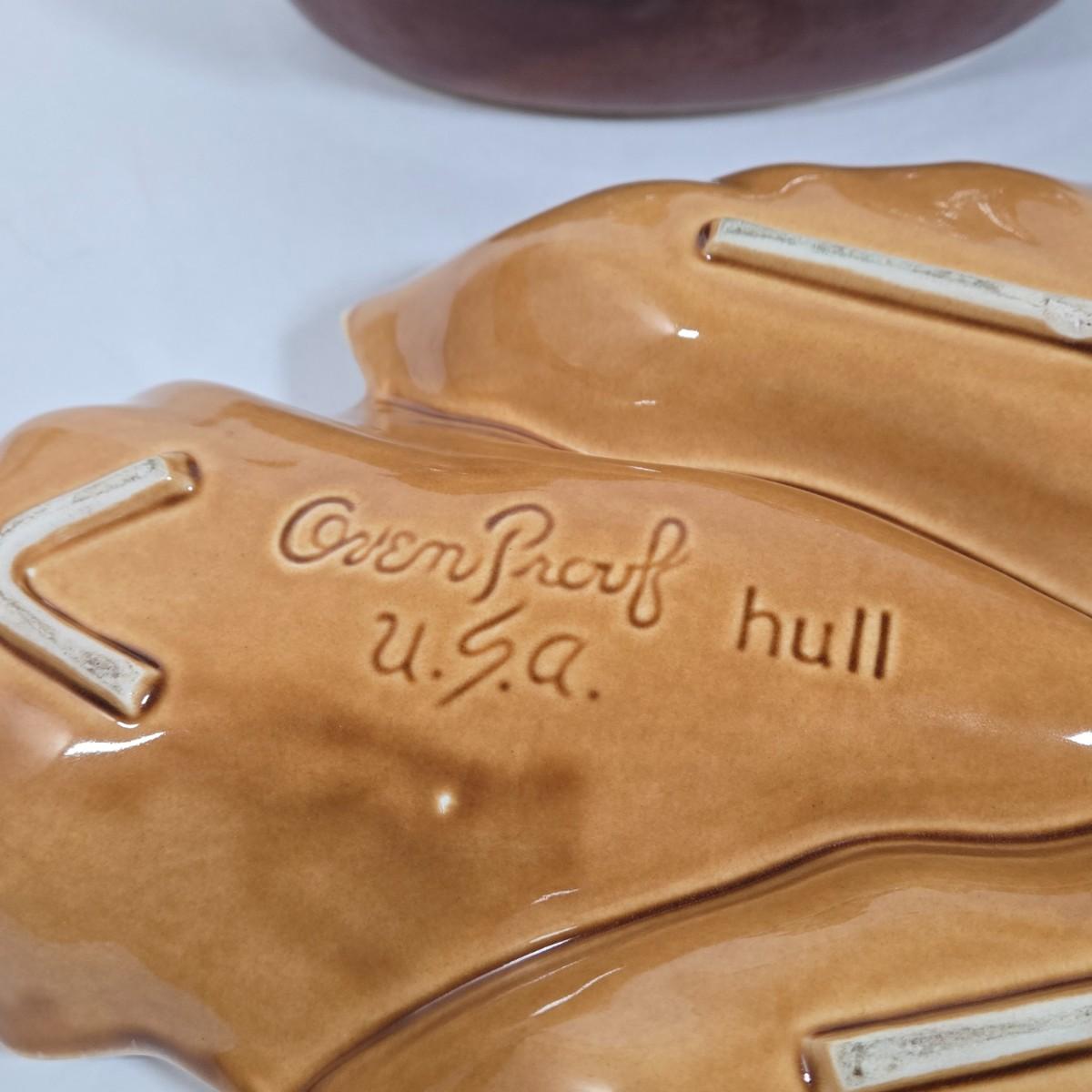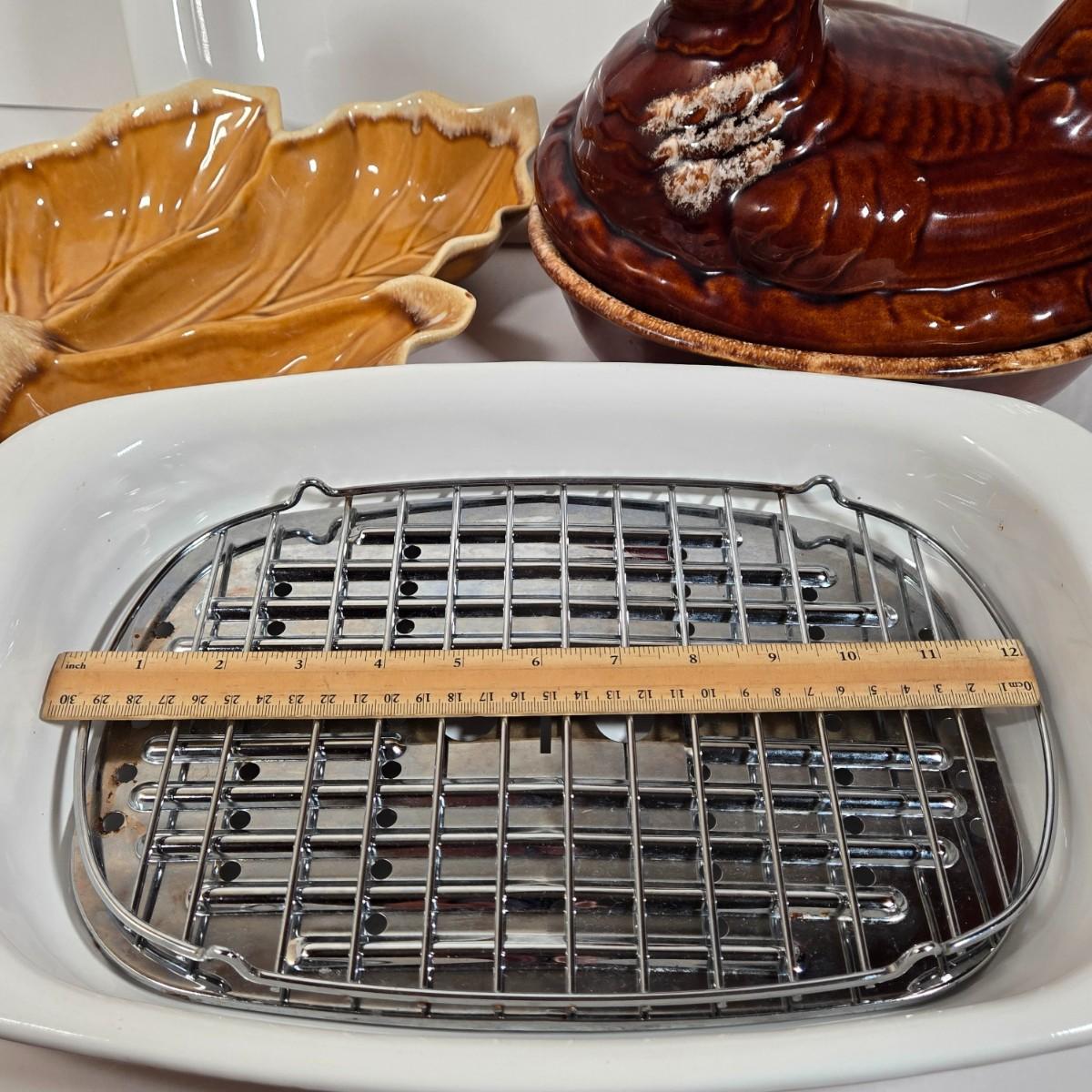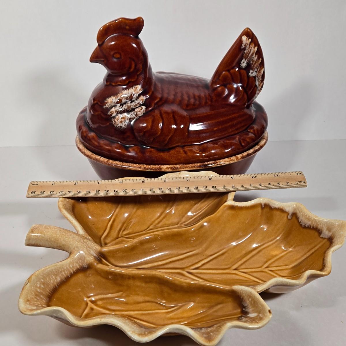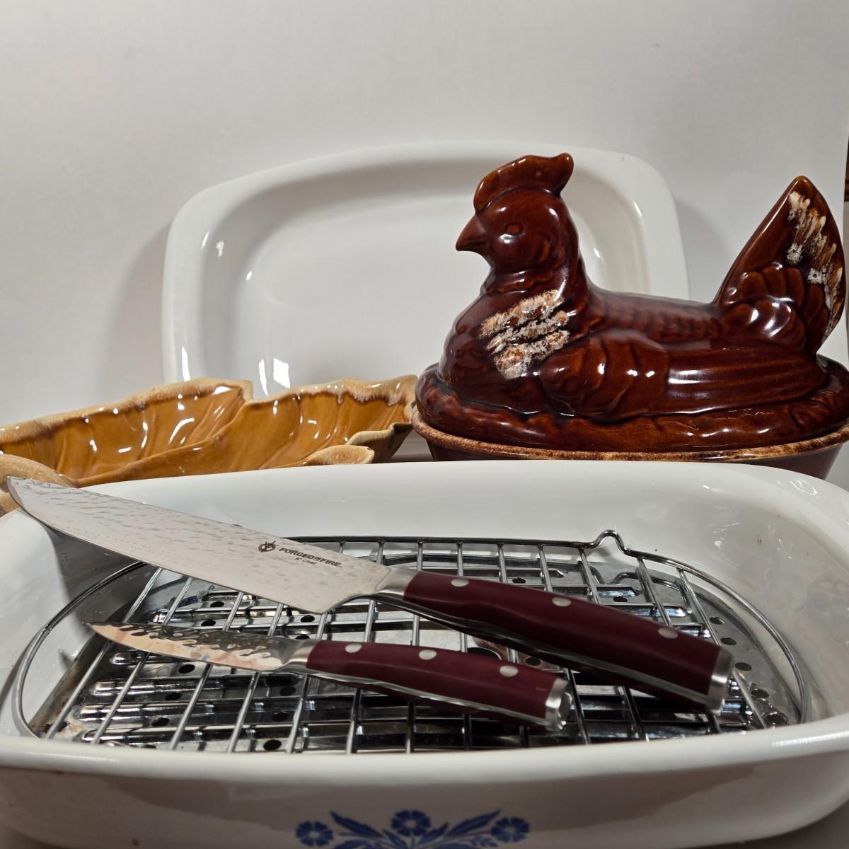 LOT 17D: Two Corning Ware Casserole Dishes with Racks, Hull Pottery Chicken on Nest Casserole Dish & Divided Leaf Dish, and 2 Forged in Fire Knives