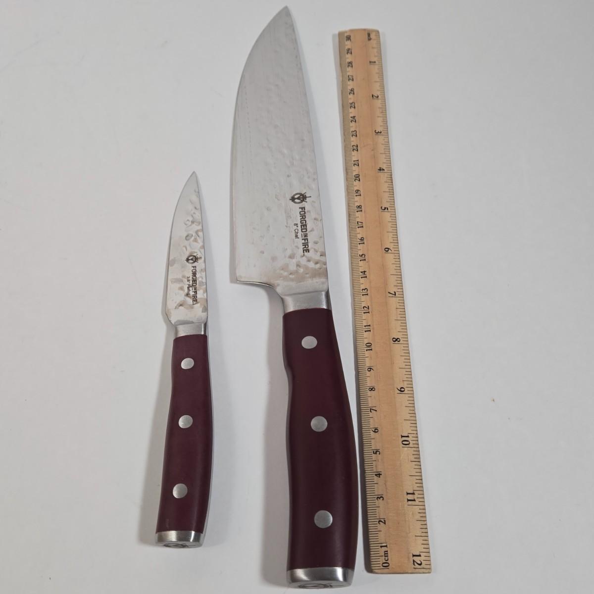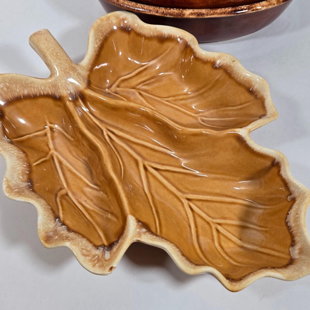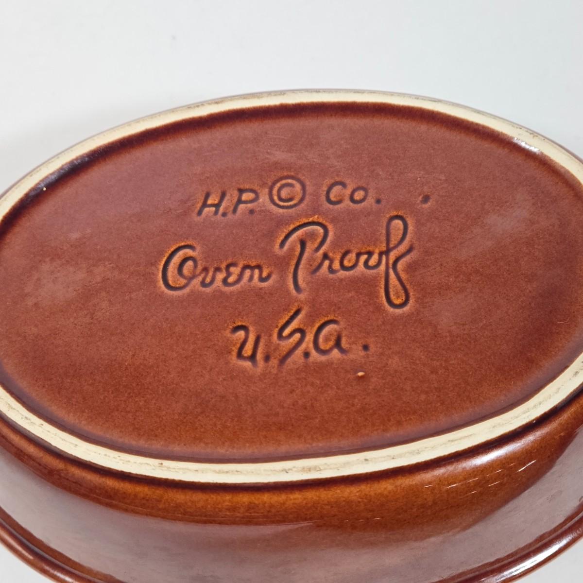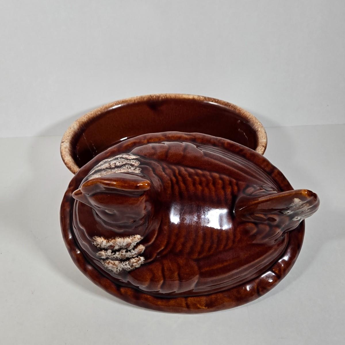 LOT 17D: Two Corning Ware Casserole Dishes with Racks, Hull Pottery Chicken on Nest Casserole Dish & Divided Leaf Dish, and 2 Forged in Fire Knives