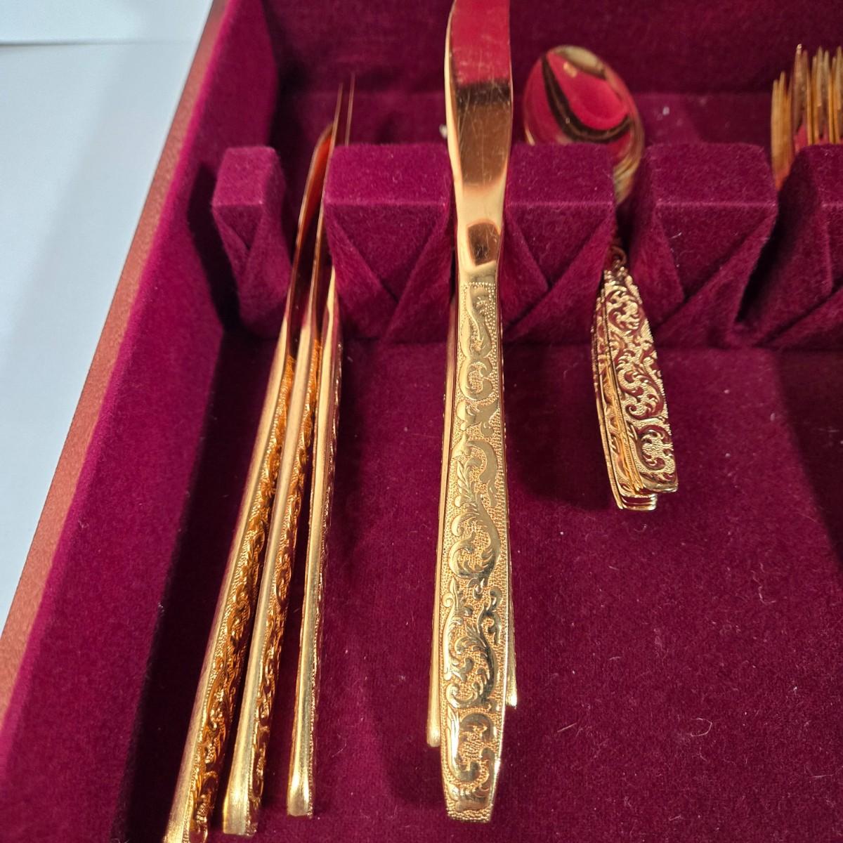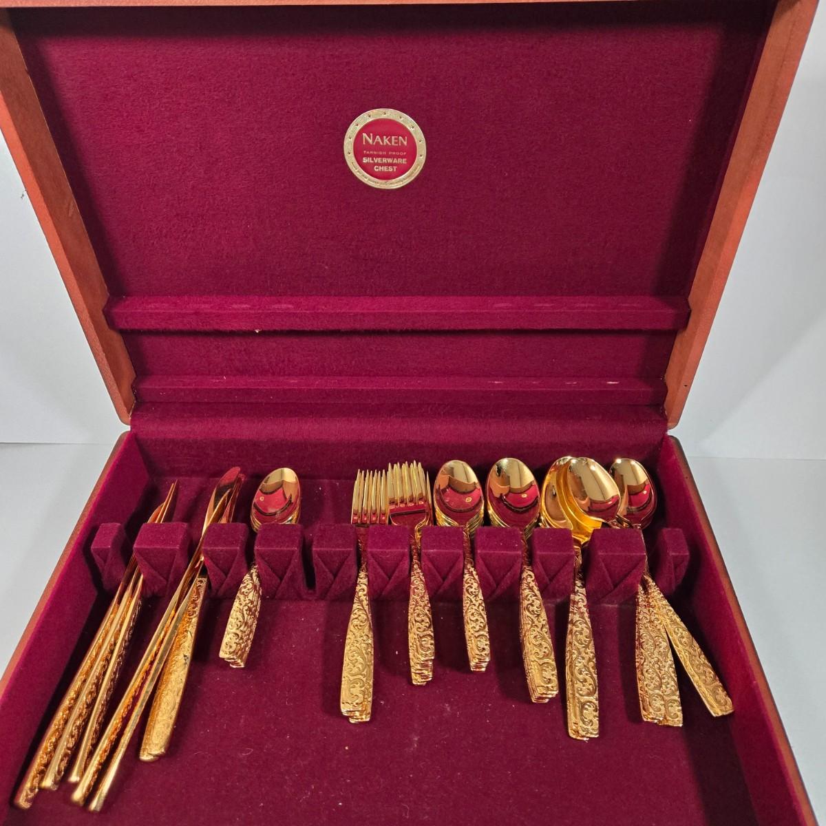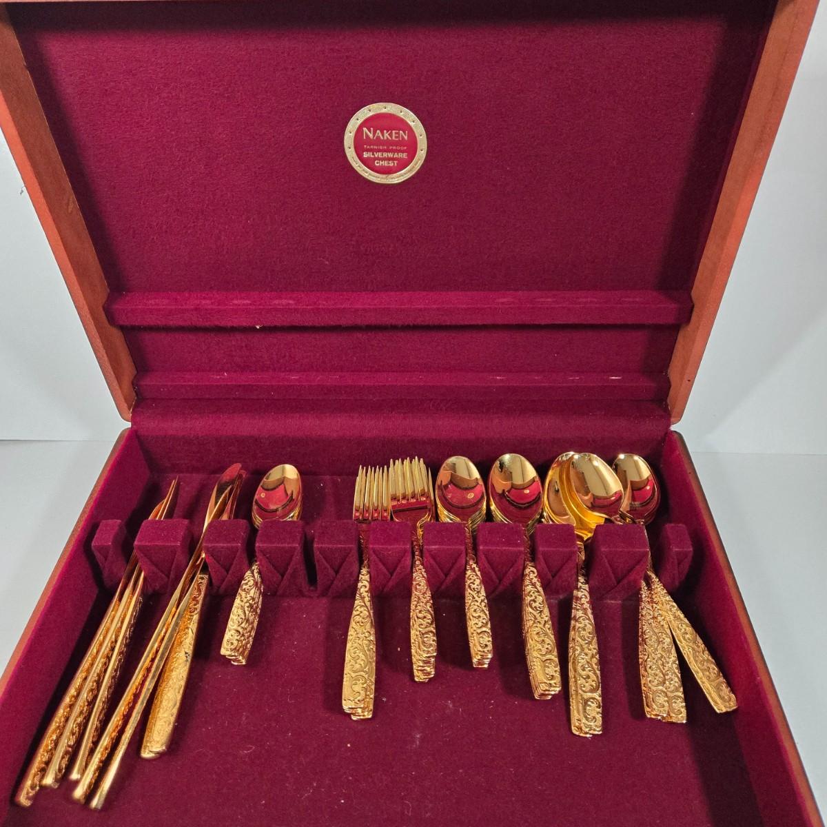 LOT 29D: Naken Gold Flatware Set in Wood Chest