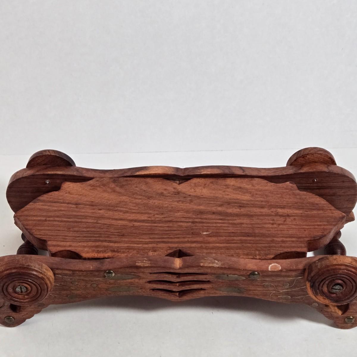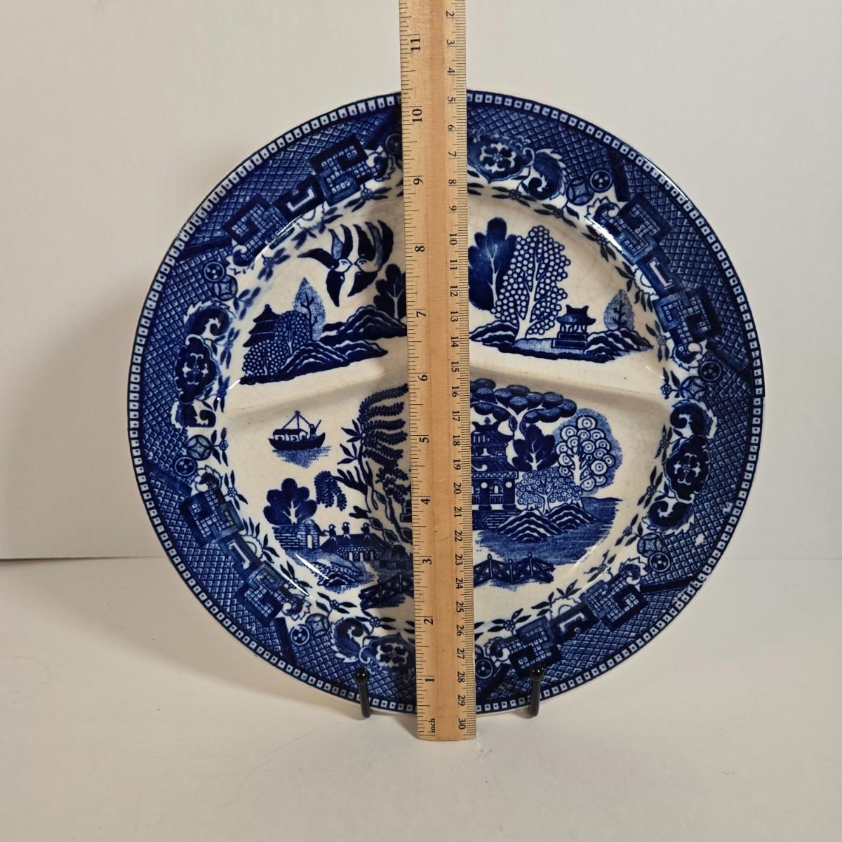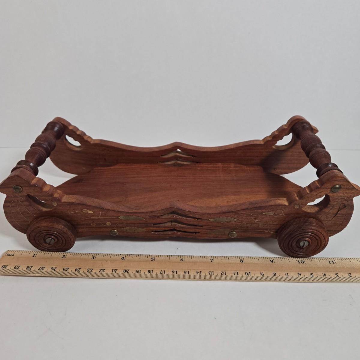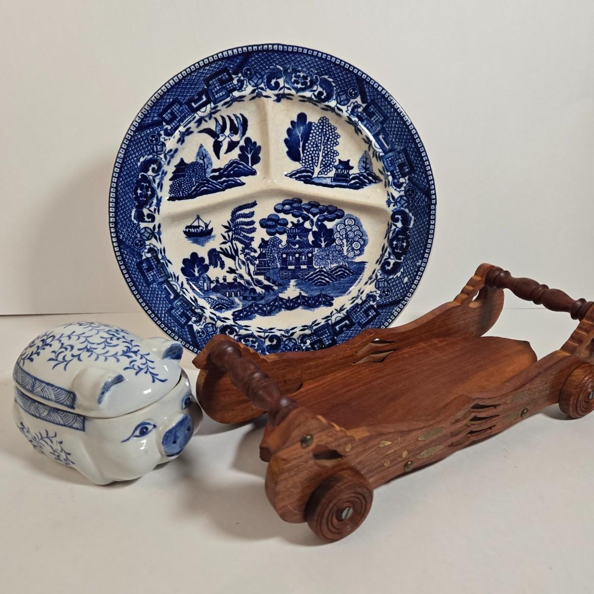 LOT 36D: Japan Blue Willow Divided Plate, Made in China Porcelain Trinket Box, and Wooden Wheeled Tray with Brass Inlay