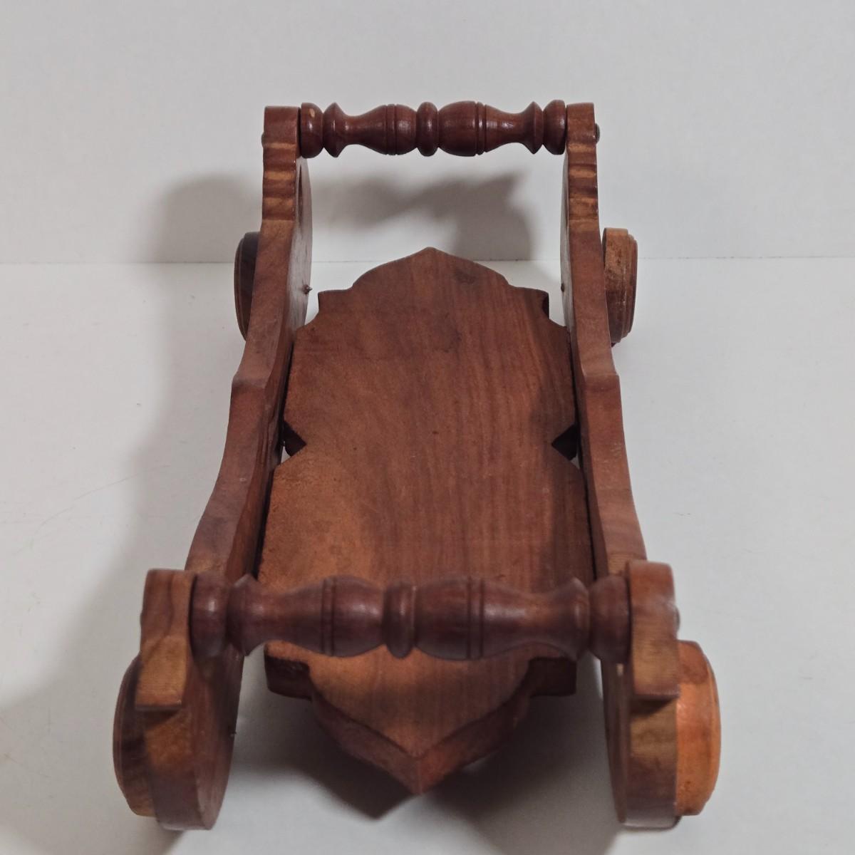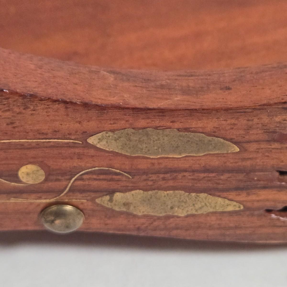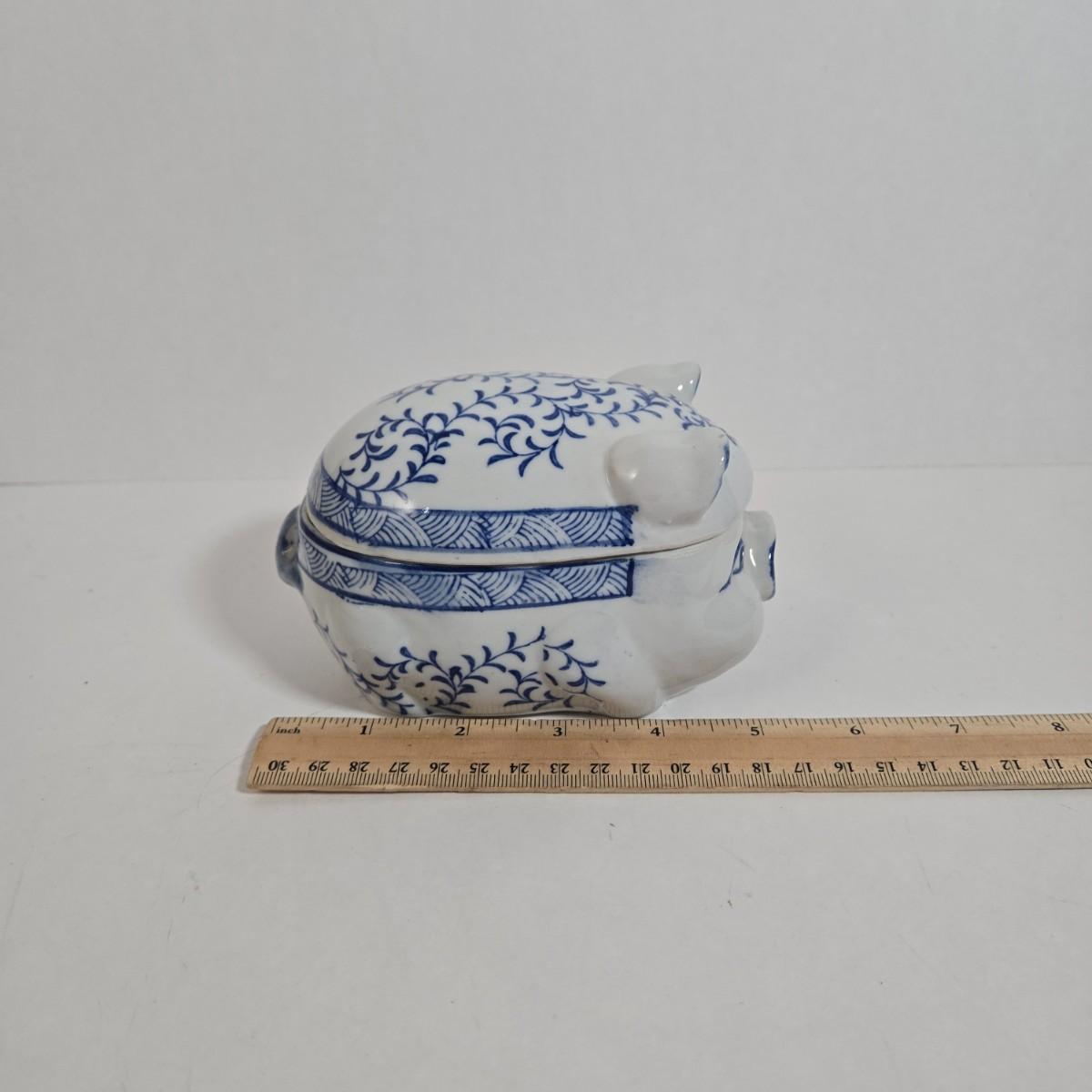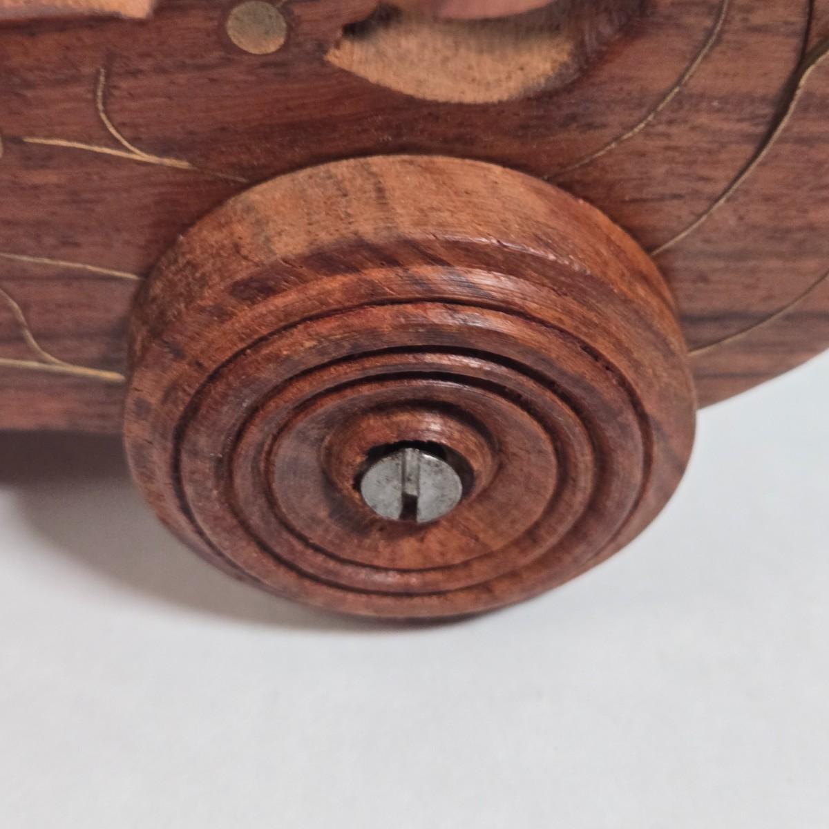 LOT 36D: Japan Blue Willow Divided Plate, Made in China Porcelain Trinket Box, and Wooden Wheeled Tray with Brass Inlay