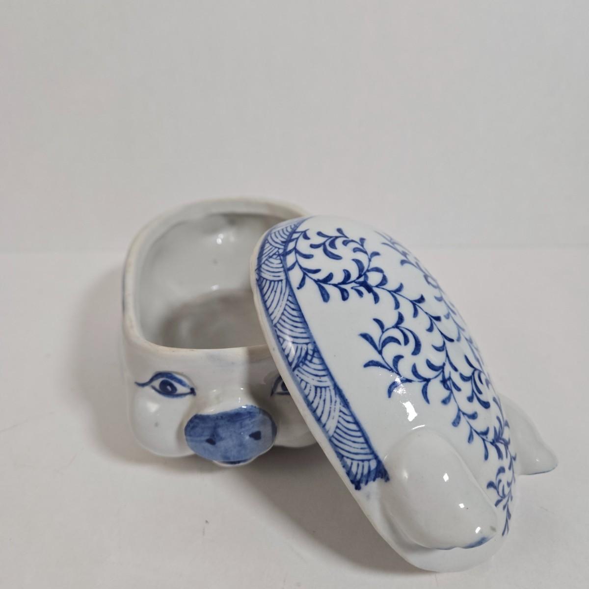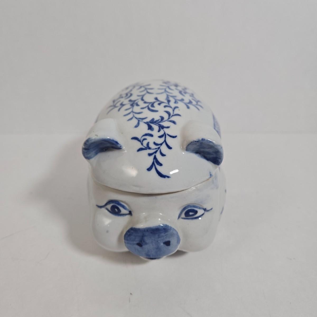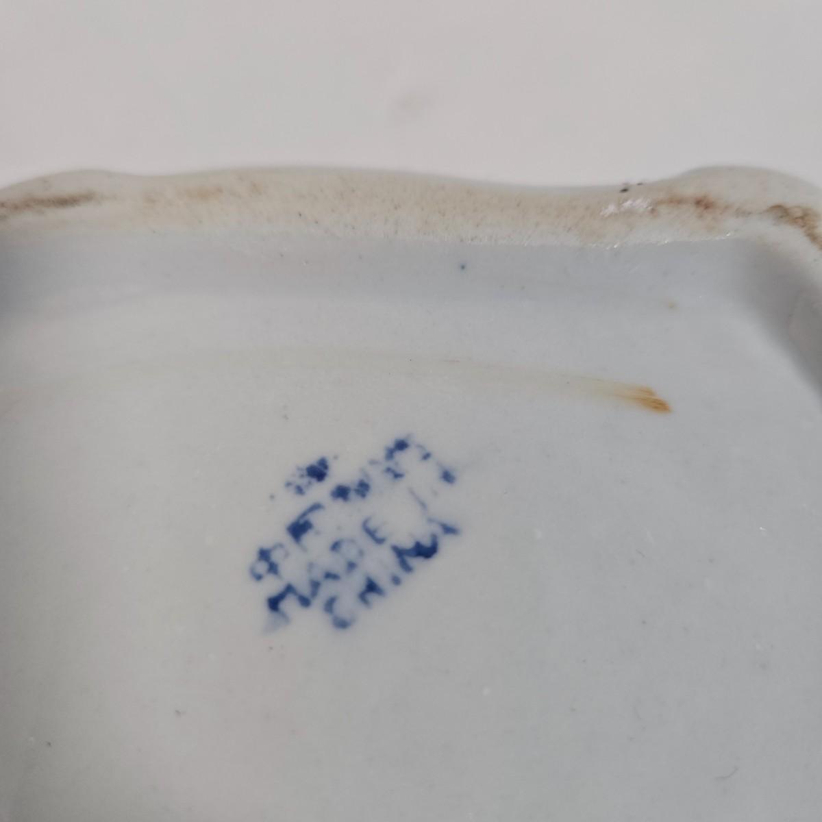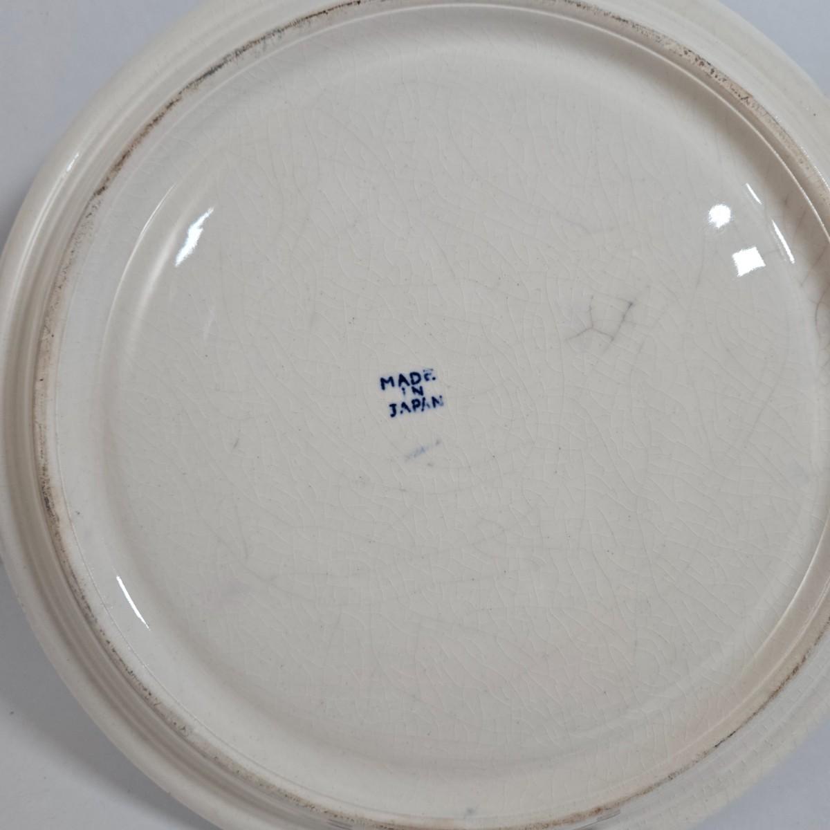 LOT 36D: Japan Blue Willow Divided Plate, Made in China Porcelain Trinket Box, and Wooden Wheeled Tray with Brass Inlay