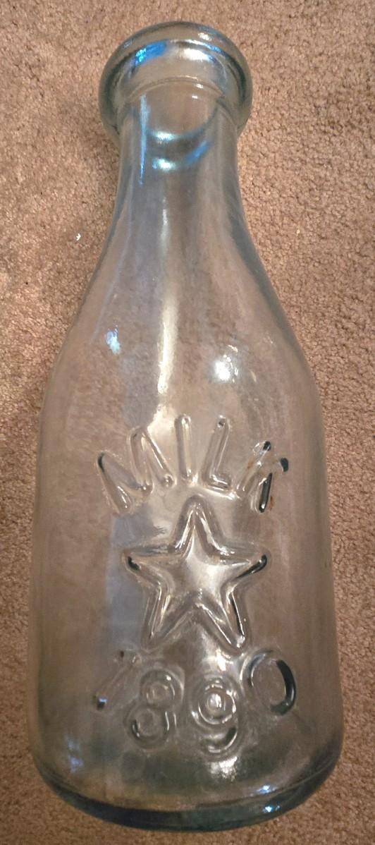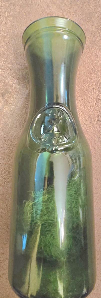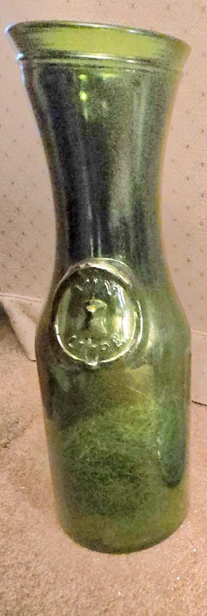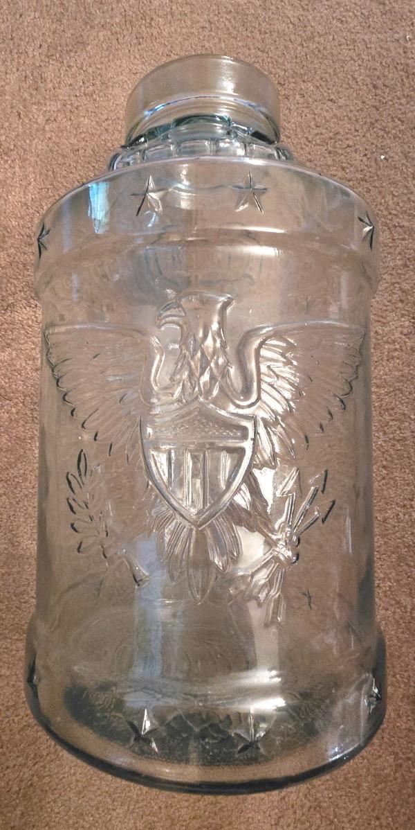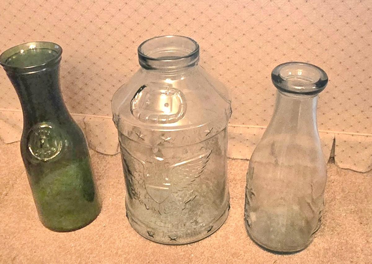 LOT 38D: Libbey Glass Bicentennial Eagle 5 Gallon Jug, Vintage Vin Litre Green Glass Decanter, and Cow and Star 1890 Milk Jug