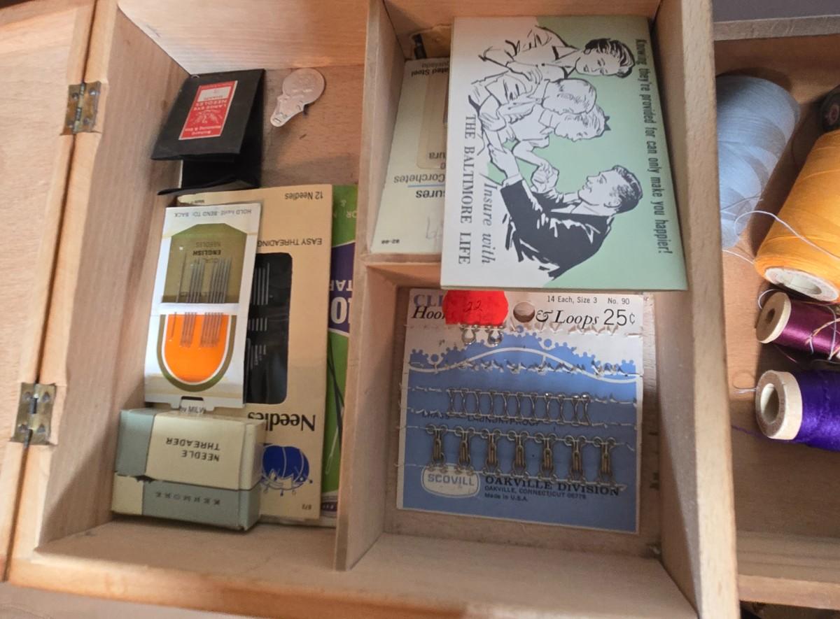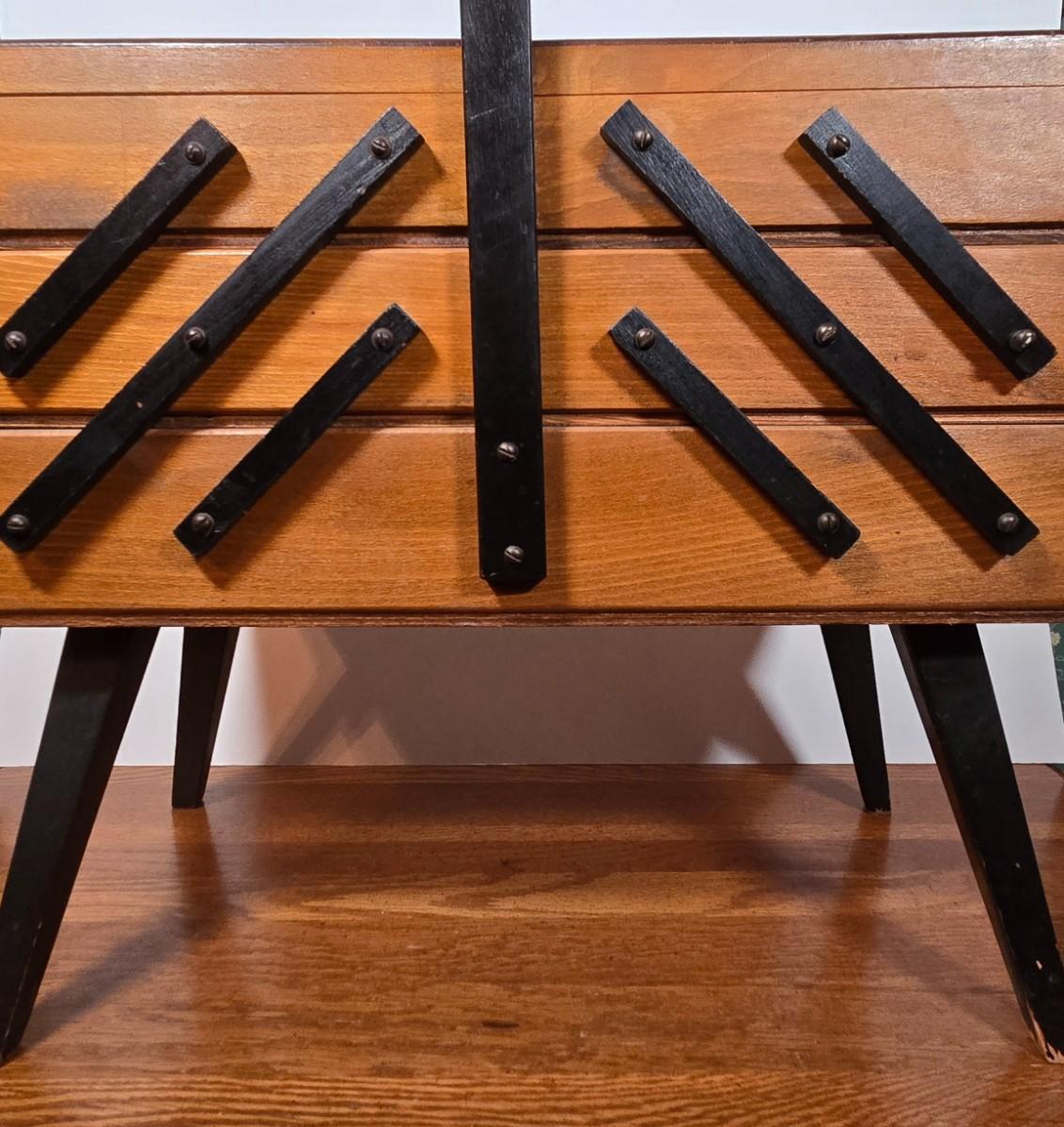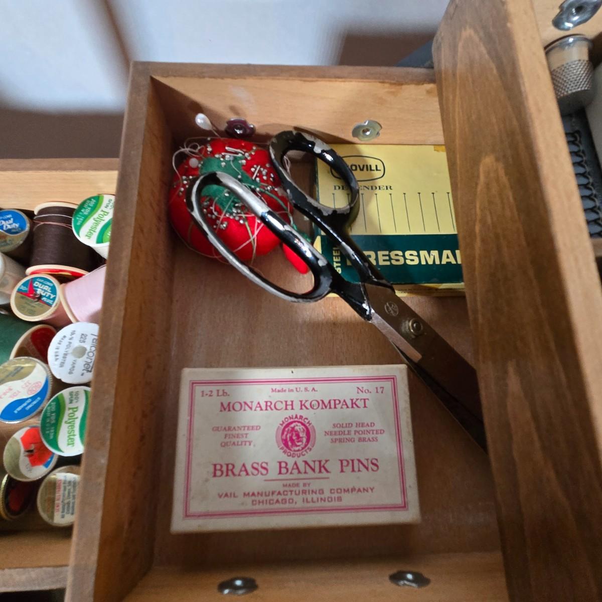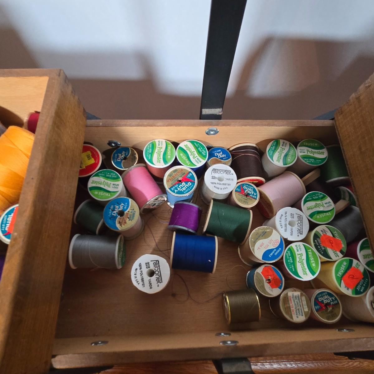 LOT 57X: Vintage Cantilever Sewing Box with Various Sewing Supplies