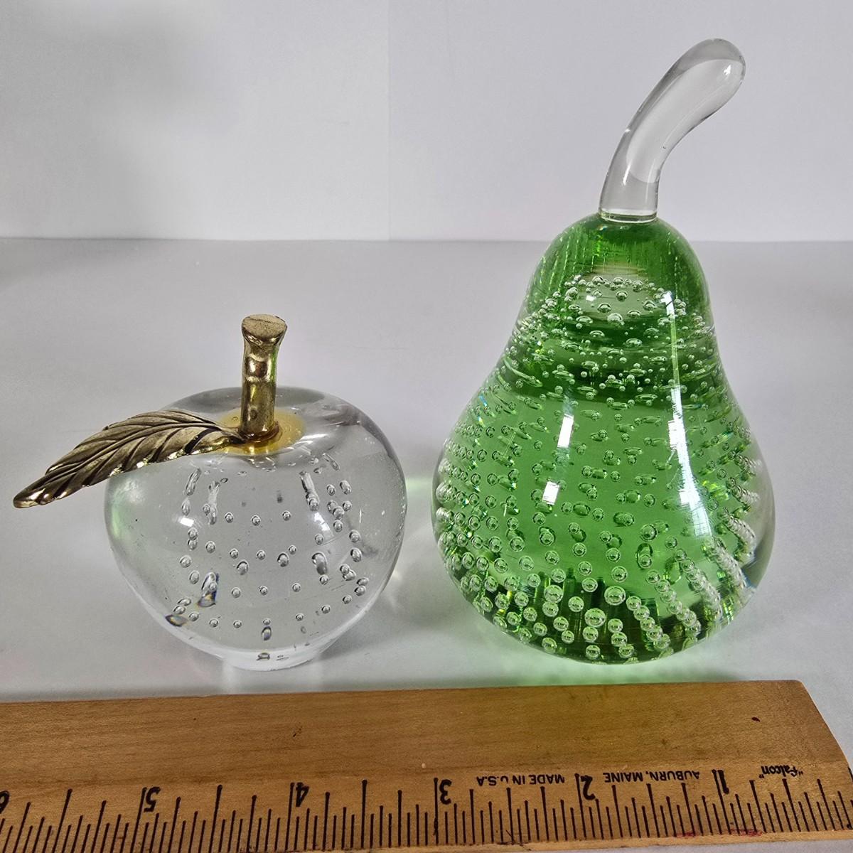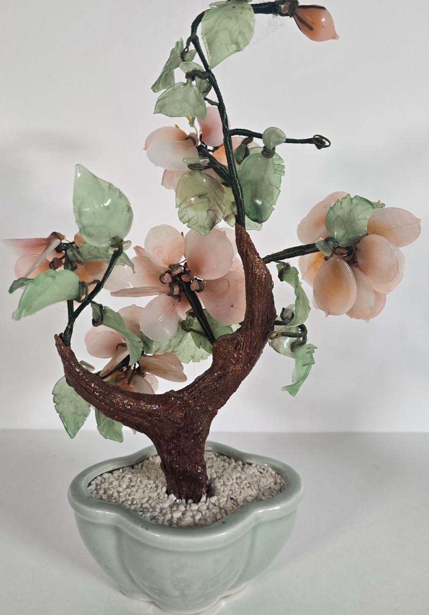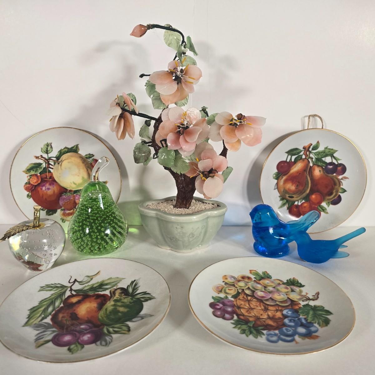 LOT 83L: Vintage "Jade" Glass Bonsai Tree, Decorative Plates, Blue Bird of Happiness and Apple & Pear Glass Paperweights
