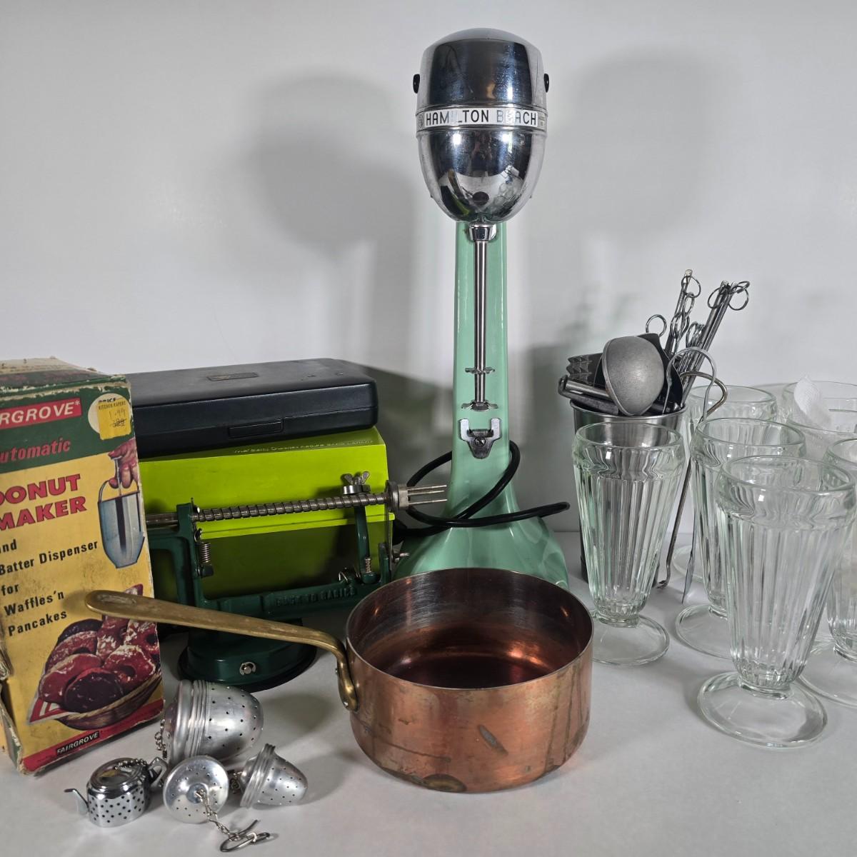 LOT 84L: Hamilton Beach Milkshake Mixer Model 30 with Retro Kitchen Gadgets and Betty Crocker Recipe Box
